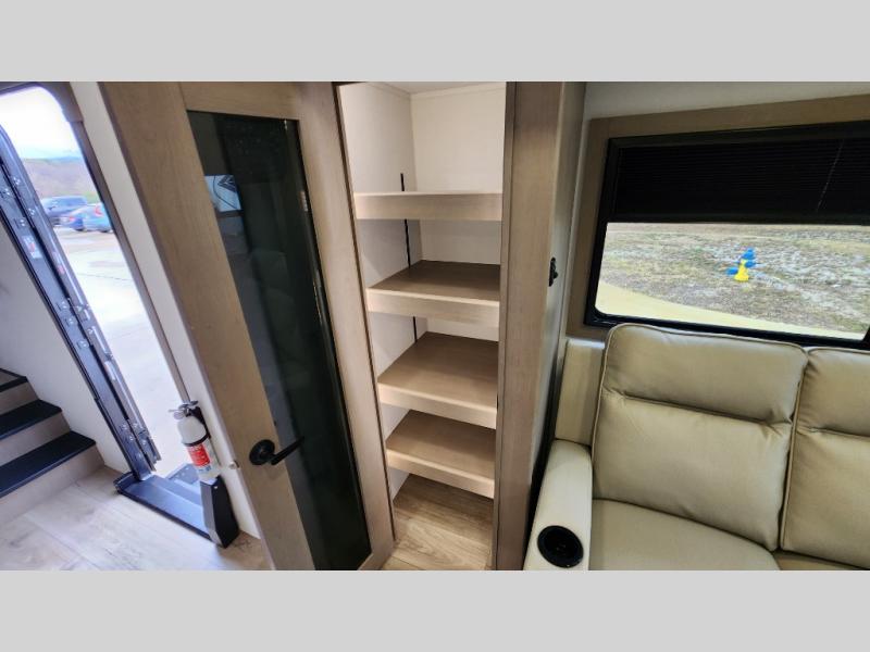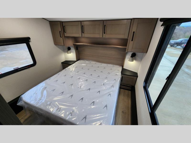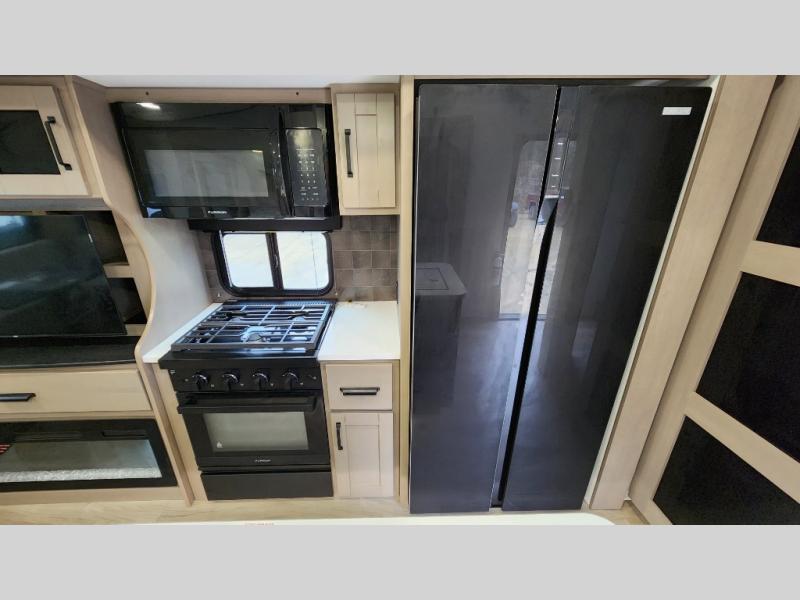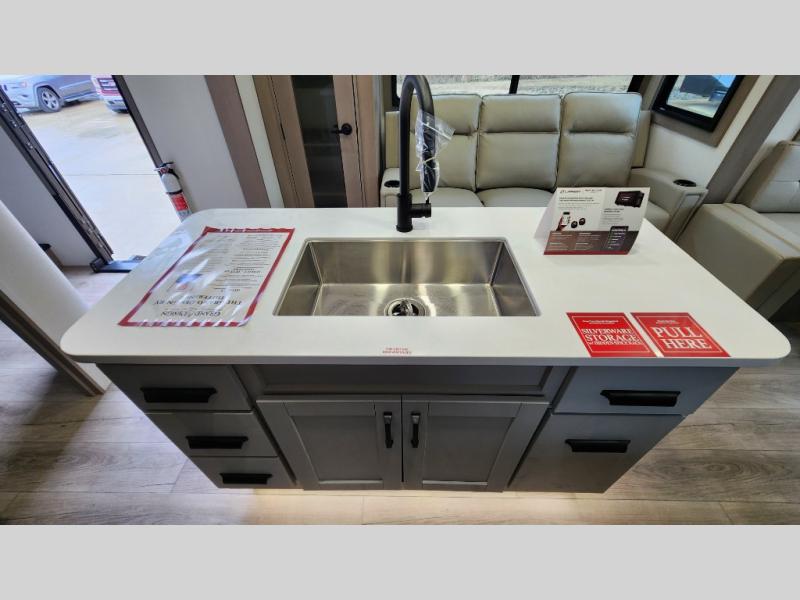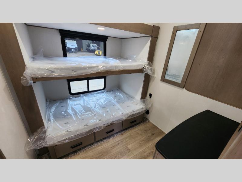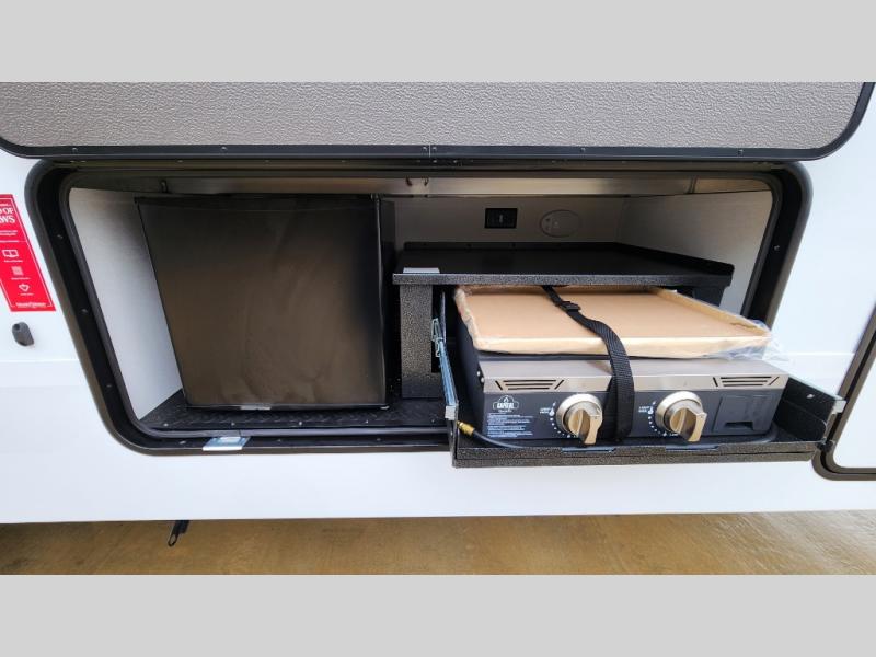When you are looking for a versatile extra room for either a second bedroom or living area as well as an office, this middle bunkhouse might just work! There is a slide out with two bunks and drawers plus a dresser. You can sleep like a queen on the walk-around bed in the front private bedroom that offers more clothing storage and windows for views. The rear main living and kitchen area provides plenty of seating on the a 78" triple person theater seats, and on the 92" U-shaped lounge with table with windows within the slide for natural lighting and great views. The kitchen island gives the cook more space to make and serve meals, and the gourmet kitchen includes a 16 cu. ft. refrigerator, plus a pantry for dry goods. There is an exterior outside kitchen with a griddle and a 1.6 cu. ft. refrigerator for beverages and such, plus you will find an LP quick connect, Coax TV hookup, and a spray port to wash off your dirty shoes.