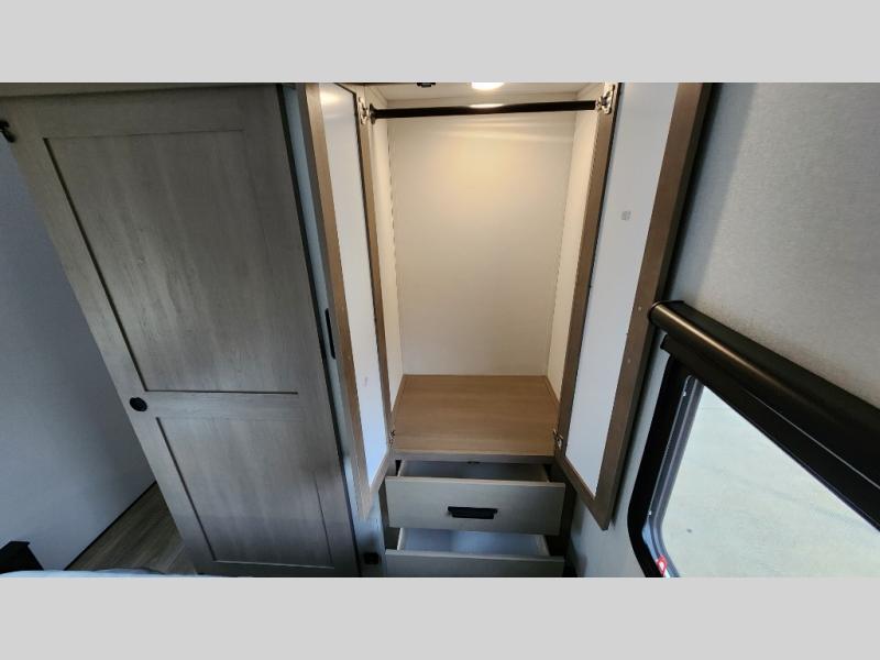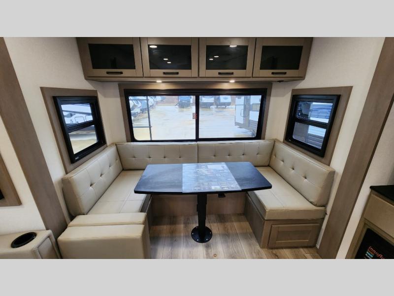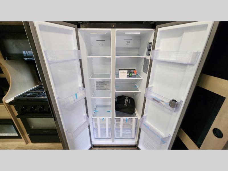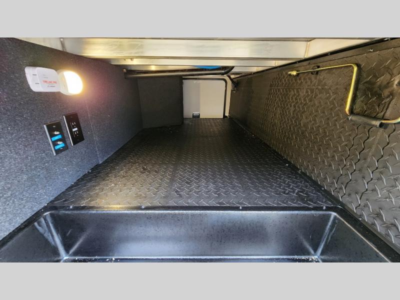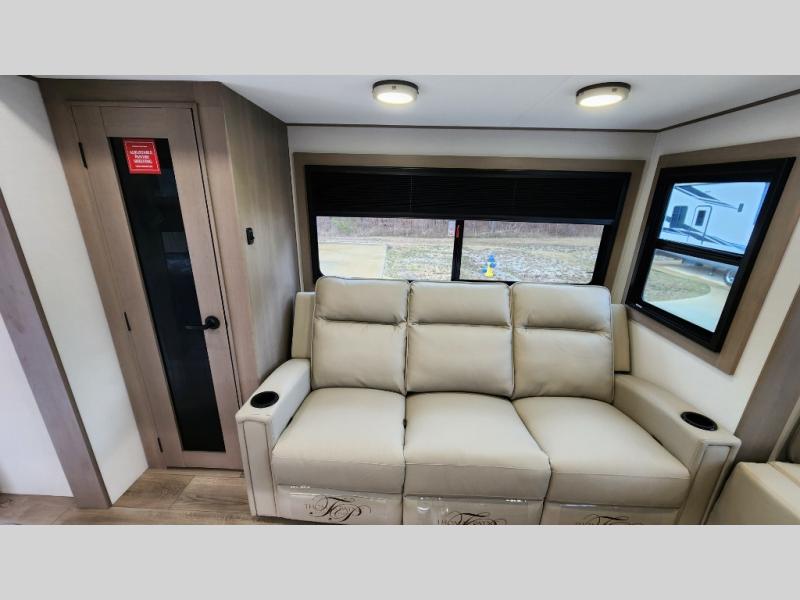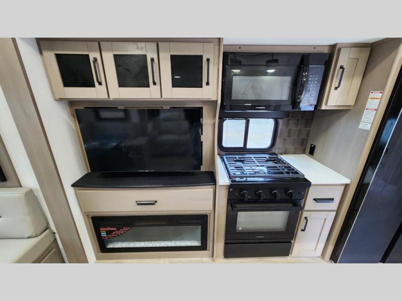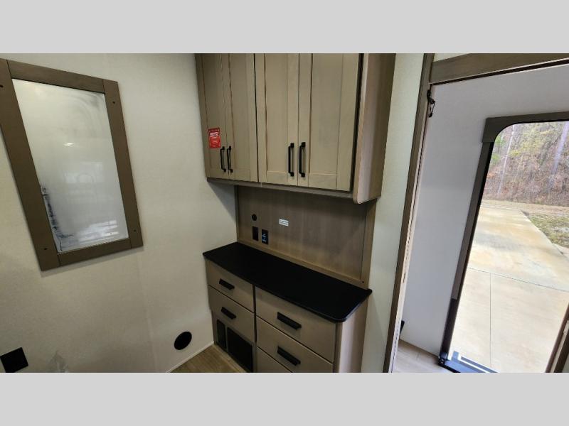 When you are looking for a versatile extra room for either a second bedroom or living area as well as an office, this middle bunkhouse might just work! There is a slide out with two bunks and drawers plus a dresser. You can sleep like a queen on the walk-around bed in the front private bedroom that offers more clothing storage and windows for views. The rear main living and kitchen area provides plenty of seating on the a 78" triple person theater seats, and on the 92" U-shaped lounge with table with windows within the slide for natural lighting and great views. The kitchen island gives the cook more space to make and serve meals, and the gourmet kitchen includes a 16 cu. ft. refrigerator, plus a pantry for dry goods. There is an exterior outside kitchen with a griddle and a 1.6 cu. ft. refrigerator for beverages and such, plus you will find an LP quick connect, Coax TV hookup, and a spray port to wash off your dirty shoes.