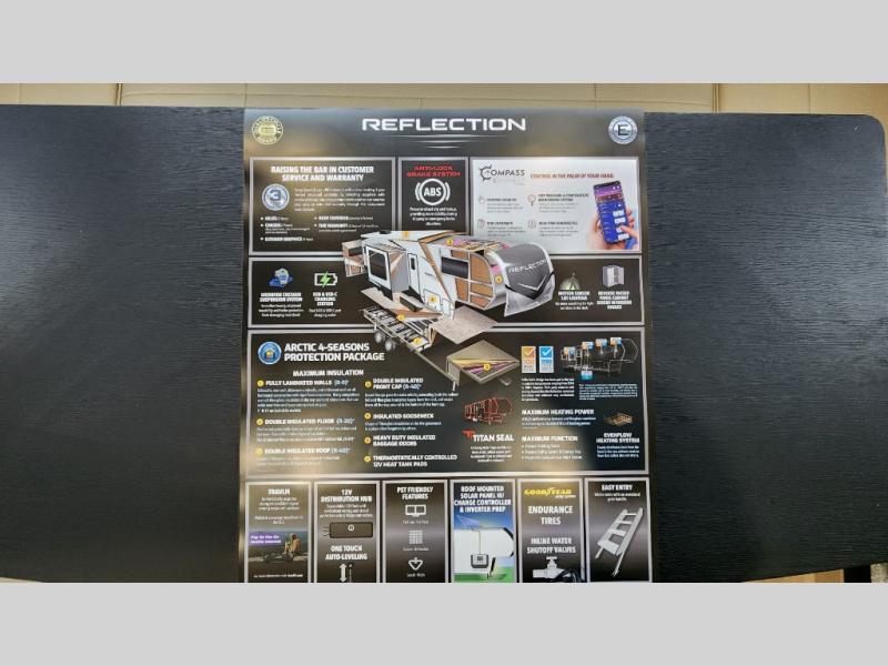 With any Reflection fifth wheel by Grand Design, you will have a solar panel for off-grid camping and a 60 amp charge controller and inverter prep, a Universal All-In-One docking station, unobstructed pass-through storage, and Goodyear Endurance tires. Each is constructed of gel coat exterior sidewalls, residential 5" truss rafters, walk-on roof decking, a fiberglass and radiant foil roof and front cap insulation plus laminated aluminum framed side walls, roof and end walls in slide rooms. Head inside to enjoy residential hardwood cabinet doors, premium Congoleum flooring, a spacious shower with a glass door, and many more comforts!