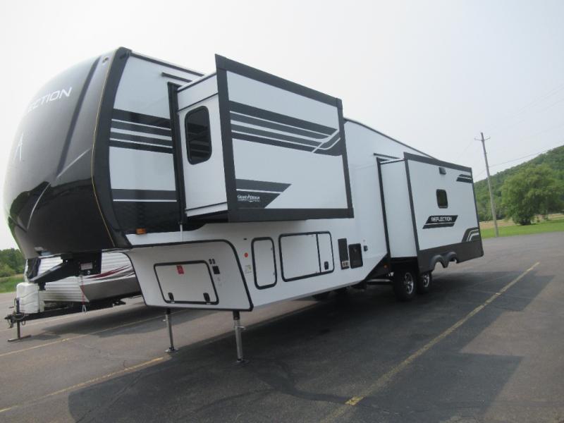 With any Reflection fifth wheel by Grand Design, you will have a solar panel for off-grid camping and a 60 amp charge controller and inverter prep, a Universal All-In-One docking station, unobstructed pass-through storage, and Goodyear Endurance tires. Each is constructed of gel coat exterior sidewalls, residential 5" truss rafters, walk-on roof decking, a fiberglass and radiant foil roof and front cap insulation plus laminated aluminum framed side walls, roof and end walls in slide rooms. Head inside to enjoy residential hardwood cabinet doors, premium Congoleum flooring, a spacious shower with a glass door, and many more comforts!
