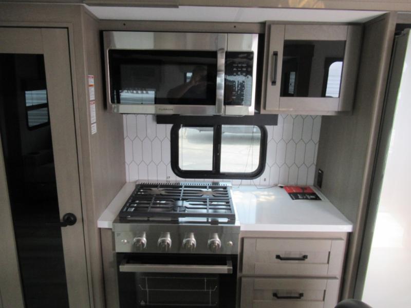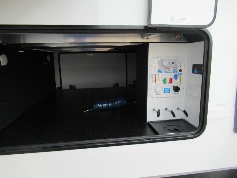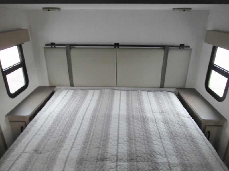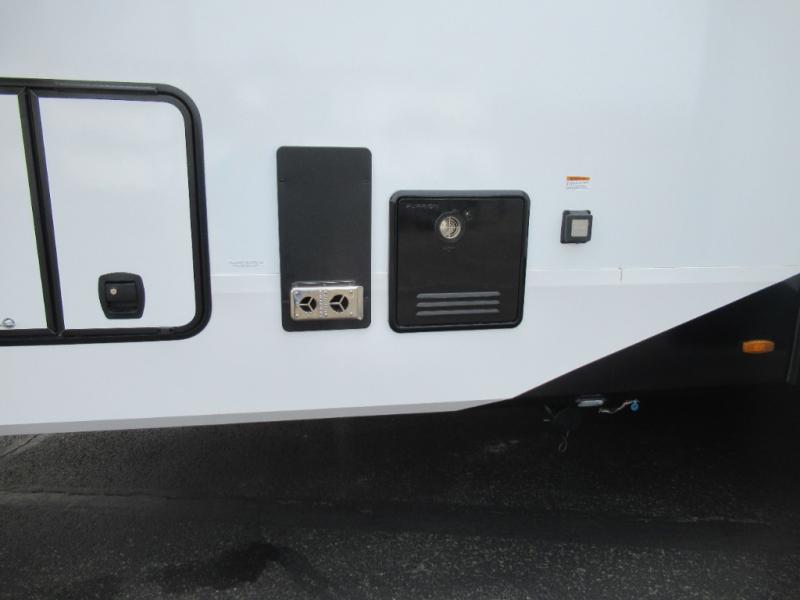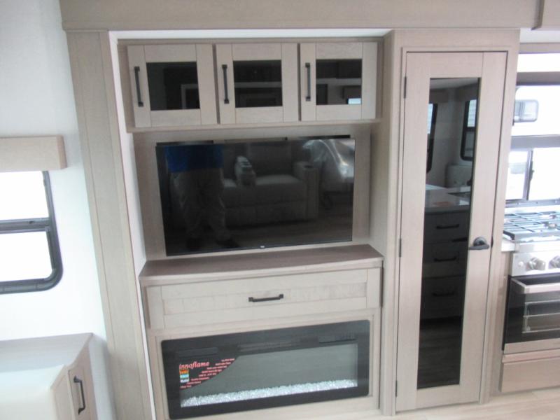 You can enjoy a spacious rear living area in this RV with dual opposing slides offering you entertainment, kitchen amenities, seating and windows for great views! The rear tri-fold sofa also converts into extra sleeping space for an extra guest or two, just like the booth dinette does. Yet you might like to add the swivel dinette option. There are theater seats to enjoy while you place your drinks in the cupholders and watch the entertainment center with a 40" LED HDTV and fireplace. The pantry is big enough to store your favorite snacks, and the kitchen island will make meal prepping easier, plus there is a 16 cu. ft. refrigerator to store any leftovers. The full bathroom has a 30" x 48" fiberglass shower and a linen closet to store your towels. The front private bedroom has a comfortable queen bed slide that can be switched out for the optional king bed, a dresser with overhead cabinets, and a full wall wardrobe that is prepped to add the optional washer and dryer so that you can extend your camping trip with clean clothes!
