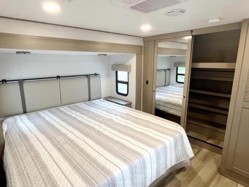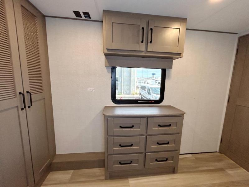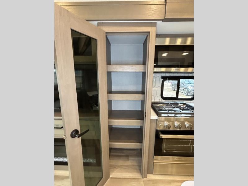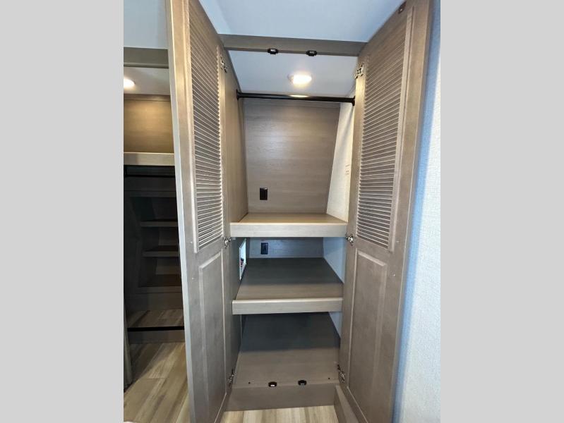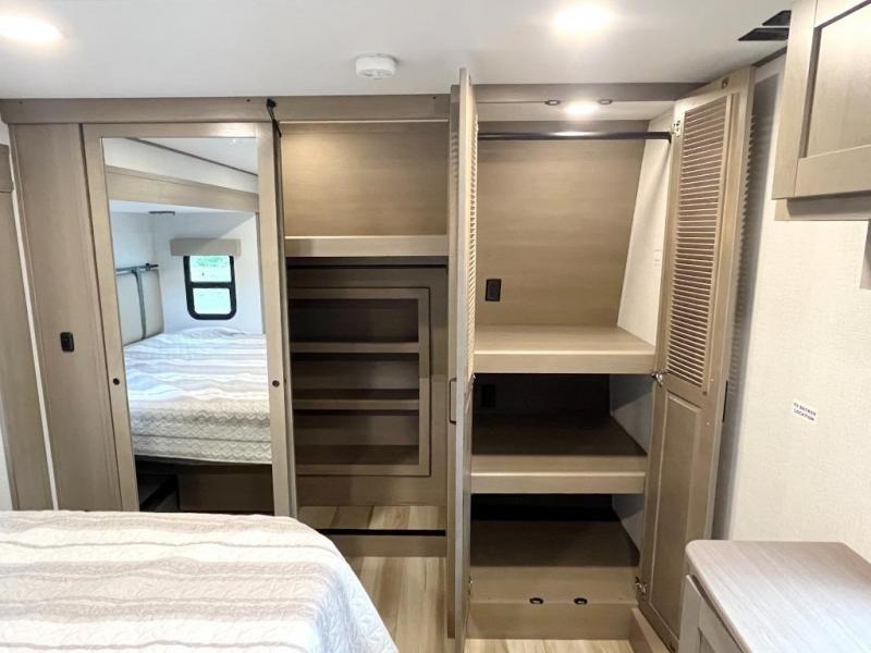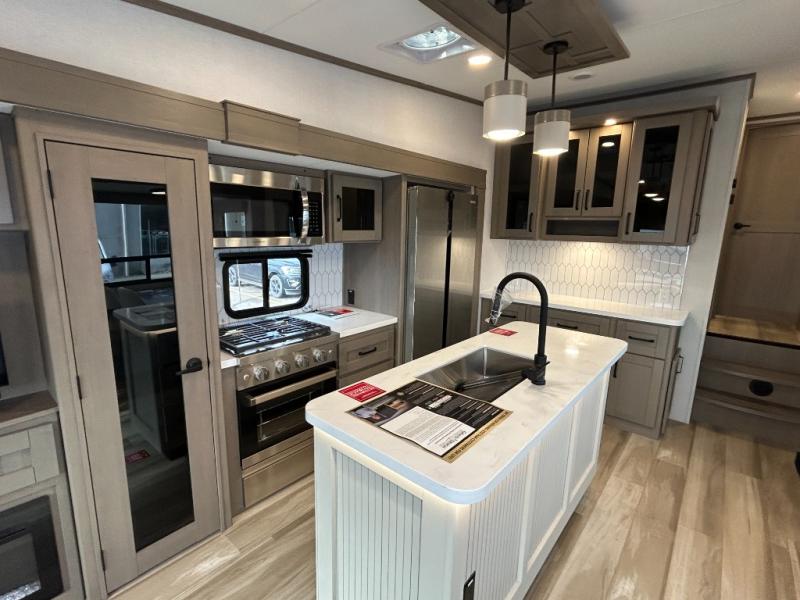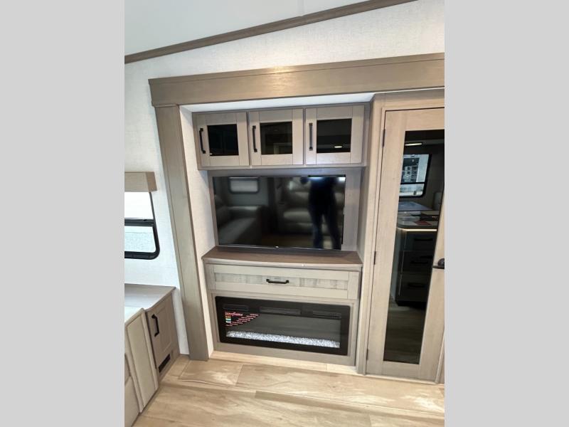 You can enjoy a spacious rear living area in this RV with dual opposing slides offering you entertainment, kitchen amenities, seating and windows for great views! The rear tri-fold sofa also converts into extra sleeping space for an extra guest or two, just like the booth dinette does. Yet you might like to add the swivel dinette option. There are theater seats to enjoy while you place your drinks in the cupholders and watch the entertainment center with a 40" LED HDTV and fireplace. The pantry is big enough to store your favorite snacks, and the kitchen island will make meal prepping easier, plus there is a 16 cu. ft. refrigerator to store any leftovers. The full bathroom has a 30" x 48" fiberglass shower and a linen closet to store your towels. The front private bedroom has a comfortable queen bed slide that can be switched out for the optional king bed, a dresser with overhead cabinets, and a full wall wardrobe that is prepped to add the optional washer and dryer so that you can extend your camping trip with clean clothes!