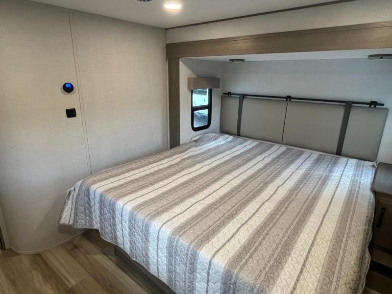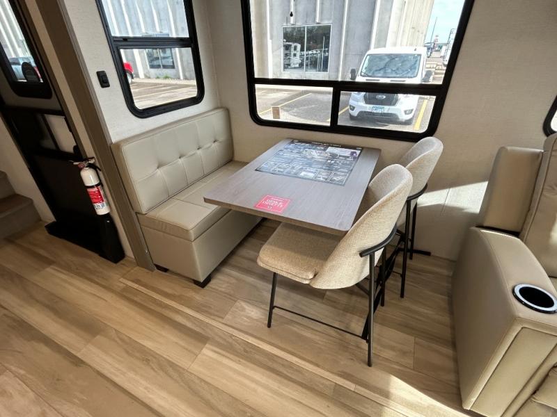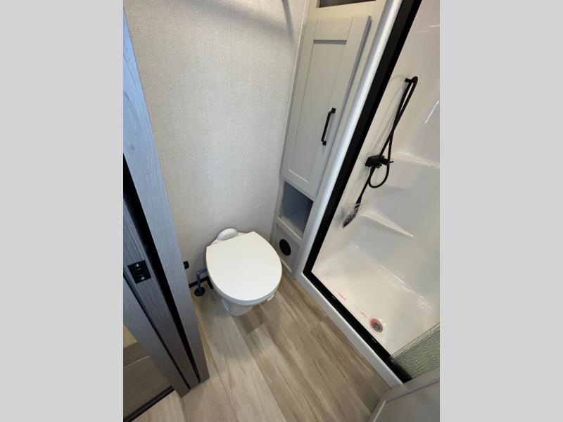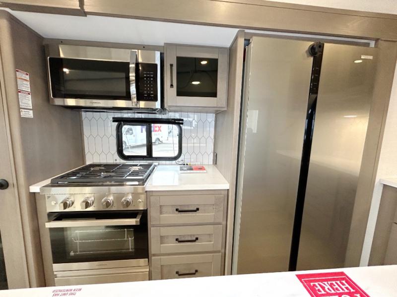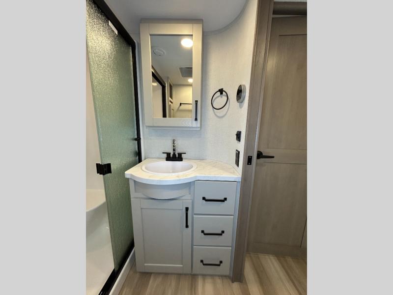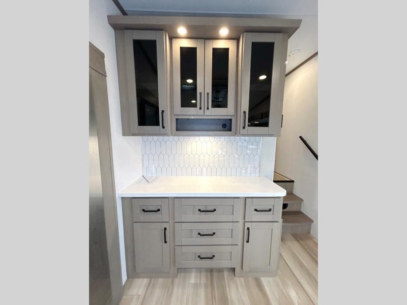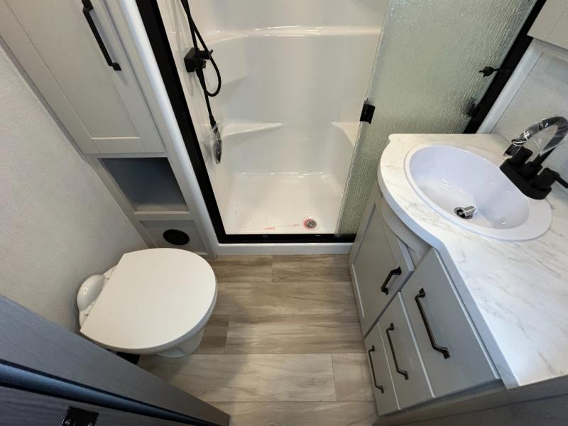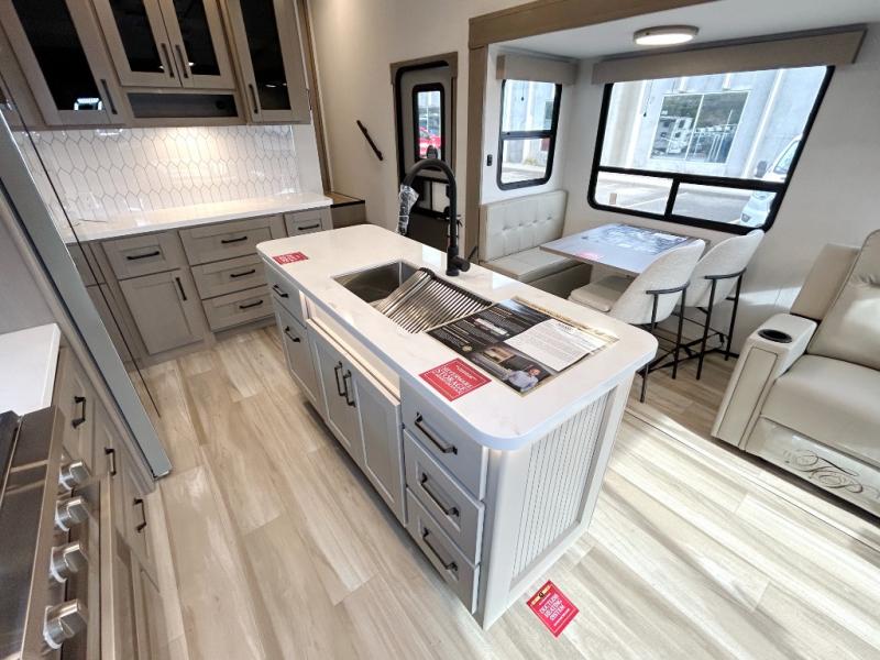 You can enjoy a spacious rear living area in this RV with dual opposing slides offering you entertainment, kitchen amenities, seating and windows for great views! The rear tri-fold sofa also converts into extra sleeping space for an extra guest or two, just like the booth dinette does. Yet you might like to add the swivel dinette option. There are theater seats to enjoy while you place your drinks in the cupholders and watch the entertainment center with a 40" LED HDTV and fireplace. The pantry is big enough to store your favorite snacks, and the kitchen island will make meal prepping easier, plus there is a 16 cu. ft. refrigerator to store any leftovers. The full bathroom has a 30" x 48" fiberglass shower and a linen closet to store your towels. The front private bedroom has a comfortable queen bed slide that can be switched out for the optional king bed, a dresser with overhead cabinets, and a full wall wardrobe that is prepped to add the optional washer and dryer so that you can extend your camping trip with clean clothes!