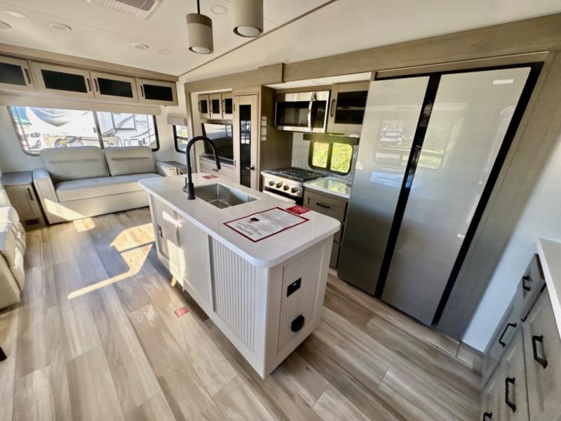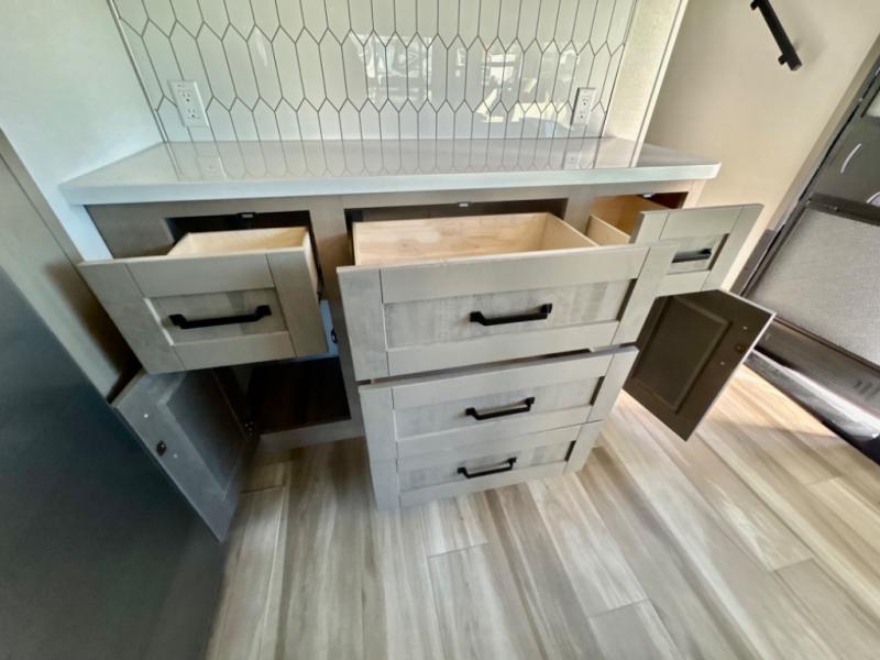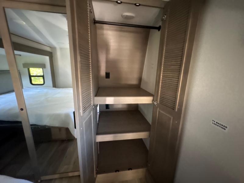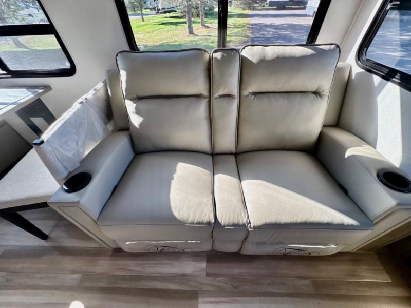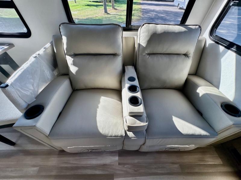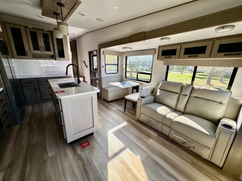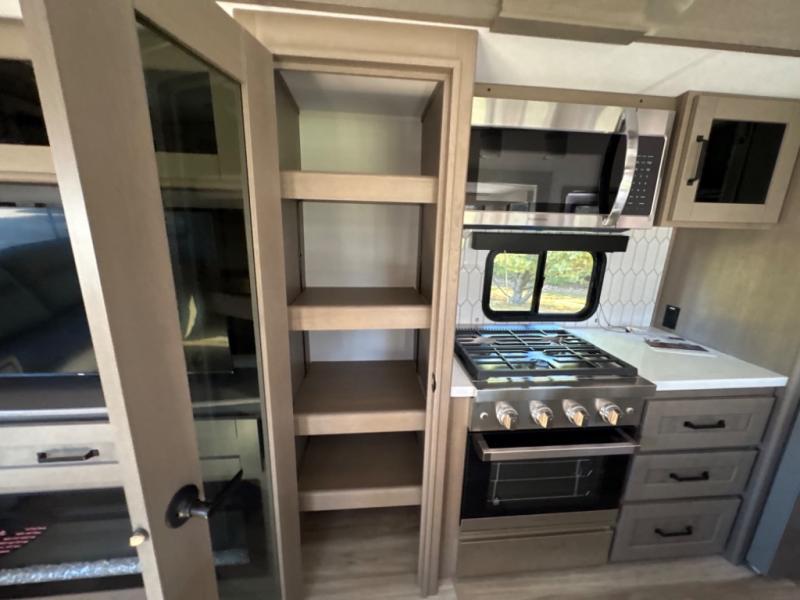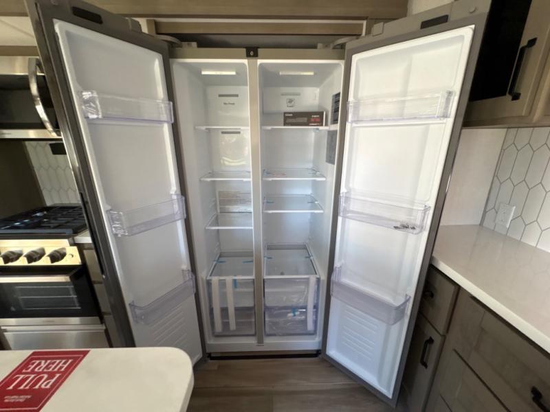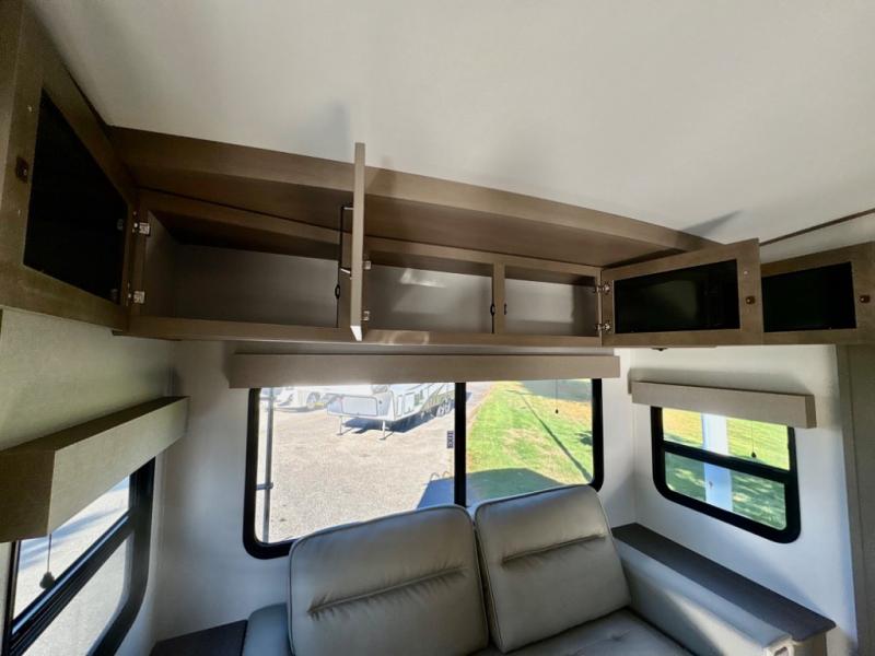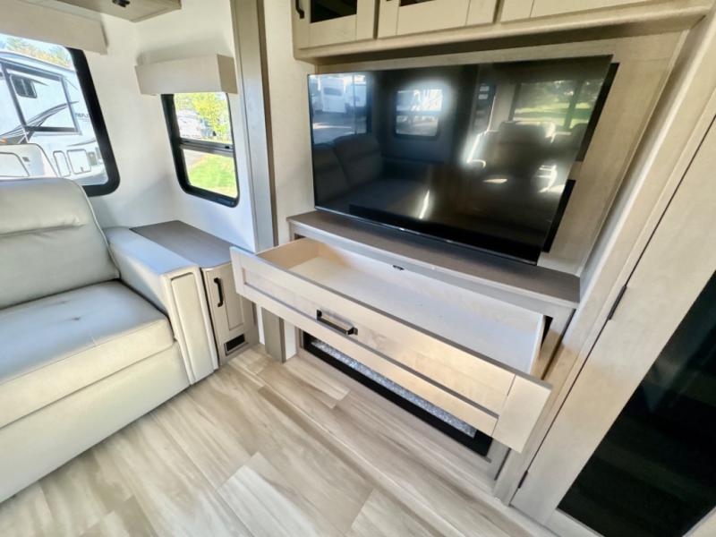 You can enjoy a spacious rear living area in this RV with dual opposing slides offering you entertainment, kitchen amenities, seating and windows for great views! The rear tri-fold sofa also converts into extra sleeping space for an extra guest or two, just like the booth dinette does. Yet you might like to add the swivel dinette option. There are theater seats to enjoy while you place your drinks in the cupholders and watch the entertainment center with a 40" LED HDTV and fireplace. The pantry is big enough to store your favorite snacks, and the kitchen island will make meal prepping easier, plus there is a 16 cu. ft. refrigerator to store any leftovers. The full bathroom has a 30" x 48" fiberglass shower and a linen closet to store your towels. The front private bedroom has a comfortable queen bed slide that can be switched out for the optional king bed, a dresser with overhead cabinets, and a full wall wardrobe that is prepped to add the optional washer and dryer so that you can extend your camping trip with clean clothes!