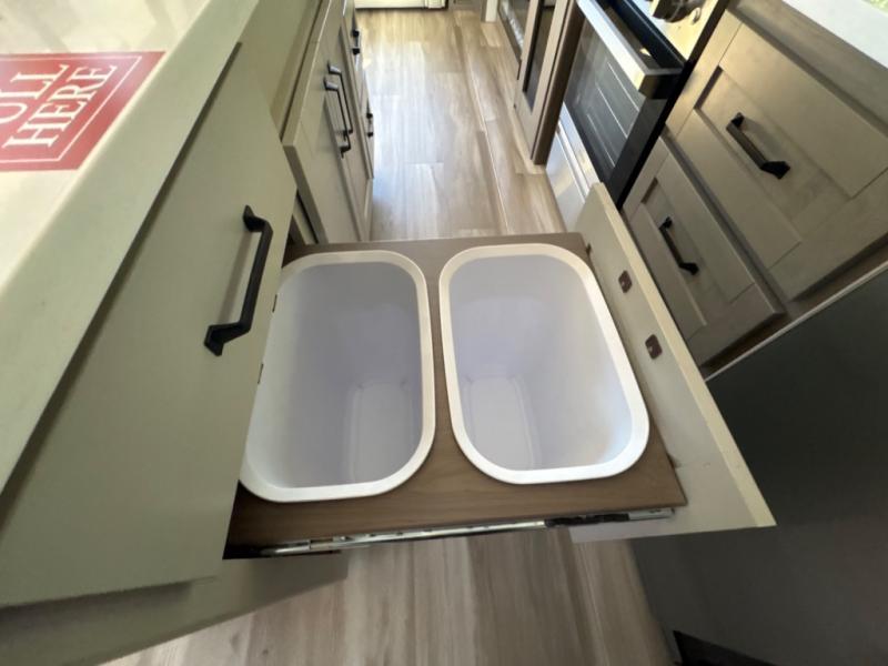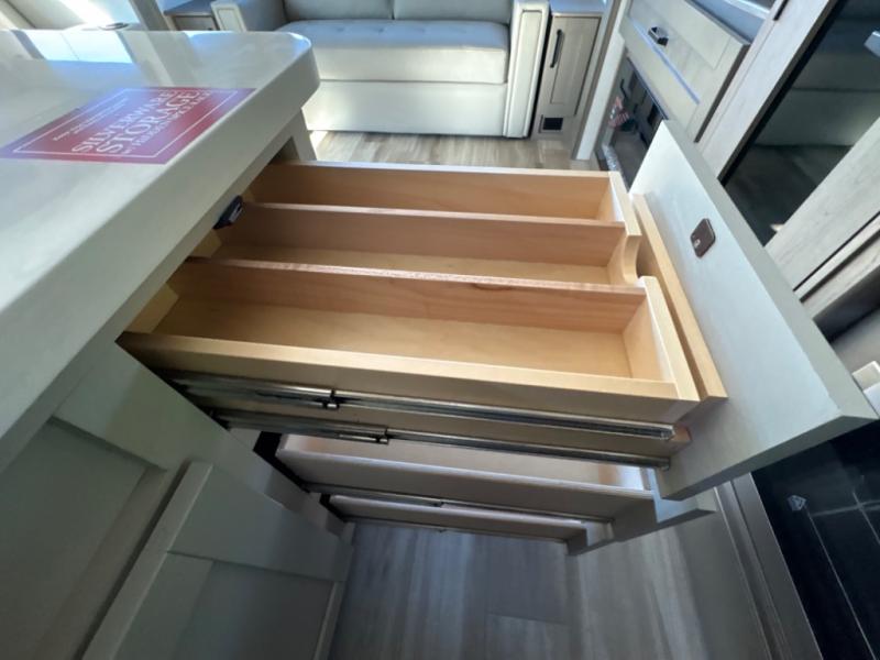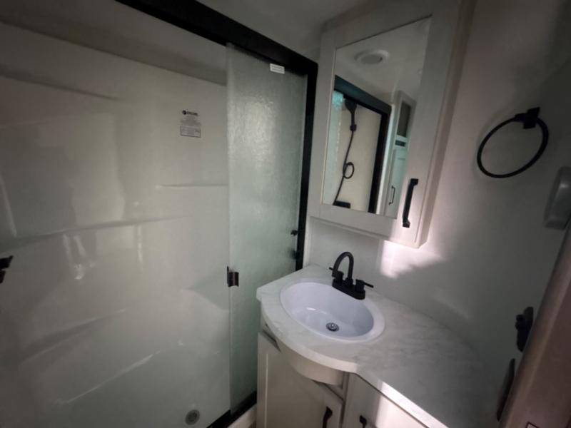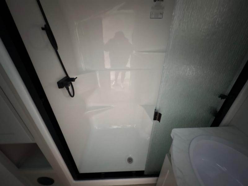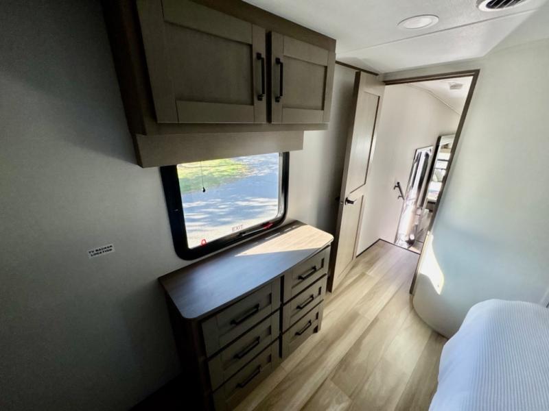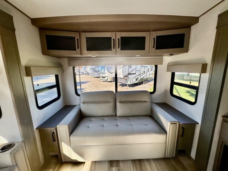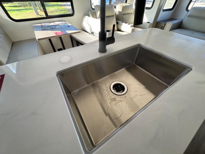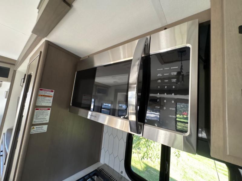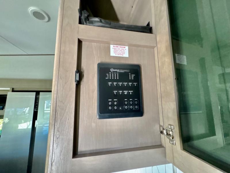 You can enjoy a spacious rear living area in this RV with dual opposing slides offering you entertainment, kitchen amenities, seating and windows for great views! The rear tri-fold sofa also converts into extra sleeping space for an extra guest or two, just like the booth dinette does. Yet you might like to add the swivel dinette option. There are theater seats to enjoy while you place your drinks in the cupholders and watch the entertainment center with a 40" LED HDTV and fireplace. The pantry is big enough to store your favorite snacks, and the kitchen island will make meal prepping easier, plus there is a 16 cu. ft. refrigerator to store any leftovers. The full bathroom has a 30" x 48" fiberglass shower and a linen closet to store your towels. The front private bedroom has a comfortable queen bed slide that can be switched out for the optional king bed, a dresser with overhead cabinets, and a full wall wardrobe that is prepped to add the optional washer and dryer so that you can extend your camping trip with clean clothes!