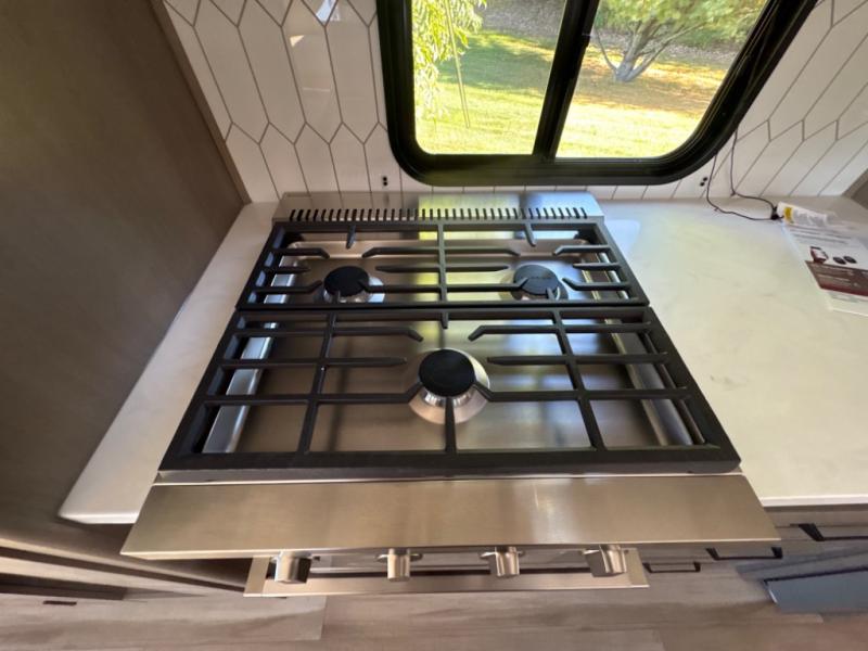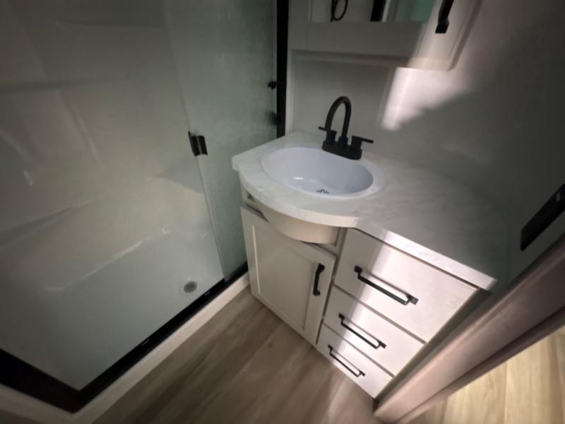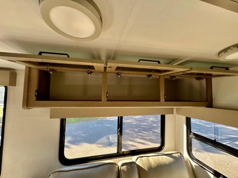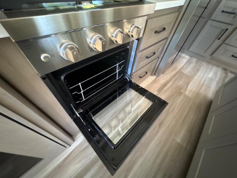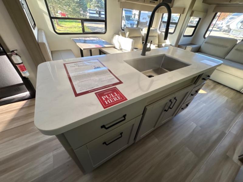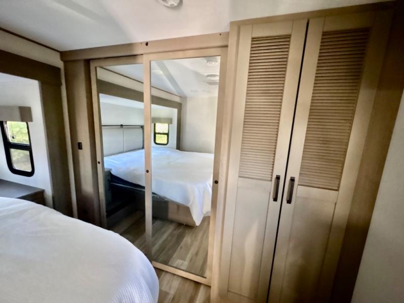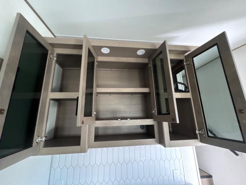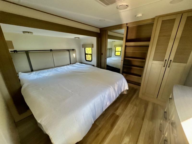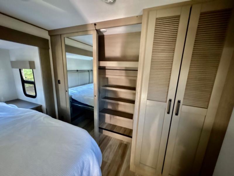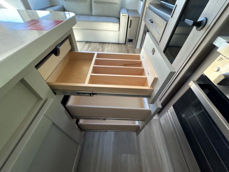 You can enjoy a spacious rear living area in this RV with dual opposing slides offering you entertainment, kitchen amenities, seating and windows for great views! The rear tri-fold sofa also converts into extra sleeping space for an extra guest or two, just like the booth dinette does. Yet you might like to add the swivel dinette option. There are theater seats to enjoy while you place your drinks in the cupholders and watch the entertainment center with a 40" LED HDTV and fireplace. The pantry is big enough to store your favorite snacks, and the kitchen island will make meal prepping easier, plus there is a 16 cu. ft. refrigerator to store any leftovers. The full bathroom has a 30" x 48" fiberglass shower and a linen closet to store your towels. The front private bedroom has a comfortable queen bed slide that can be switched out for the optional king bed, a dresser with overhead cabinets, and a full wall wardrobe that is prepped to add the optional washer and dryer so that you can extend your camping trip with clean clothes!