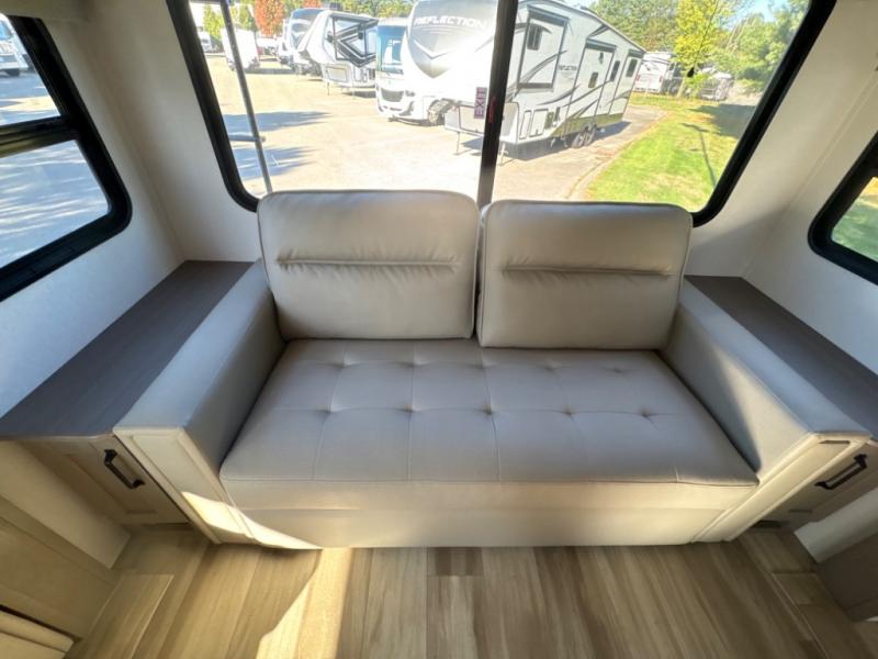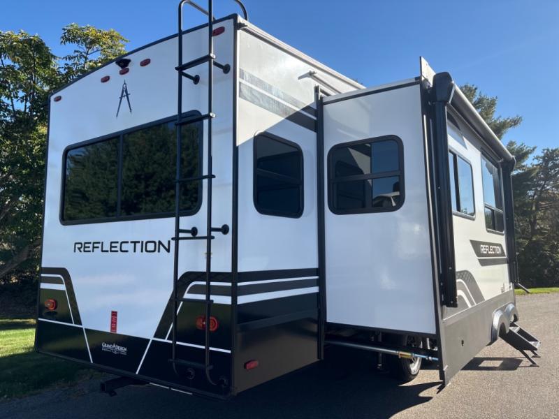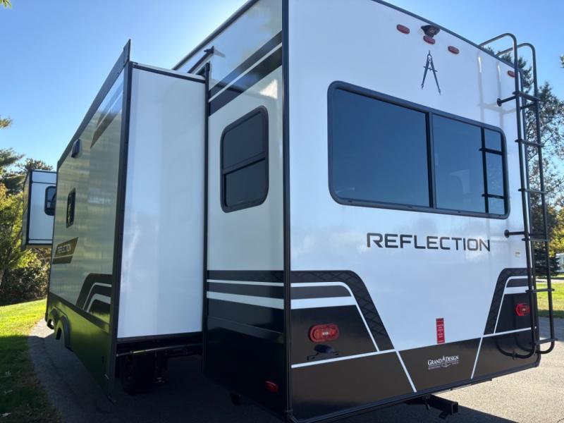 With any Reflection fifth wheel by Grand Design, you will have a solar panel for off-grid camping and a 60 amp charge controller and inverter prep, a Universal All-In-One docking station, unobstructed pass-through storage, and Goodyear Endurance tires. Each is constructed of gel coat exterior sidewalls, residential 5" truss rafters, walk-on roof decking, a fiberglass and radiant foil roof and front cap insulation plus laminated aluminum framed side walls, roof and end walls in slide rooms. Head inside to enjoy residential hardwood cabinet doors, premium Congoleum flooring, a spacious shower with a glass door, and many more comforts!