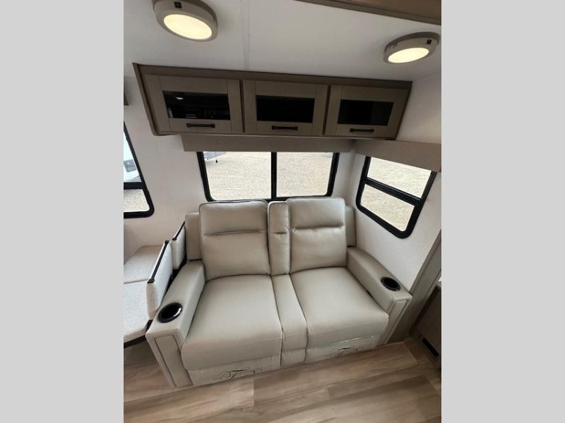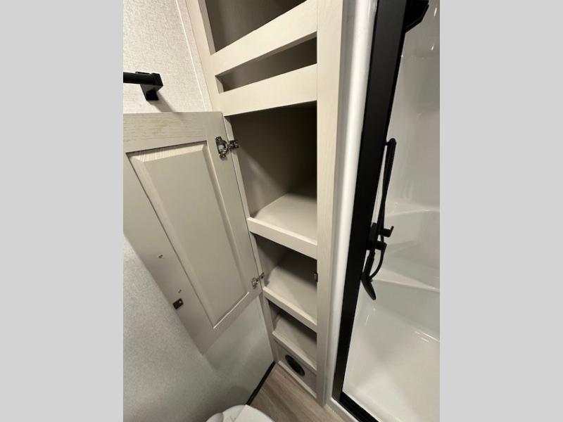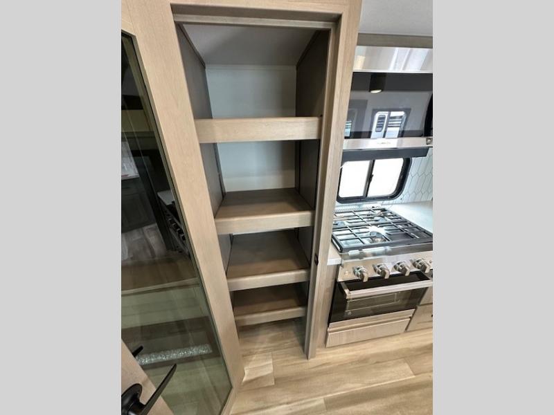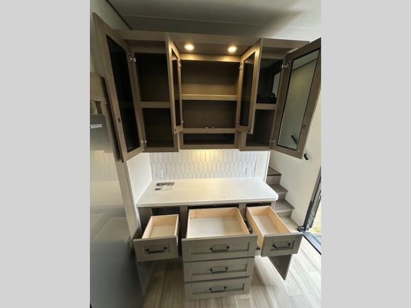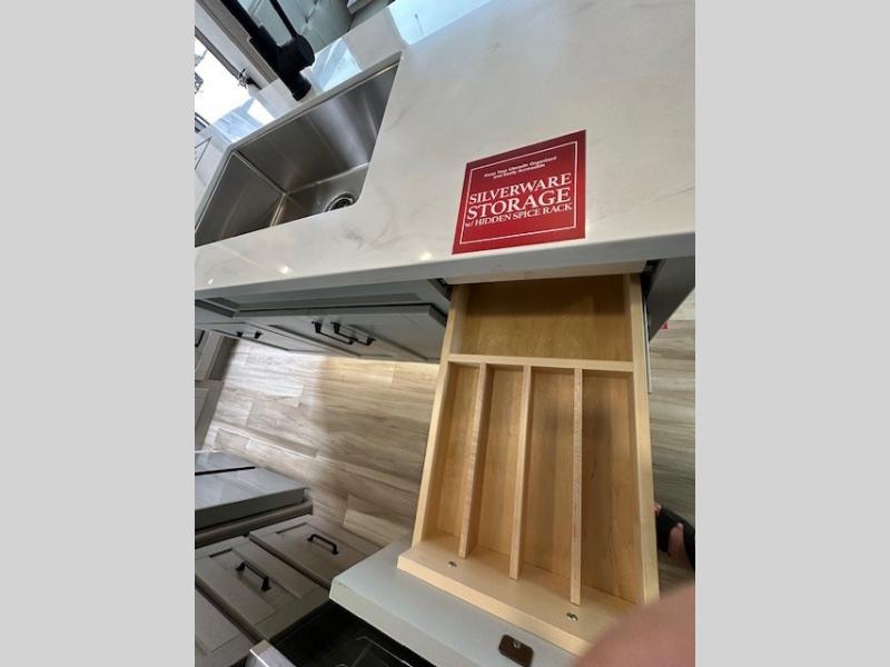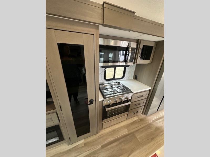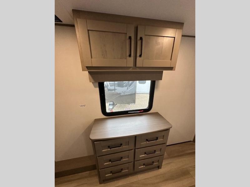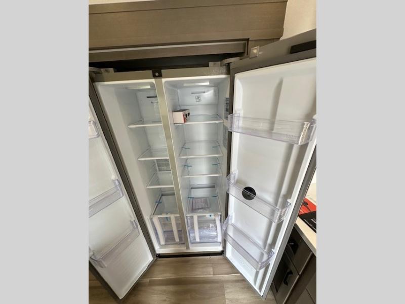 You can enjoy a spacious rear living area in this RV with dual opposing slides offering you entertainment, kitchen amenities, seating and windows for great views! The rear tri-fold sofa also converts into extra sleeping space for an extra guest or two, just like the booth dinette does. Yet you might like to add the swivel dinette option. There are theater seats to enjoy while you place your drinks in the cupholders and watch the entertainment center with a 40" LED HDTV and fireplace. The pantry is big enough to store your favorite snacks, and the kitchen island will make meal prepping easier, plus there is a 16 cu. ft. refrigerator to store any leftovers. The full bathroom has a 30" x 48" fiberglass shower and a linen closet to store your towels. The front private bedroom has a comfortable queen bed slide that can be switched out for the optional king bed, a dresser with overhead cabinets, and a full wall wardrobe that is prepped to add the optional washer and dryer so that you can extend your camping trip with clean clothes!