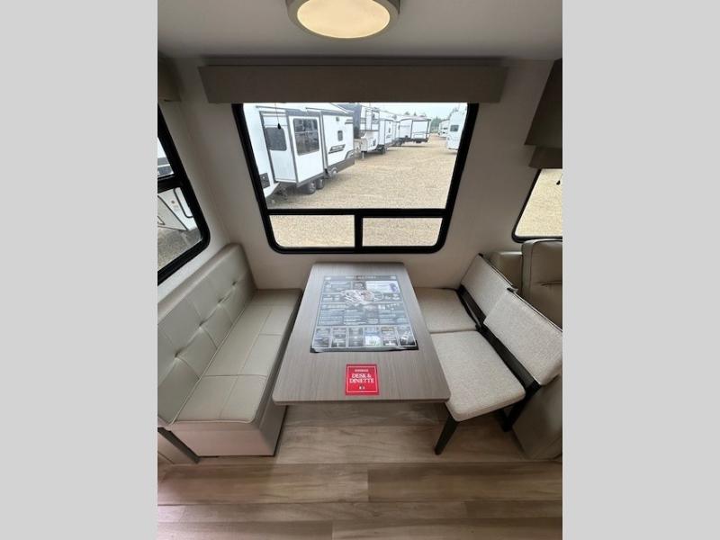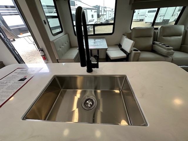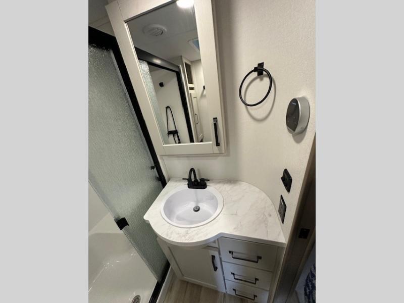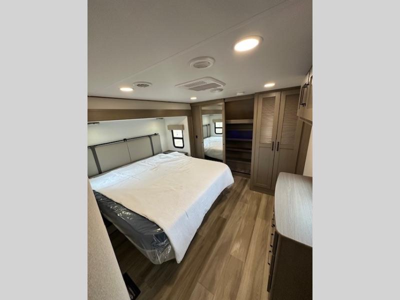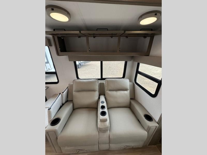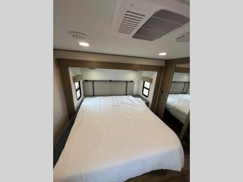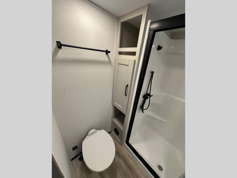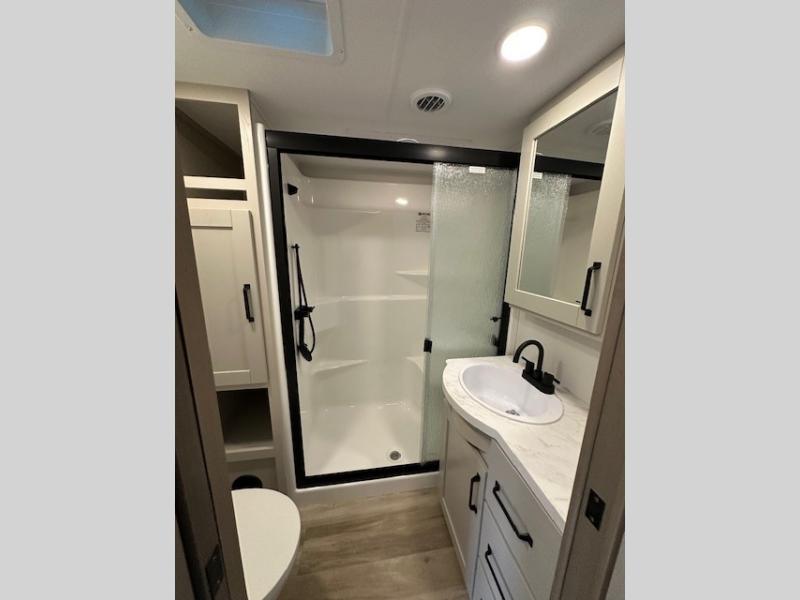 You can enjoy a spacious rear living area in this RV with dual opposing slides offering you entertainment, kitchen amenities, seating and windows for great views! The rear tri-fold sofa also converts into extra sleeping space for an extra guest or two, just like the booth dinette does. Yet you might like to add the swivel dinette option. There are theater seats to enjoy while you place your drinks in the cupholders and watch the entertainment center with a 40" LED HDTV and fireplace. The pantry is big enough to store your favorite snacks, and the kitchen island will make meal prepping easier, plus there is a 16 cu. ft. refrigerator to store any leftovers. The full bathroom has a 30" x 48" fiberglass shower and a linen closet to store your towels. The front private bedroom has a comfortable queen bed slide that can be switched out for the optional king bed, a dresser with overhead cabinets, and a full wall wardrobe that is prepped to add the optional washer and dryer so that you can extend your camping trip with clean clothes!