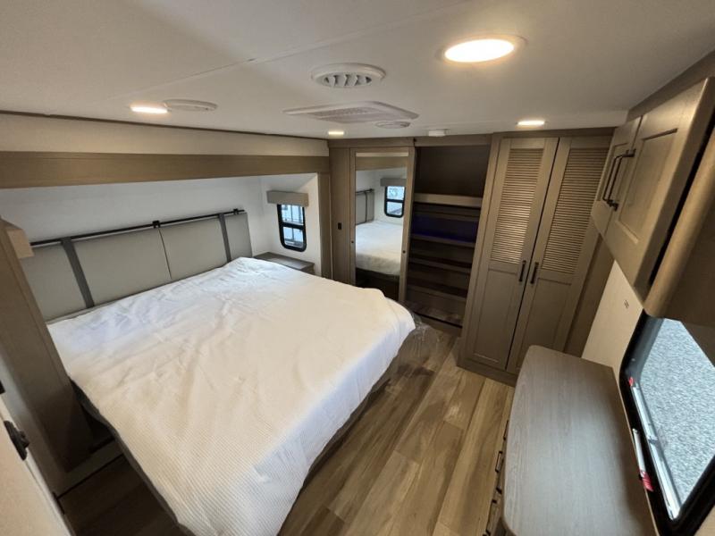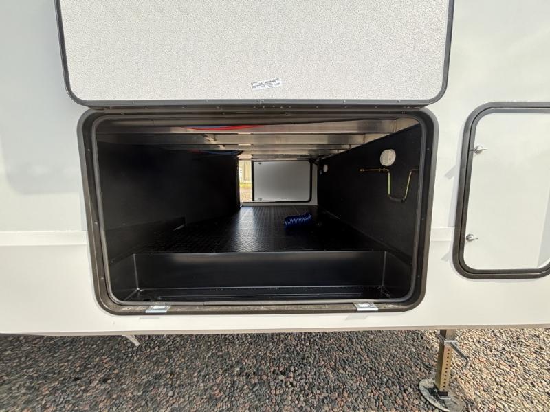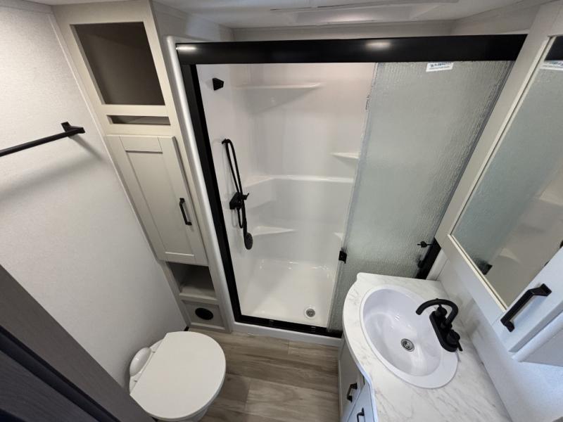 You can enjoy a spacious rear living area in this RV with dual opposing slides offering you entertainment, kitchen amenities, seating and windows for great views! The rear tri-fold sofa also converts into extra sleeping space for an extra guest or two, just like the booth dinette does. Yet you might like to add the swivel dinette option. There are theater seats to enjoy while you place your drinks in the cupholders and watch the entertainment center with a 40" LED HDTV and fireplace. The pantry is big enough to store your favorite snacks, and the kitchen island will make meal prepping easier, plus there is a 16 cu. ft. refrigerator to store any leftovers. The full bathroom has a 30" x 48" fiberglass shower and a linen closet to store your towels. The front private bedroom has a comfortable queen bed slide that can be switched out for the optional king bed, a dresser with overhead cabinets, and a full wall wardrobe that is prepped to add the optional washer and dryer so that you can extend your camping trip with clean clothes!