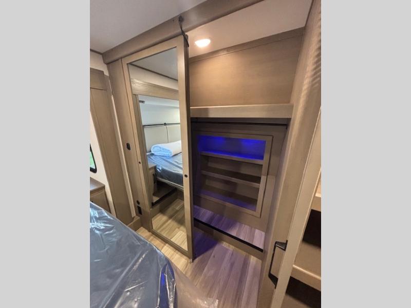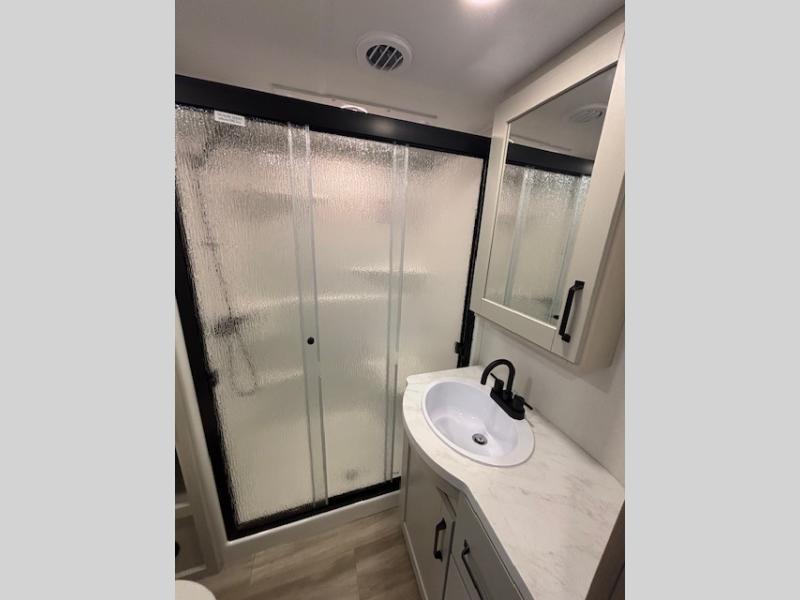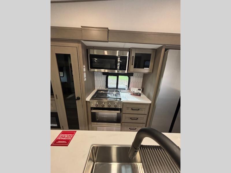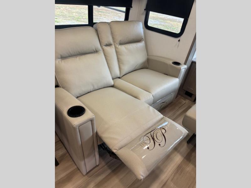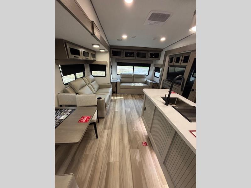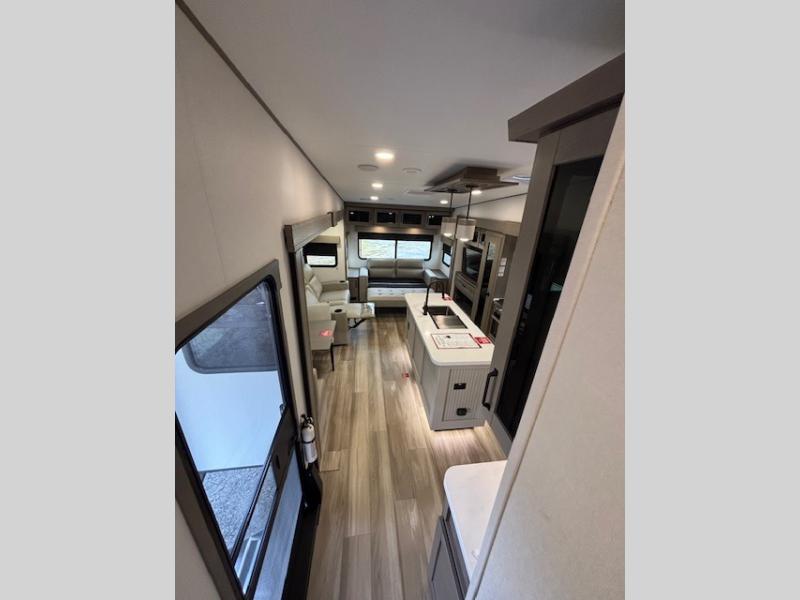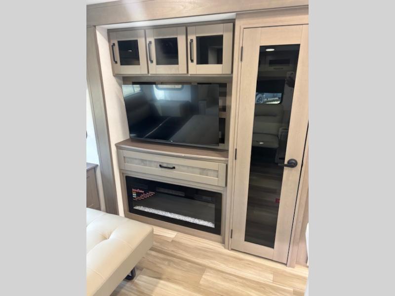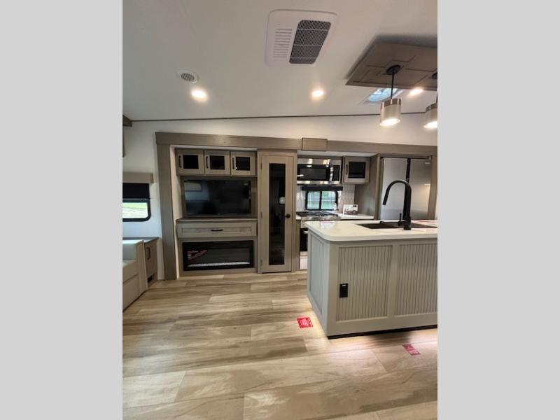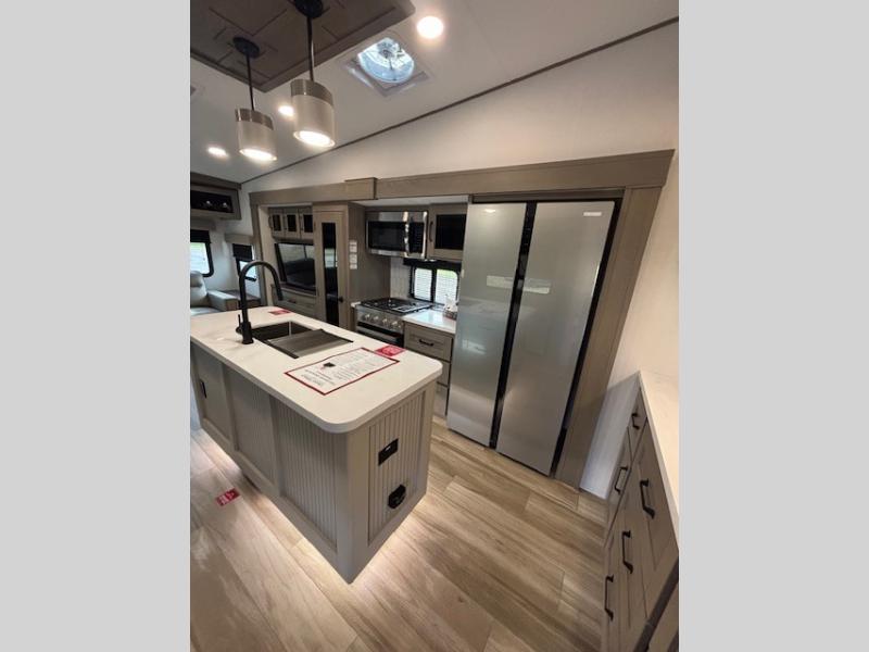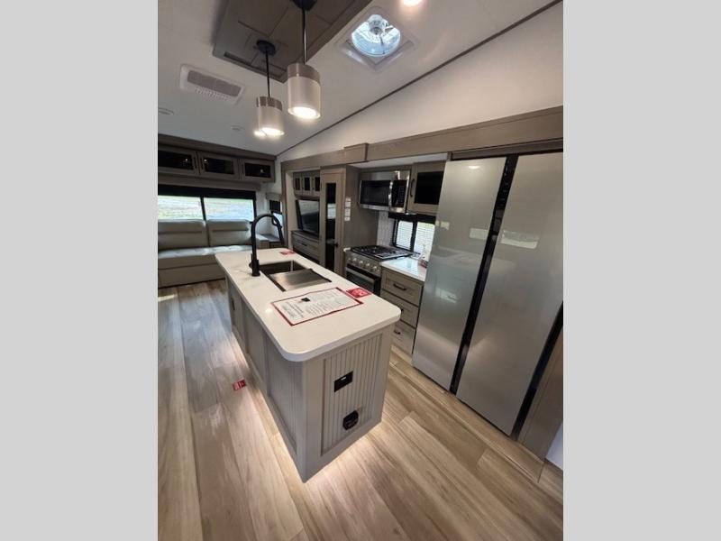 The 337RLS Reflection fifth wheel offers a spacious rear living area with dual opposing slides that maximize comfort and functionality. Relax on the rear tri-fold sofa or enjoy theater seating with cupholders while watching your favorite shows on the 40" LED HDTV above the cozy fireplace. Meal prep is a breeze with the kitchen island, large pantry, and a 16 cu. ft. refrigerator, while the swivel dinette with chairs and storage ottoman provides flexible seating and dining. The full bath features a 30" x 48" fiberglass shower and linen closet for added convenience, and the front private bedroom includes a king bed, dresser with overhead cabinets, and a full wall wardrobe with washer/dryer prep for extended trips.