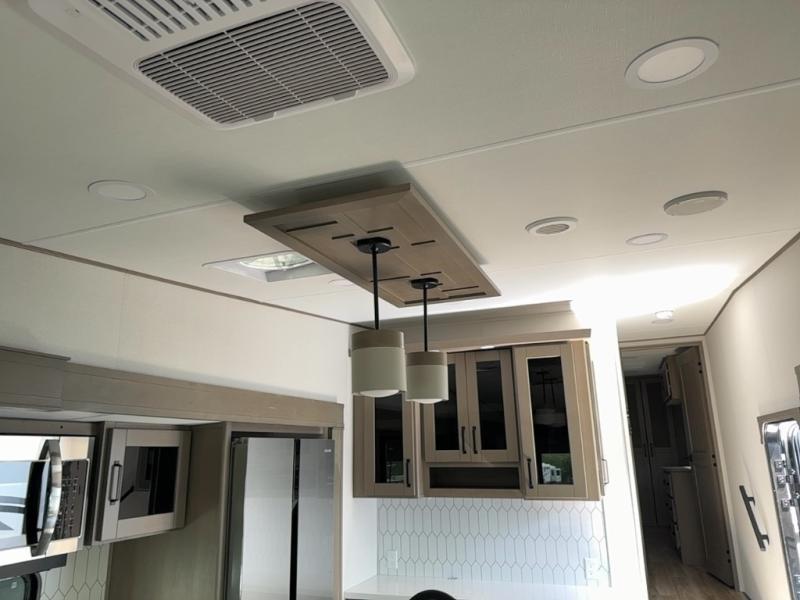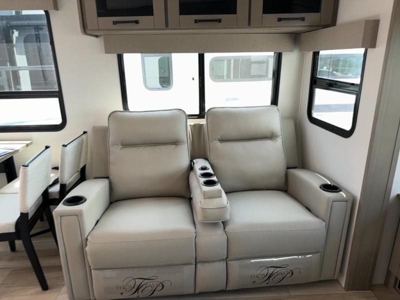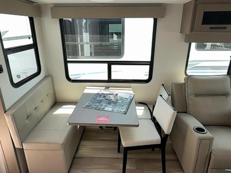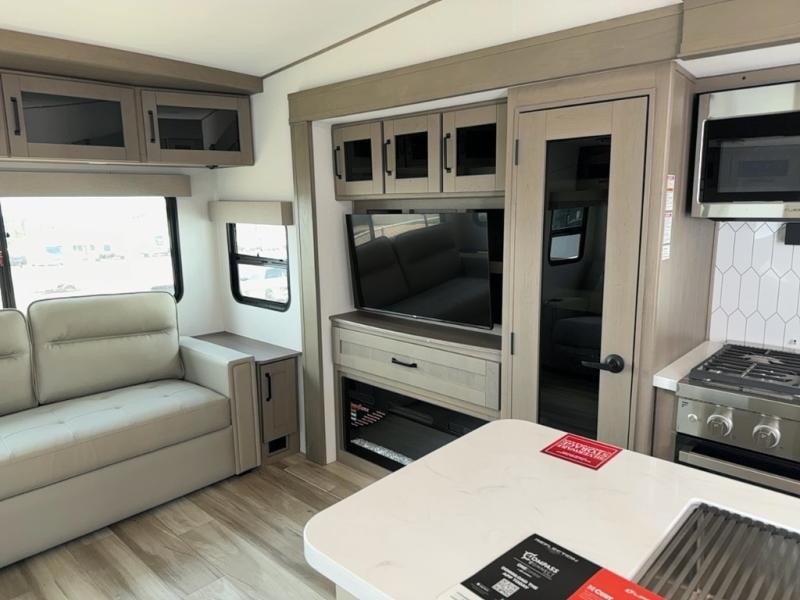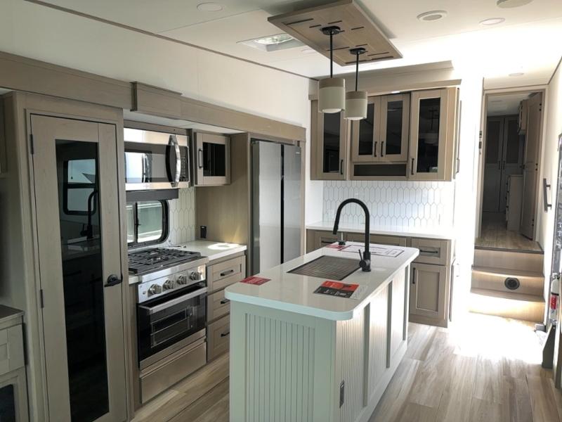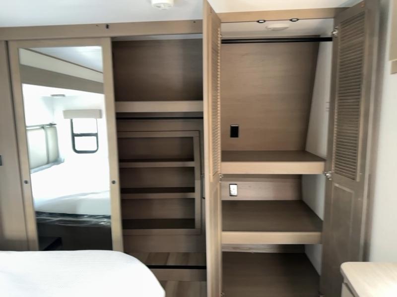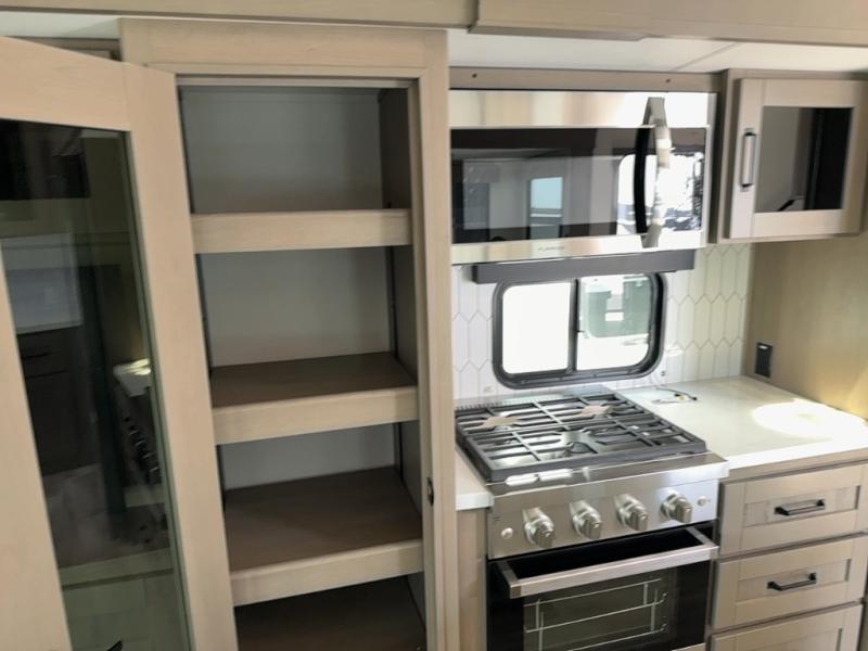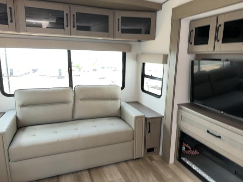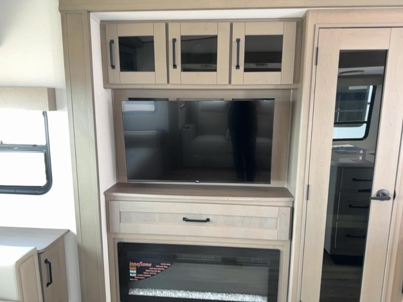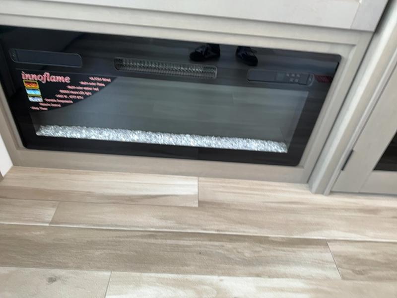You can enjoy a spacious rear living area in this RV with dual opposing slides offering you entertainment, kitchen amenities, seating and windows for great views! The rear tri-fold sofa also converts into extra sleeping space for an extra guest or two, just like the booth dinette does. Yet you might like to add the swivel dinette option. There are theater seats to enjoy while you place your drinks in the cupholders and watch the entertainment center with a 40" LED HDTV and fireplace. The pantry is big enough to store your favorite snacks, and the kitchen island will make meal prepping easier, plus there is a 16 cu. ft. refrigerator to store any leftovers. The full bathroom has a 30" x 48" fiberglass shower and a linen closet to store your towels. The front private bedroom has a comfortable queen bed slide that can be switched out for the optional king bed, a dresser with overhead cabinets, and a full wall wardrobe that is prepped to add the optional washer and dryer so that you can extend your camping trip with clean clothes!