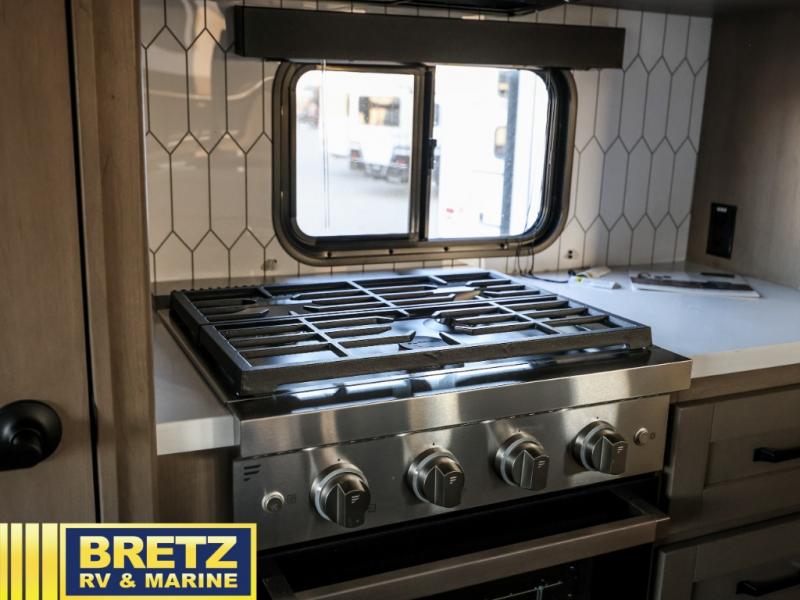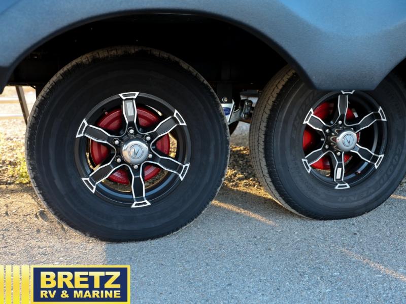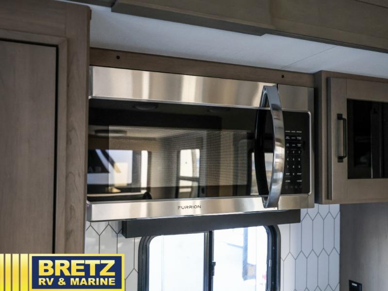 You can enjoy a spacious rear living area in this RV with dual opposing slides offering you entertainment, kitchen amenities, seating and windows for great views! The rear tri-fold sofa also converts into extra sleeping space for an extra guest or two, just like the booth dinette does. Yet you might like to add the swivel dinette option. There are theater seats to enjoy while you place your drinks in the cupholders and watch the entertainment center with a 40" LED HDTV and fireplace. The pantry is big enough to store your favorite snacks, and the kitchen island will make meal prepping easier, plus there is a 16 cu. ft. refrigerator to store any leftovers. The full bathroom has a 30" x 48" fiberglass shower and a linen closet to store your towels. The front private bedroom has a comfortable queen bed slide that can be switched out for the optional king bed, a dresser with overhead cabinets, and a full wall wardrobe that is prepped to add the optional washer and dryer so that you can extend your camping trip with clean clothes!