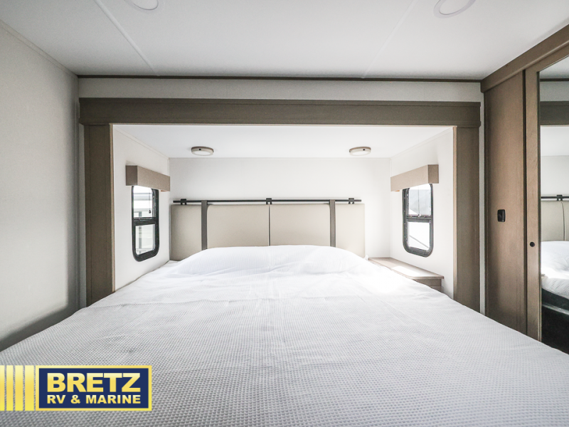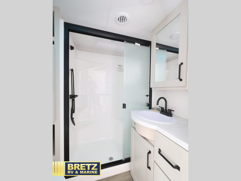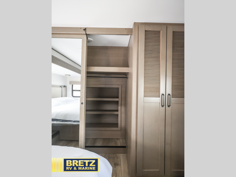 You can enjoy a spacious rear living area in this RV with dual opposing slides offering you entertainment, kitchen amenities, seating and windows for great views! The rear tri-fold sofa also converts into extra sleeping space for an extra guest or two, just like the booth dinette does. Yet you might like to add the swivel dinette option. There are theater seats to enjoy while you place your drinks in the cupholders and watch the entertainment center with a 40" LED HDTV and fireplace. The pantry is big enough to store your favorite snacks, and the kitchen island will make meal prepping easier, plus there is a 16 cu. ft. refrigerator to store any leftovers. The full bathroom has a 30" x 48" fiberglass shower and a linen closet to store your towels. The front private bedroom has a comfortable queen bed slide that can be switched out for the optional king bed, a dresser with overhead cabinets, and a full wall wardrobe that is prepped to add the optional washer and dryer so that you can extend your camping trip with clean clothes!