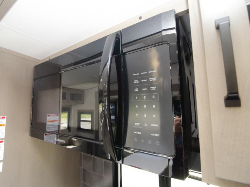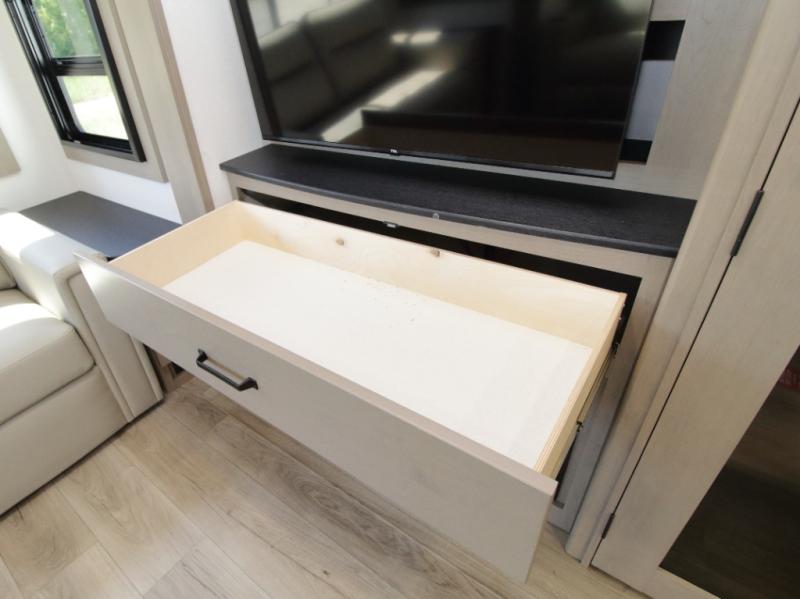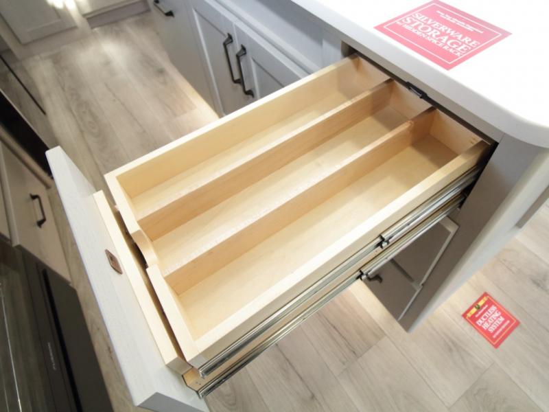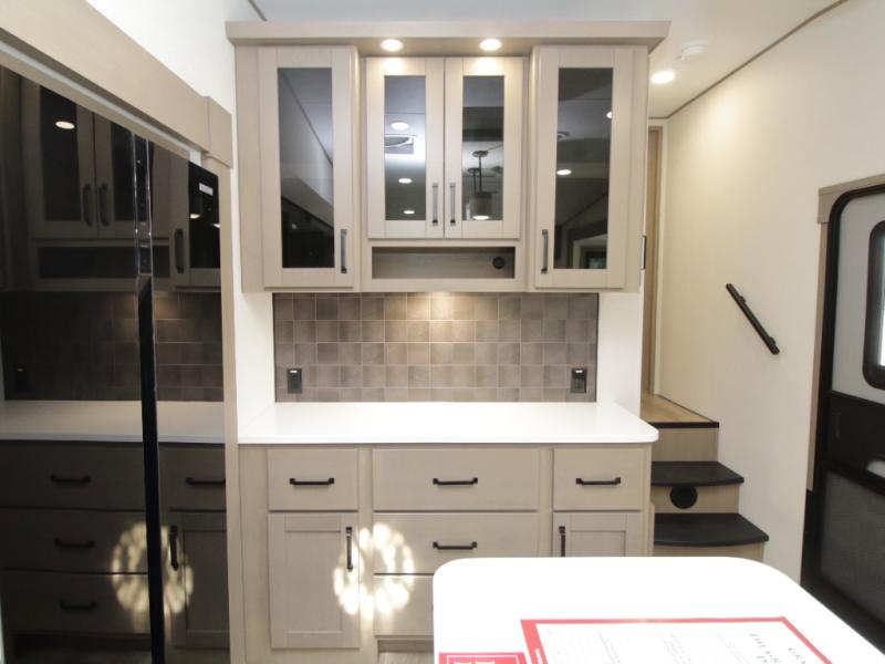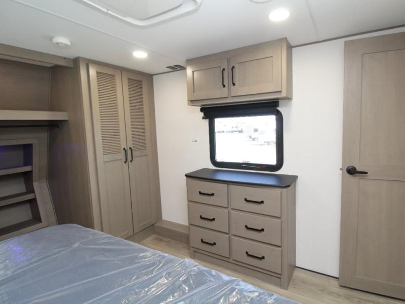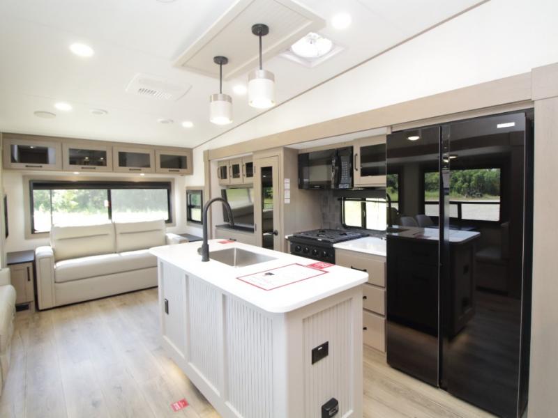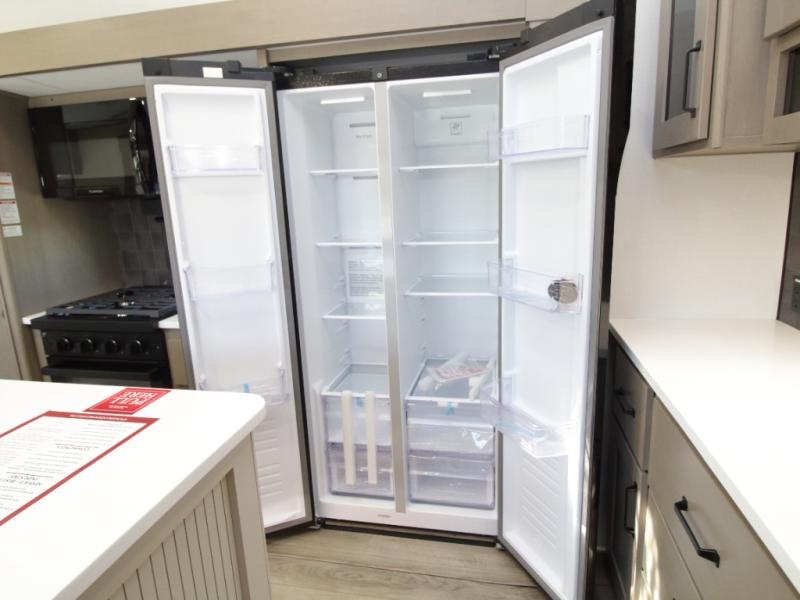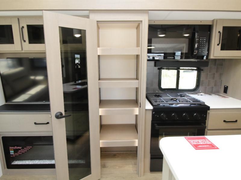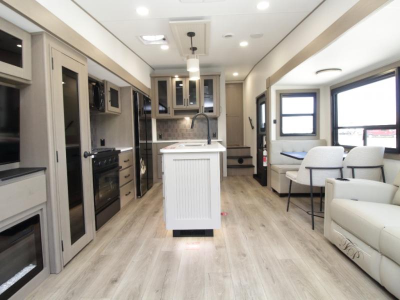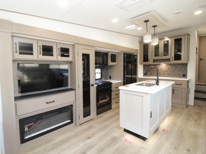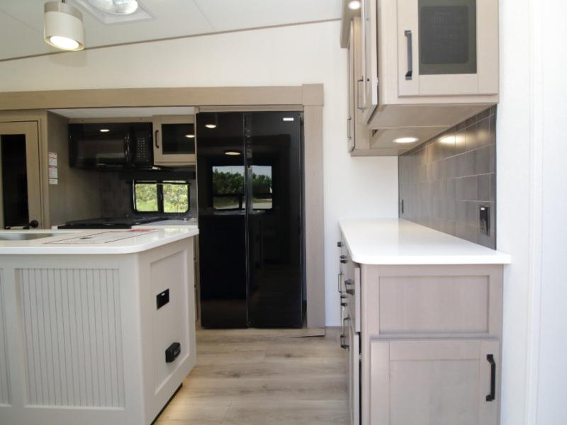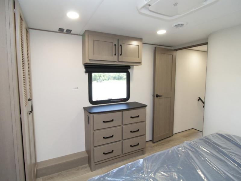 The kitchen is designed for serious cooking with a hutch for extra storage, large pantry, center island, and a 16 cu. ft. refrigerator to hold all your ingredients and leftovers. A full bathroom with a 30" x 48" fiberglass shower and linen closet adds convenience, while the front private bedroom offers a queen bed slide (or optional king), dresser storage, and a full wall wardrobe with washer/dryer prep.