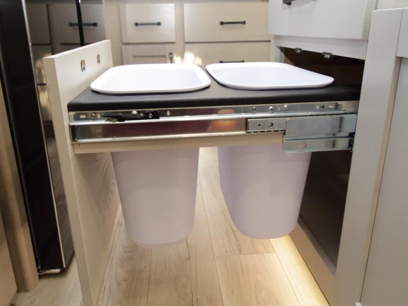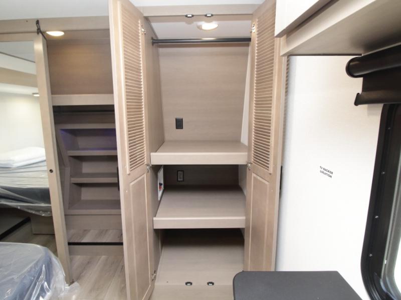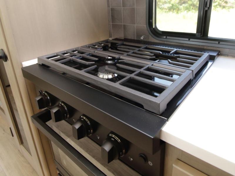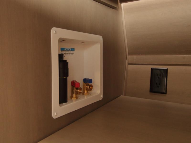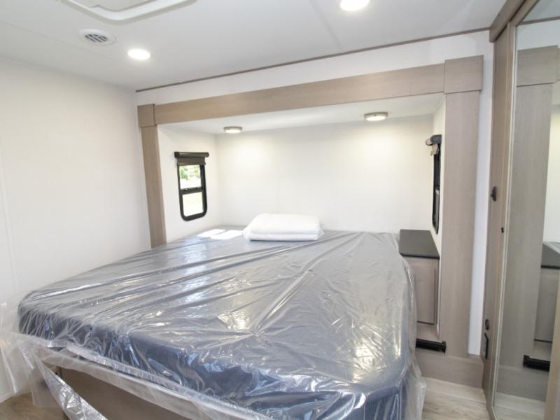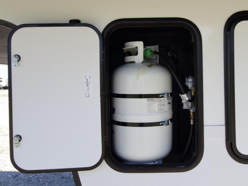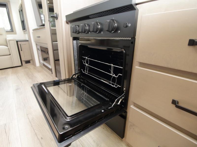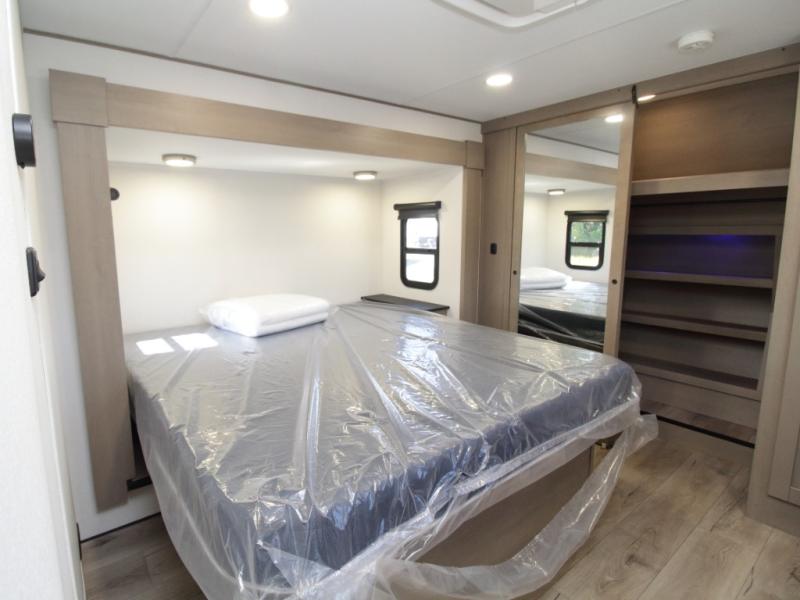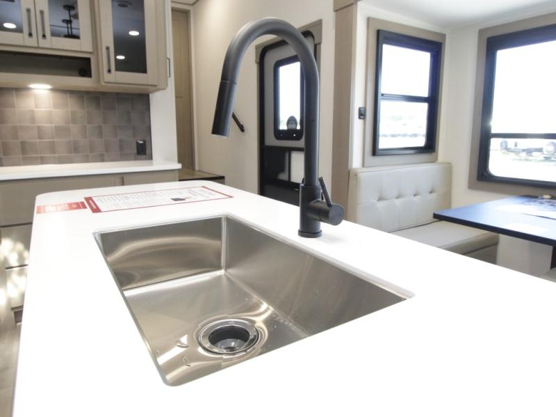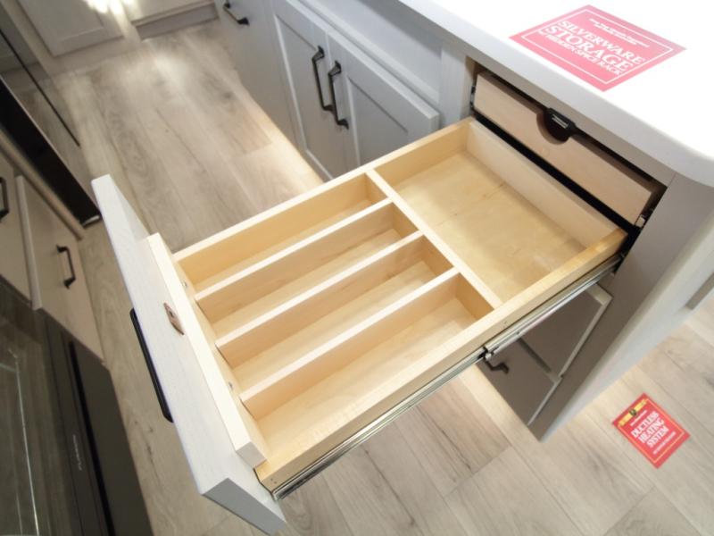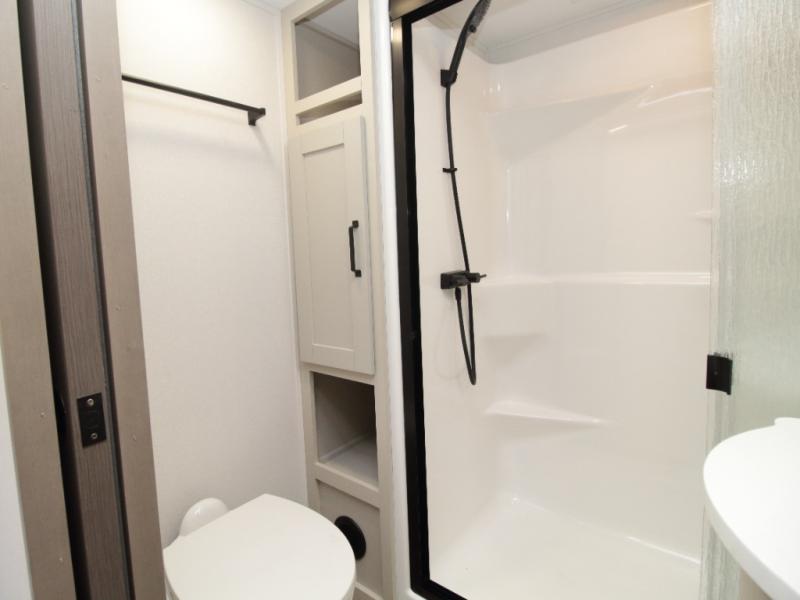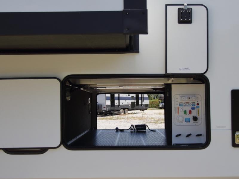 The kitchen is designed for serious cooking with a hutch for extra storage, large pantry, center island, and a 16 cu. ft. refrigerator to hold all your ingredients and leftovers. A full bathroom with a 30" x 48" fiberglass shower and linen closet adds convenience, while the front private bedroom offers a queen bed slide (or optional king), dresser storage, and a full wall wardrobe with washer/dryer prep.