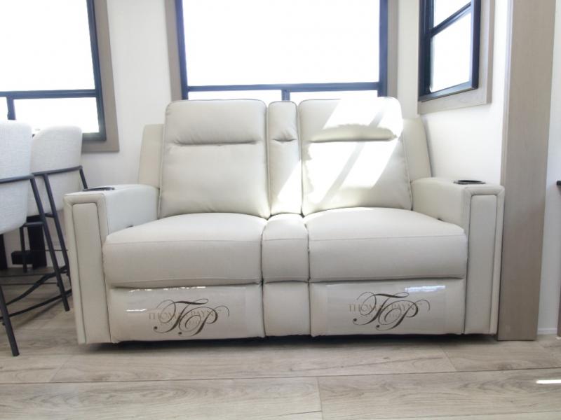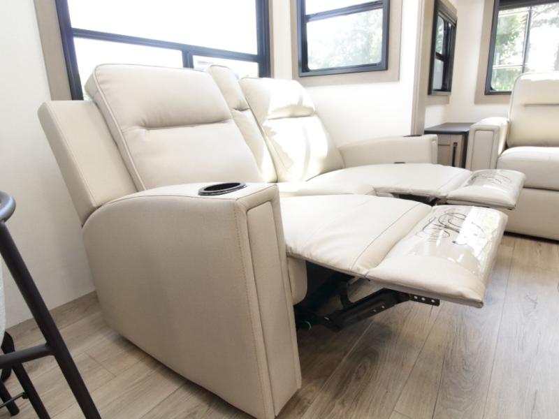 The Reflection 337RLS fifth wheel by Grand Design combines luxury, function, and residential comfort to make every camping trip memorable. The rear living area features dual opposing slides, a tri-fold sofa that doubles as guest sleeping space, and theater seating positioned perfectly for movie nights in front of the fireplace and HDTV.
