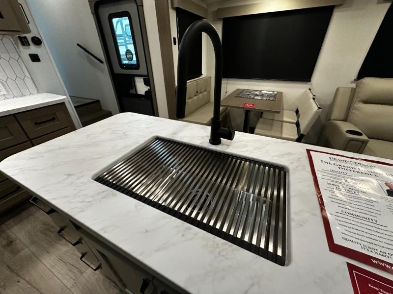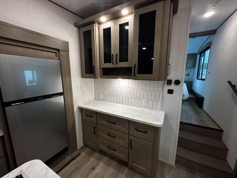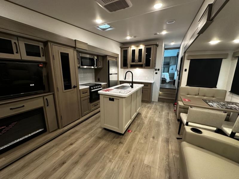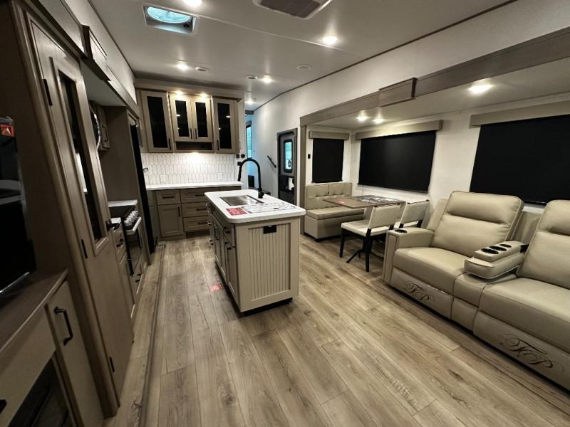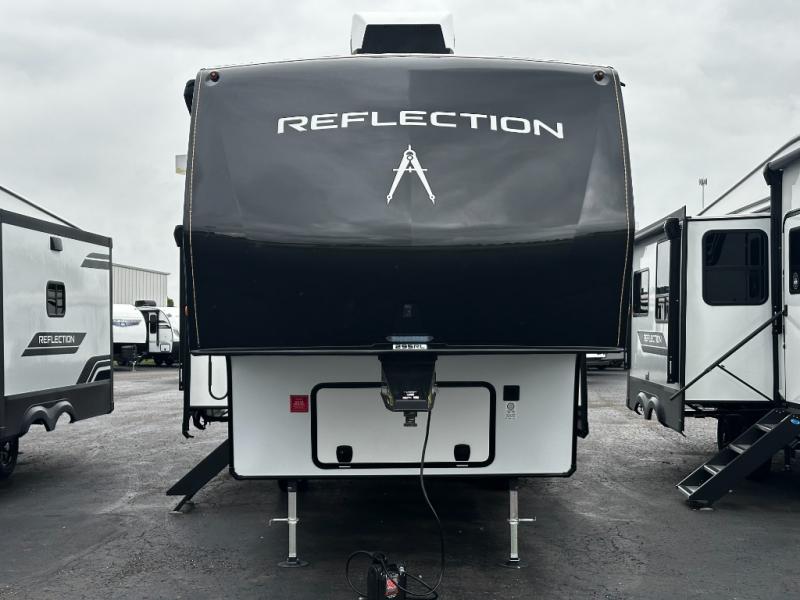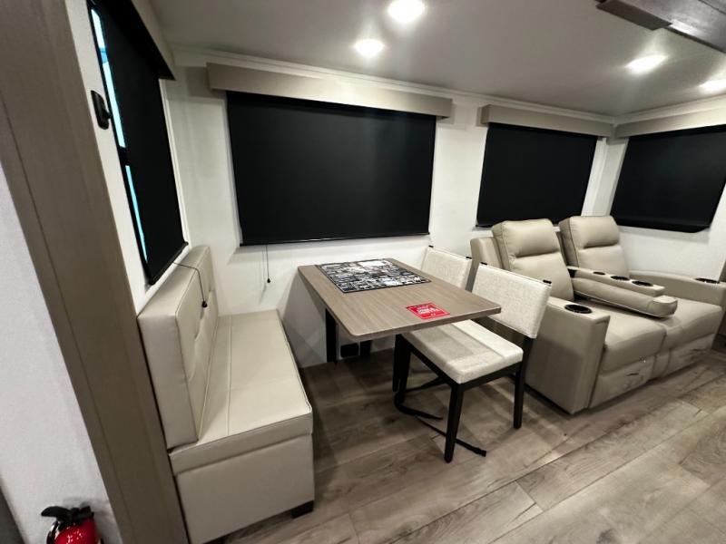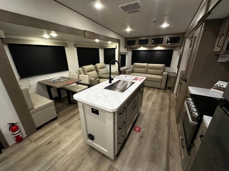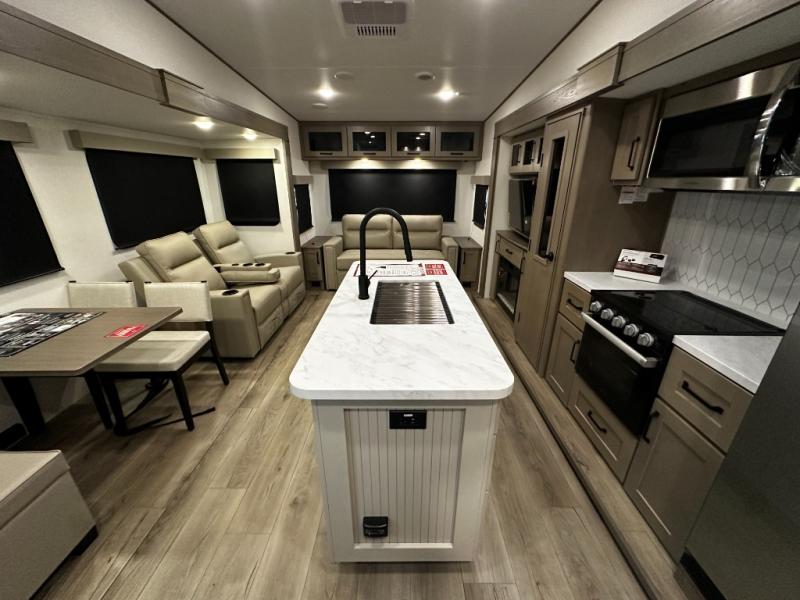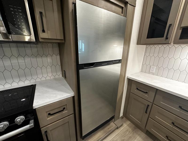 The chef-inspired kitchen is designed for convenience and functionality, featuring solid-surface countertops, a three-burner cooktop, microwave, residential refrigerator, and plenty of cabinetry for storage. The dinette or optional free-standing table provides a versatile space for dining, working, or leisure activities, ensuring the Reflection 337RLS meets all your travel needs.