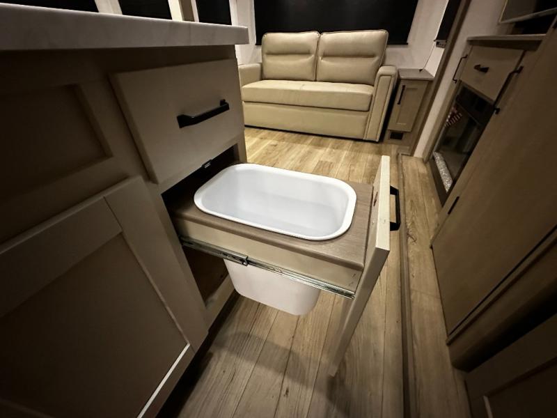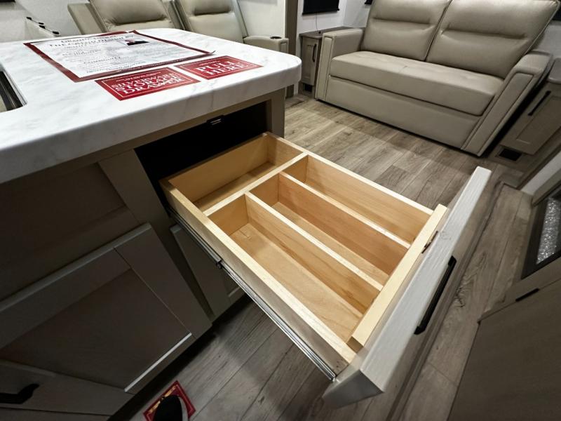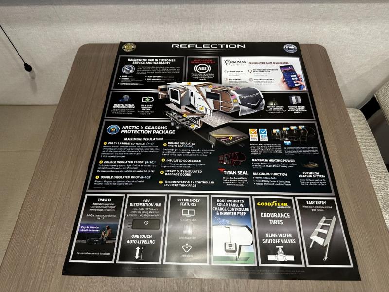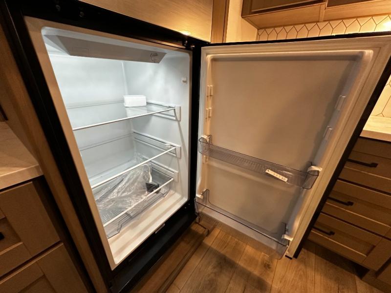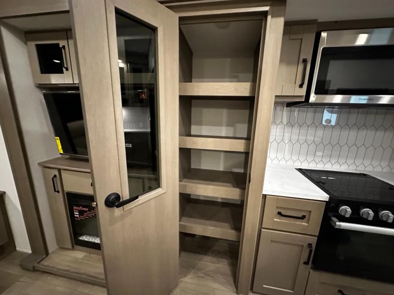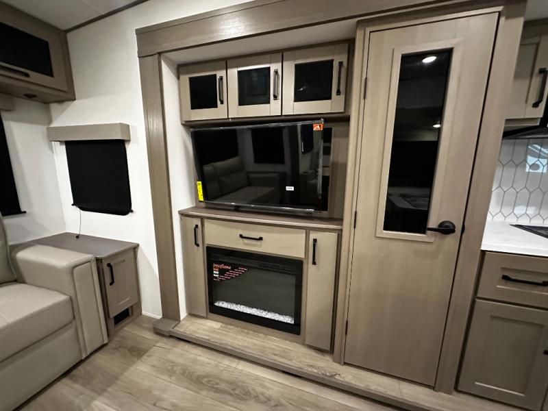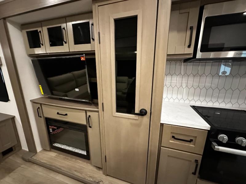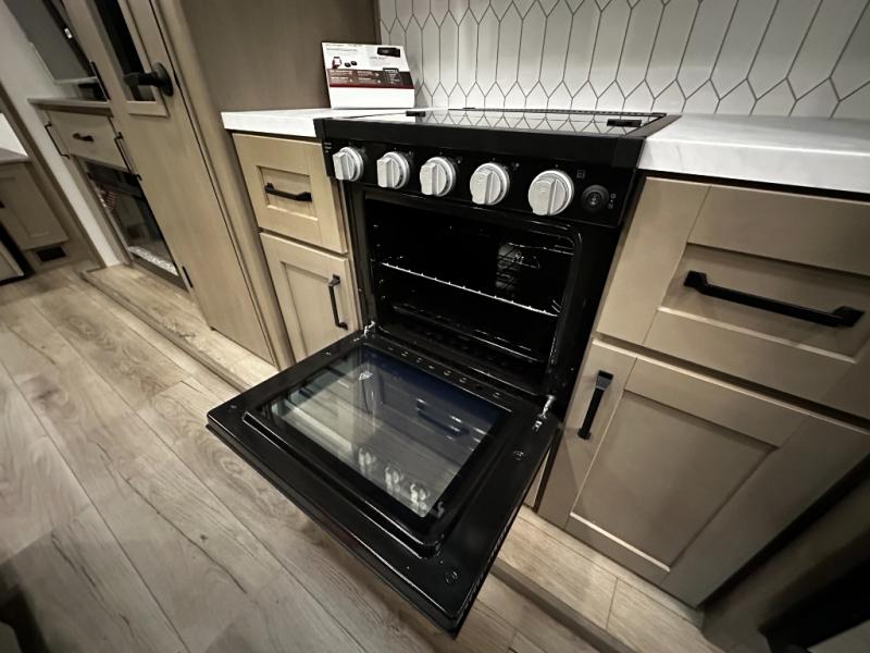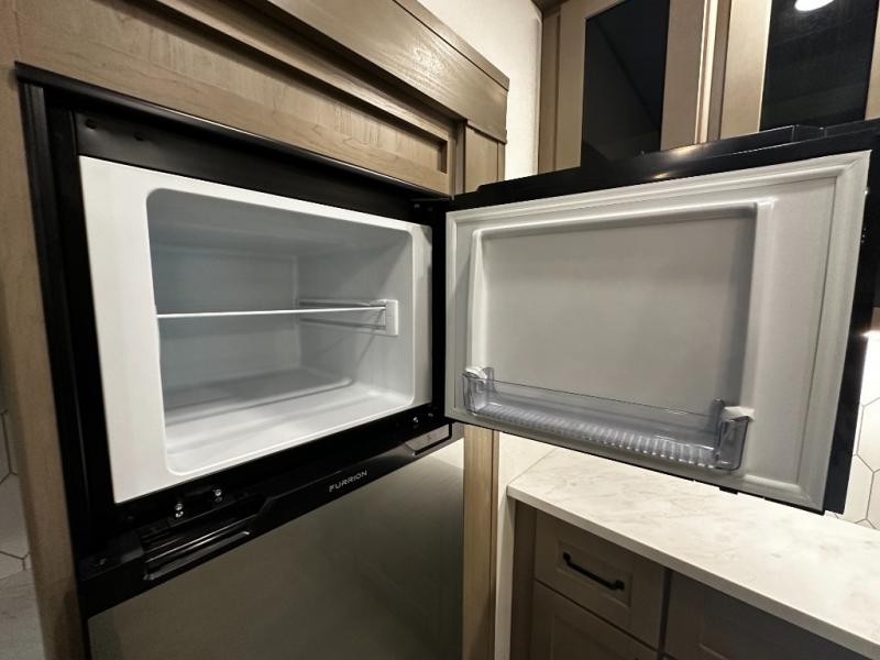 The chef-inspired kitchen is designed for convenience and functionality, featuring solid-surface countertops, a three-burner cooktop, microwave, residential refrigerator, and plenty of cabinetry for storage. The dinette or optional free-standing table provides a versatile space for dining, working, or leisure activities, ensuring the Reflection 337RLS meets all your travel needs.