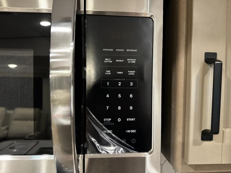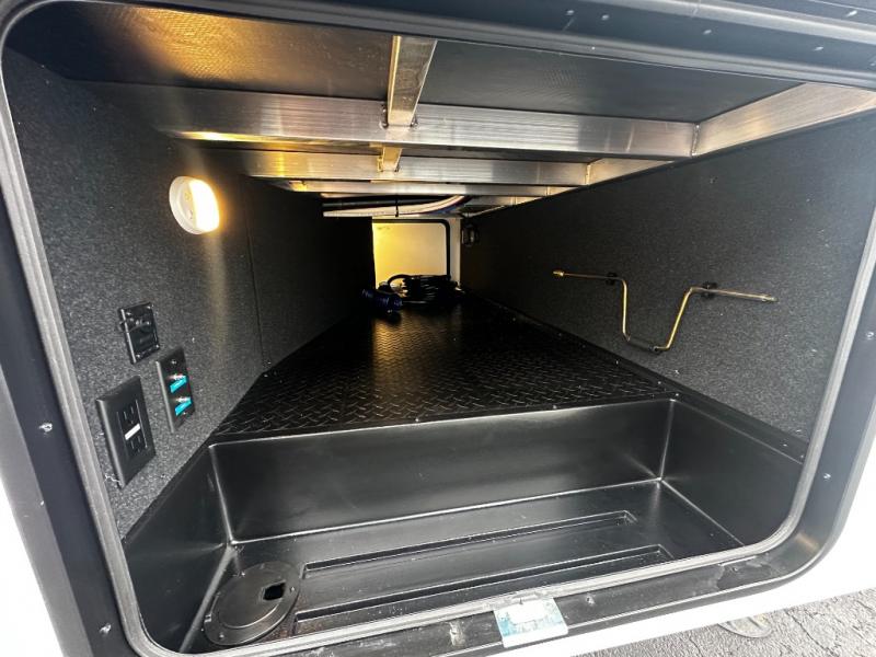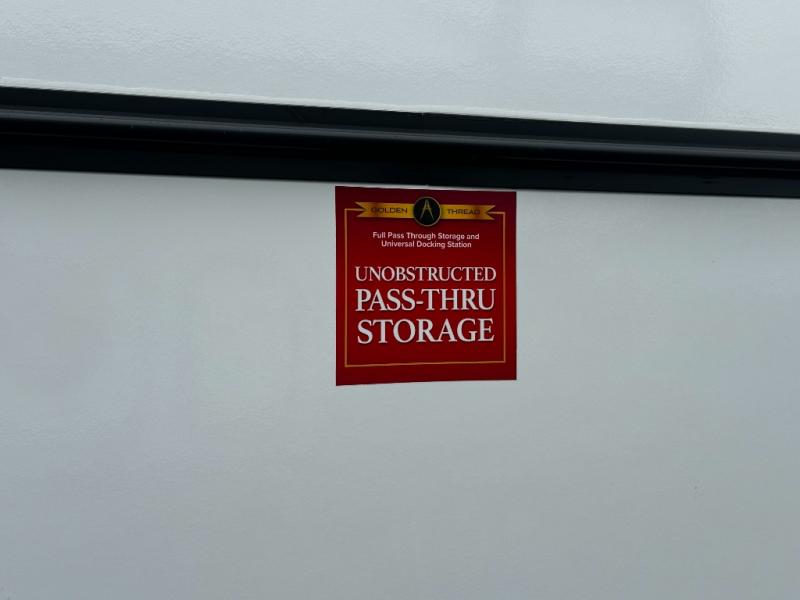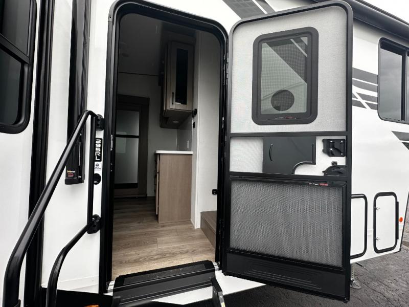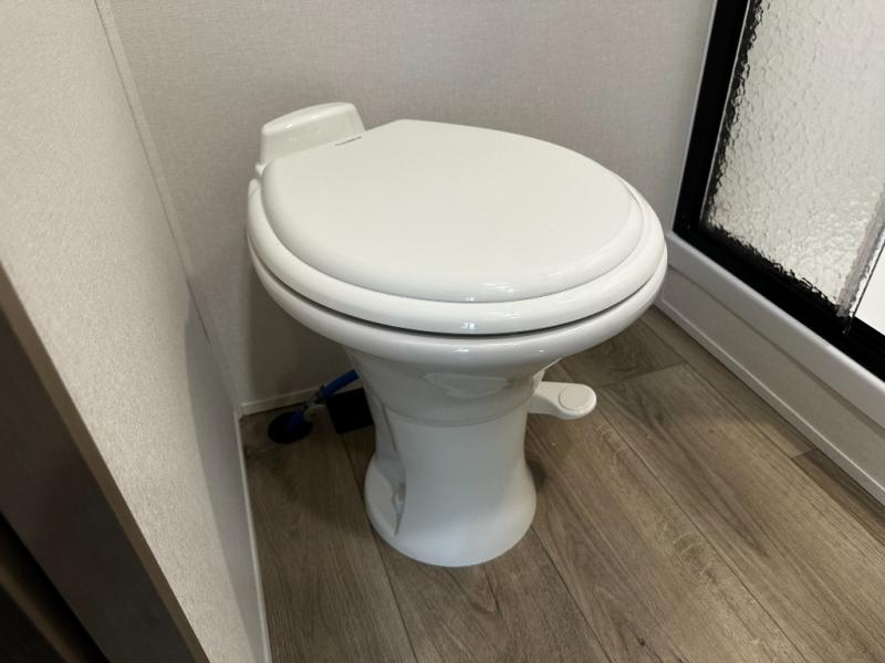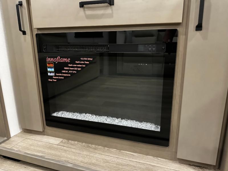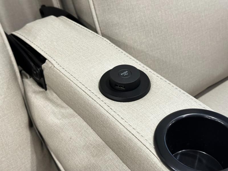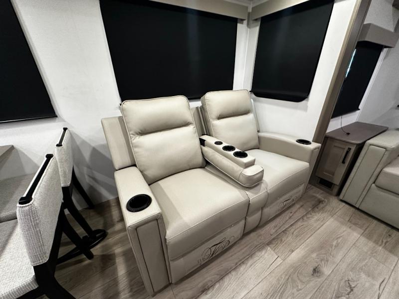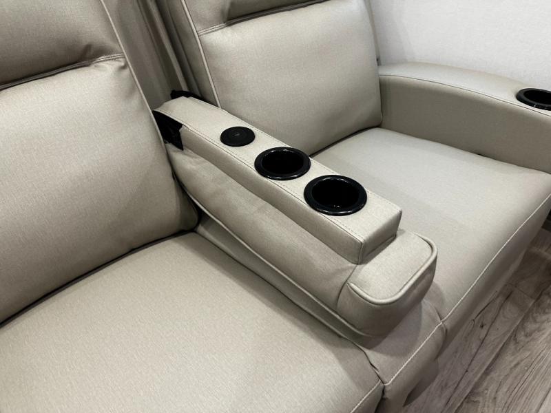 The rear living layout creates a welcoming space for relaxation and entertainment. Theater seating, a tri-fold sofa, and an entertainment center with a large TV make this area perfect for movie nights, game nights, or simply unwinding after a day of adventure. Large panoramic windows bring in natural light, enhancing the bright and open feel of the interior while keeping you connected to the outdoors.