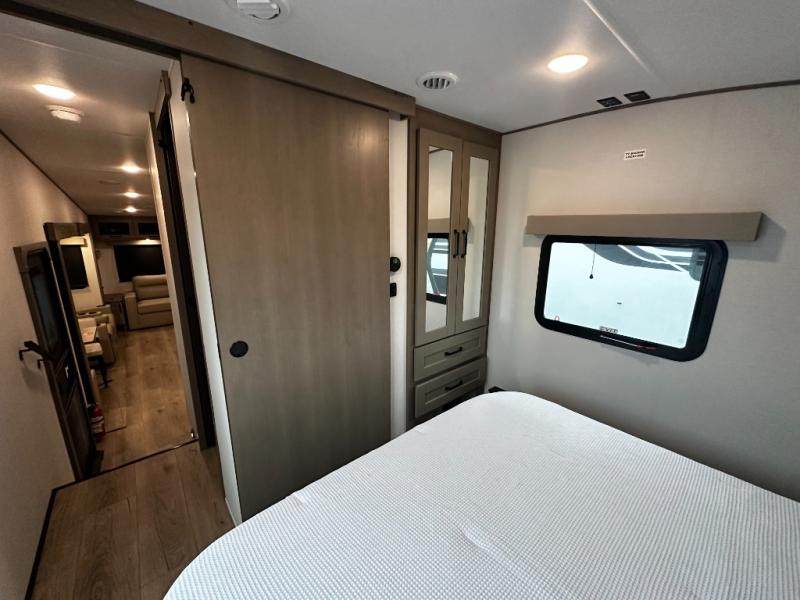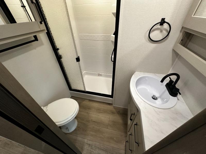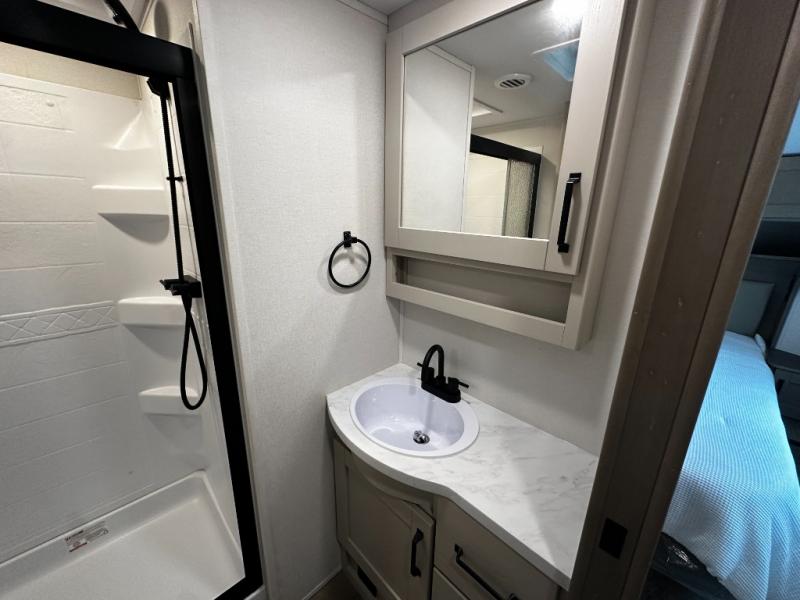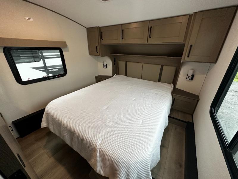 The front master suite serves as a private retreat with a walk-around king bed, dual wardrobes, overhead storage, and privacy doors. The full bathroom includes a spacious shower, vanity, and thoughtful storage solutions, providing residential-style comfort wherever the road takes you.