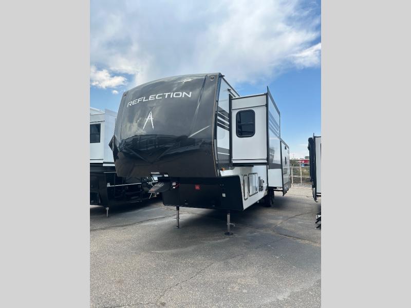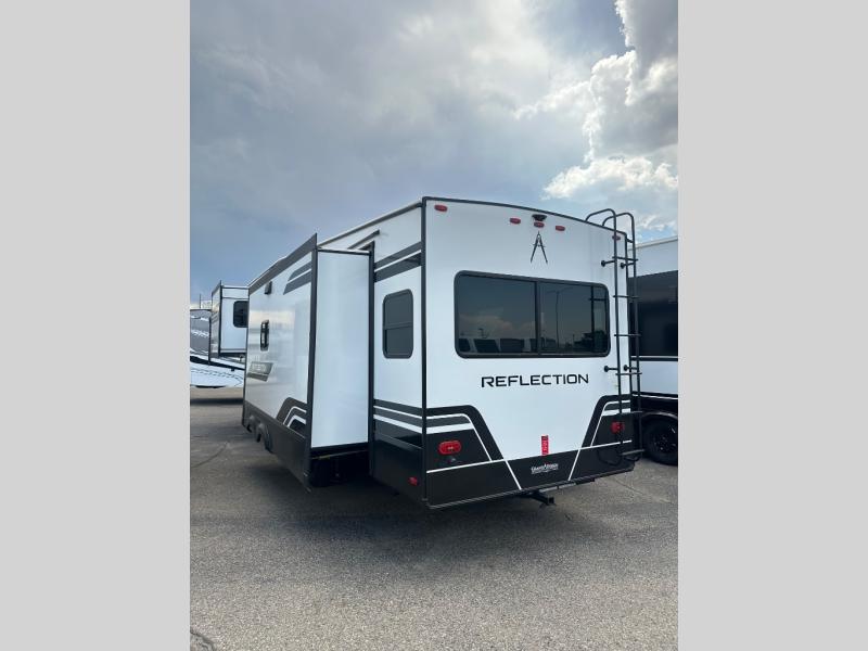 With any Reflection fifth wheel by Grand Design, you will have a solar panel for off-grid camping and a 60 amp charge controller and inverter prep, a Universal All-In-One docking station, unobstructed pass-through storage, and Goodyear Endurance tires. Each is constructed of gel coat exterior sidewalls, residential 5" truss rafters, walk-on roof decking, a fiberglass and radiant foil roof and front cap insulation plus laminated aluminum framed side walls, roof and end walls in slide rooms. Head inside to enjoy residential hardwood cabinet doors, premium Congoleum flooring, a spacious shower with a glass door, and many more comforts!