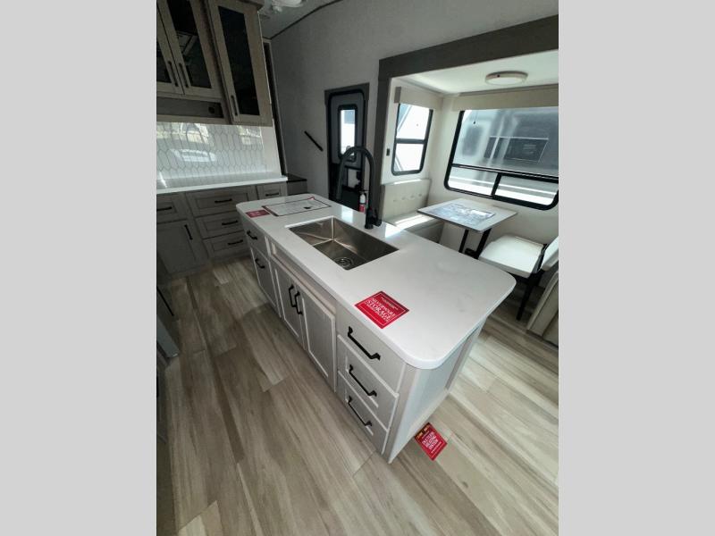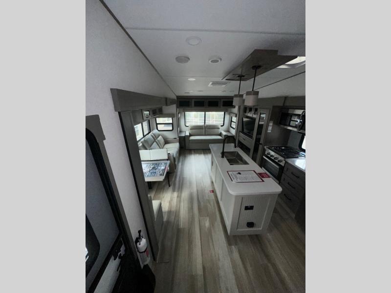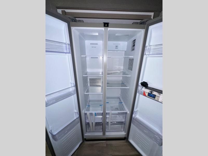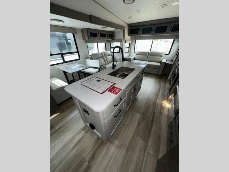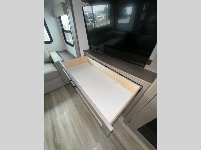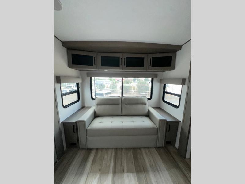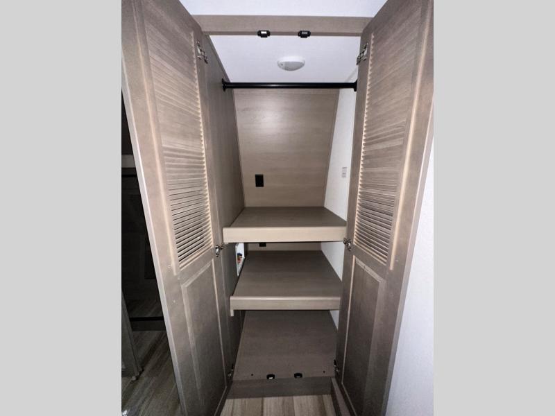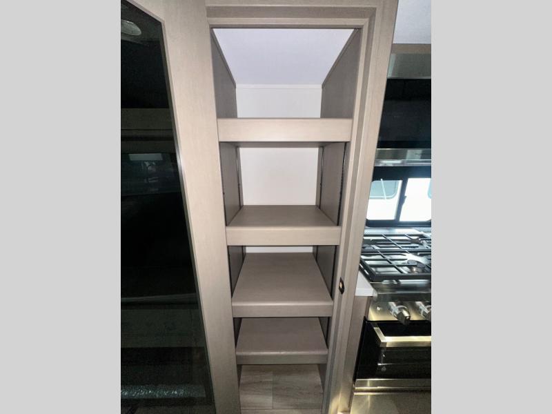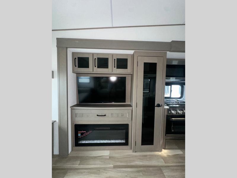 You can enjoy a spacious rear living area in this RV with dual opposing slides offering you entertainment, kitchen amenities, seating and windows for great views! The rear tri-fold sofa also converts into extra sleeping space for an extra guest or two, just like the booth dinette does. Yet you might like to add the swivel dinette option. There are theater seats to enjoy while you place your drinks in the cupholders and watch the entertainment center with a 40" LED HDTV and fireplace. The pantry is big enough to store your favorite snacks, and the kitchen island will make meal prepping easier, plus there is a 16 cu. ft. refrigerator to store any leftovers. The full bathroom has a 30" x 48" fiberglass shower and a linen closet to store your towels. The front private bedroom has a comfortable queen bed slide that can be switched out for the optional king bed, a dresser with overhead cabinets, and a full wall wardrobe that is prepped to add the optional washer and dryer so that you can extend your camping trip with clean clothes!