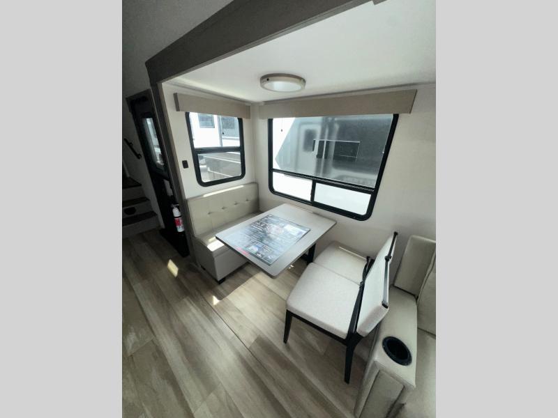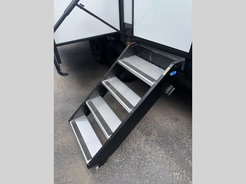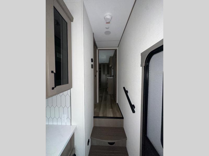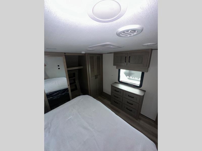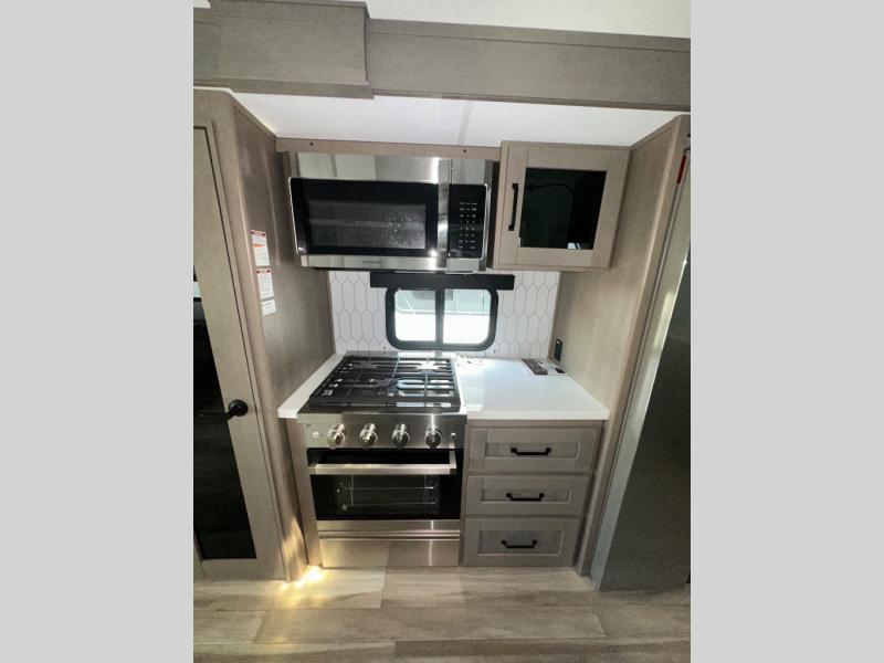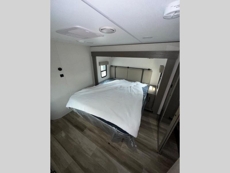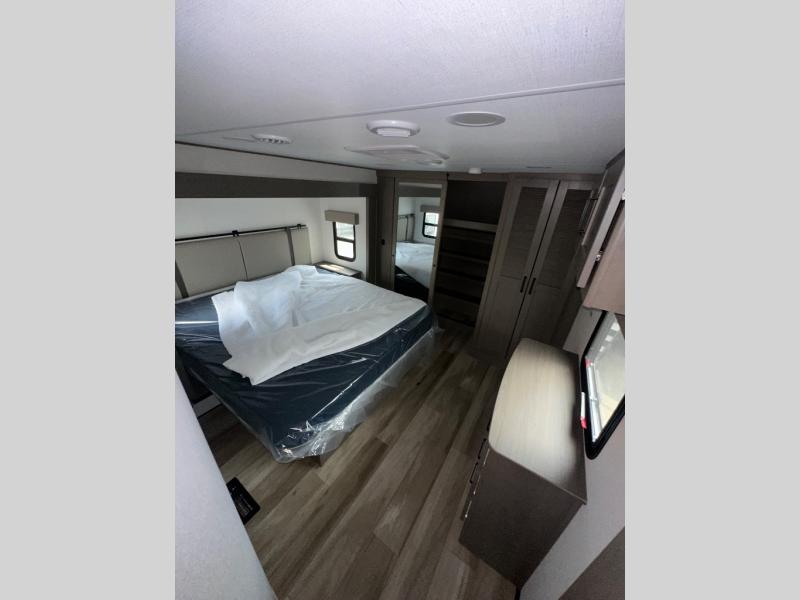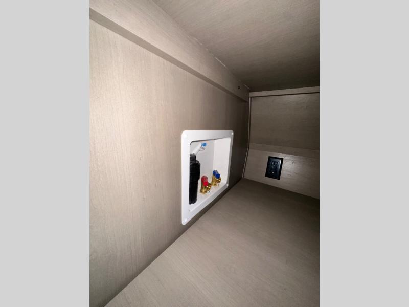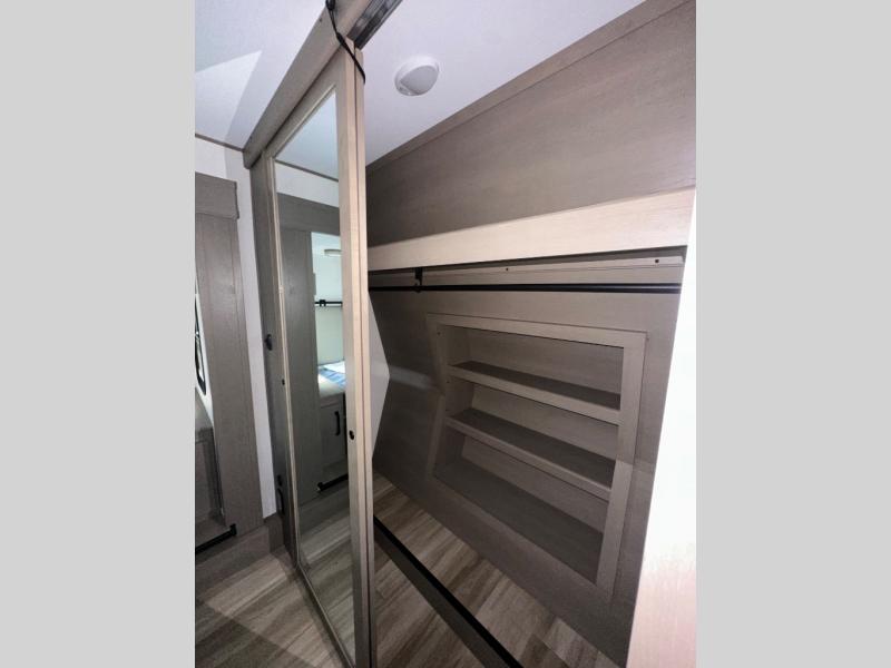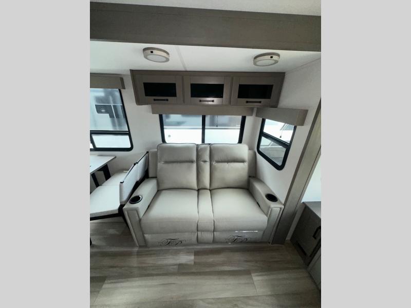 You can enjoy a spacious rear living area in this RV with dual opposing slides offering you entertainment, kitchen amenities, seating and windows for great views! The rear tri-fold sofa also converts into extra sleeping space for an extra guest or two, just like the booth dinette does. Yet you might like to add the swivel dinette option. There are theater seats to enjoy while you place your drinks in the cupholders and watch the entertainment center with a 40" LED HDTV and fireplace. The pantry is big enough to store your favorite snacks, and the kitchen island will make meal prepping easier, plus there is a 16 cu. ft. refrigerator to store any leftovers. The full bathroom has a 30" x 48" fiberglass shower and a linen closet to store your towels. The front private bedroom has a comfortable queen bed slide that can be switched out for the optional king bed, a dresser with overhead cabinets, and a full wall wardrobe that is prepped to add the optional washer and dryer so that you can extend your camping trip with clean clothes!