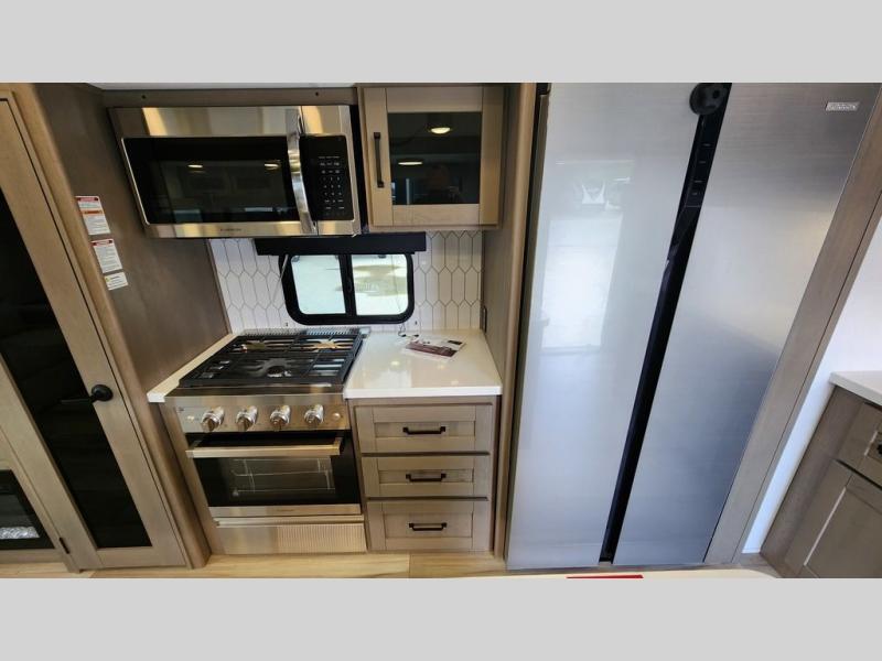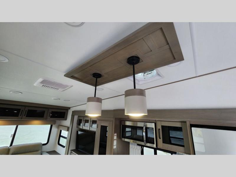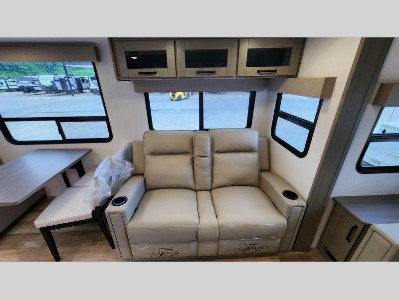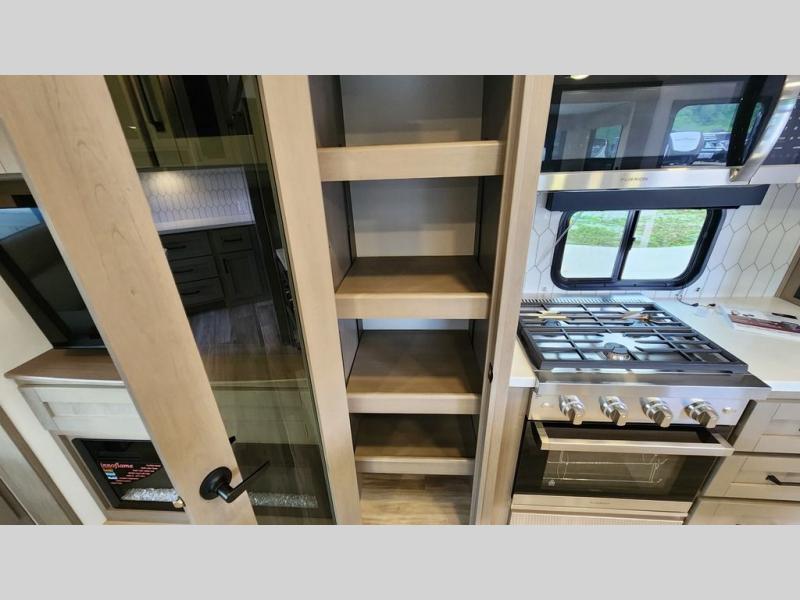 You can enjoy a spacious rear living area in this RV with dual opposing slides offering you entertainment, kitchen amenities, seating and windows for great views! The rear tri-fold sofa also converts into extra sleeping space for an extra guest or two, just like the booth dinette does. Yet you might like to add the swivel dinette option. There are theater seats to enjoy while you place your drinks in the cupholders and watch the entertainment center with a 40" LED HDTV and fireplace. The pantry is big enough to store your favorite snacks, and the kitchen island will make meal prepping easier, plus there is a 16 cu. ft. refrigerator to store any leftovers. The full bathroom has a 30" x 48" fiberglass shower and a linen closet to store your towels. The front private bedroom has a comfortable queen bed slide that can be switched out for the optional king bed, a dresser with overhead cabinets, and a full wall wardrobe that is prepped to add the optional washer and dryer so that you can extend your camping trip with clean clothes!