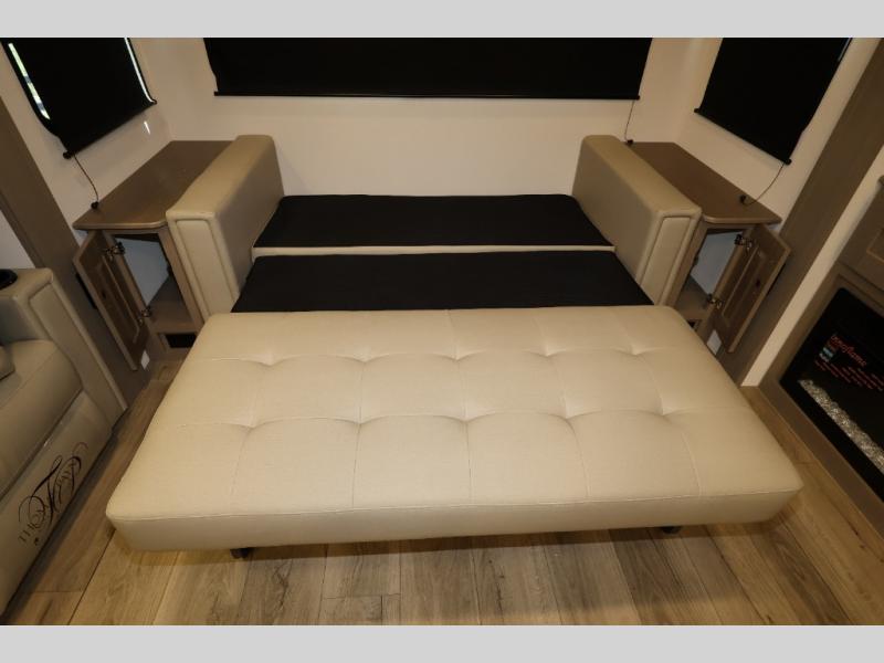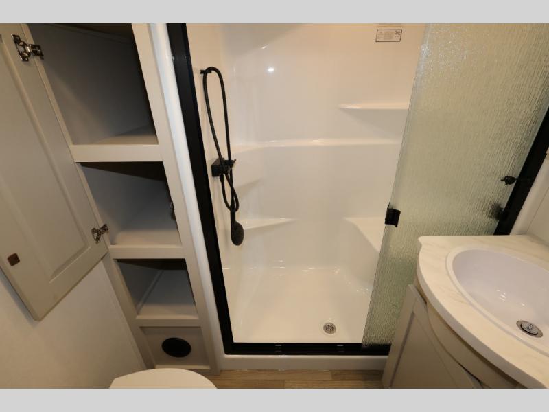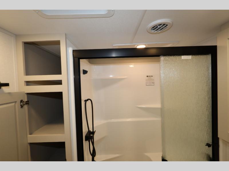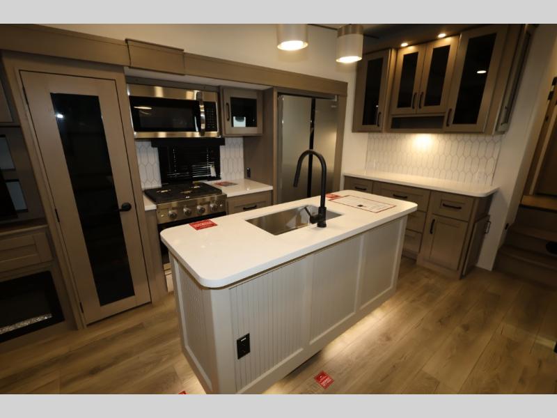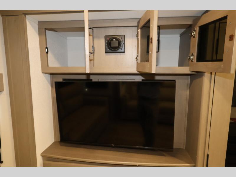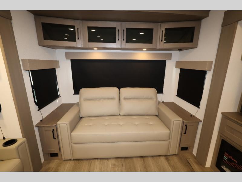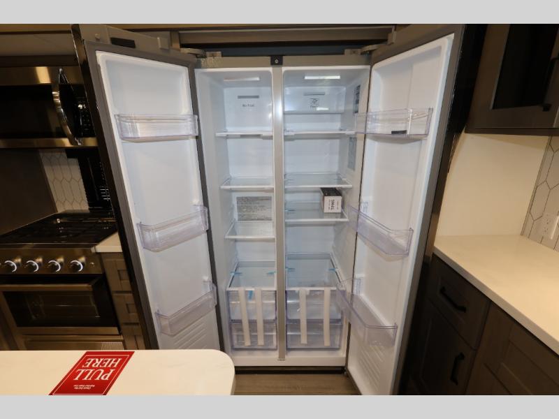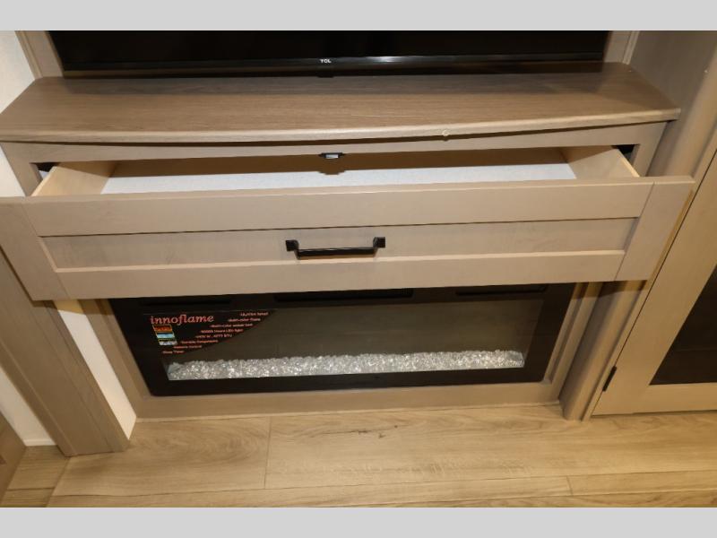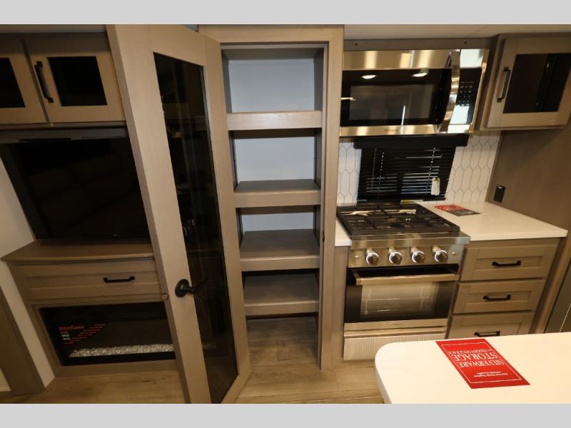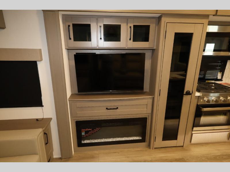 You can enjoy a spacious rear living area in this RV with dual opposing slides offering you entertainment, kitchen amenities, seating and windows for great views! The rear tri-fold sofa also converts into extra sleeping space for an extra guest or two, just like the booth dinette does. Yet you might like to add the swivel dinette option. There are theater seats to enjoy while you place your drinks in the cupholders and watch the entertainment center with a 40" LED HDTV and fireplace. The pantry is big enough to store your favorite snacks, and the kitchen island will make meal prepping easier, plus there is a 16 cu. ft. refrigerator to store any leftovers. The full bathroom has a 30" x 48" fiberglass shower and a linen closet to store your towels. The front private bedroom has a comfortable queen bed slide that can be switched out for the optional king bed, a dresser with overhead cabinets, and a full wall wardrobe that is prepped to add the optional washer and dryer so that you can extend your camping trip with clean clothes!