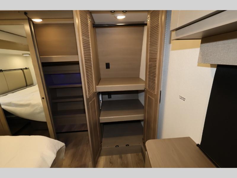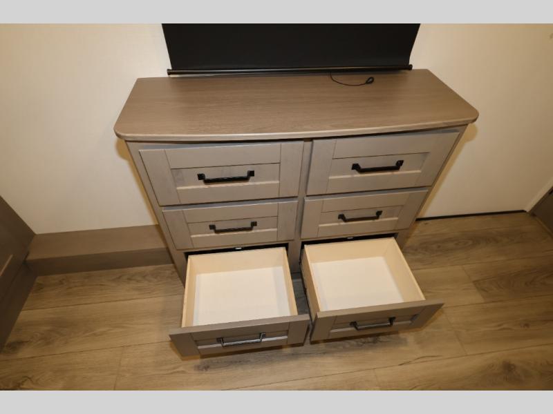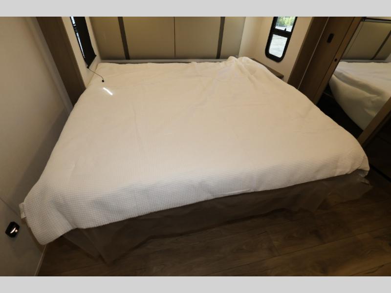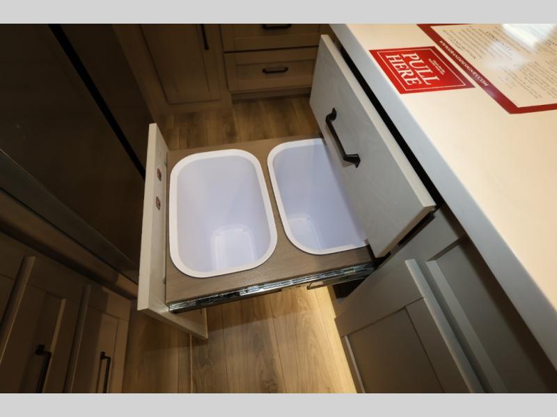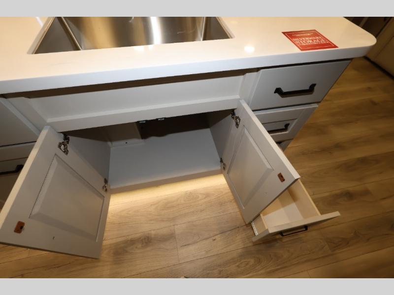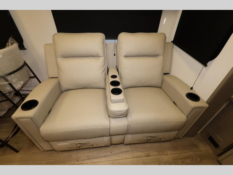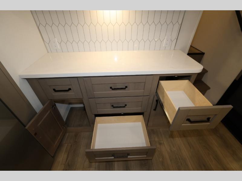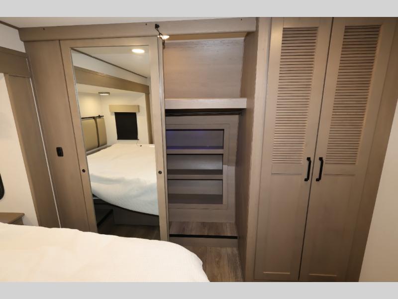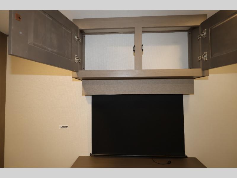 You can enjoy a spacious rear living area in this RV with dual opposing slides offering you entertainment, kitchen amenities, seating and windows for great views! The rear tri-fold sofa also converts into extra sleeping space for an extra guest or two, just like the booth dinette does. Yet you might like to add the swivel dinette option. There are theater seats to enjoy while you place your drinks in the cupholders and watch the entertainment center with a 40" LED HDTV and fireplace. The pantry is big enough to store your favorite snacks, and the kitchen island will make meal prepping easier, plus there is a 16 cu. ft. refrigerator to store any leftovers. The full bathroom has a 30" x 48" fiberglass shower and a linen closet to store your towels. The front private bedroom has a comfortable queen bed slide that can be switched out for the optional king bed, a dresser with overhead cabinets, and a full wall wardrobe that is prepped to add the optional washer and dryer so that you can extend your camping trip with clean clothes!