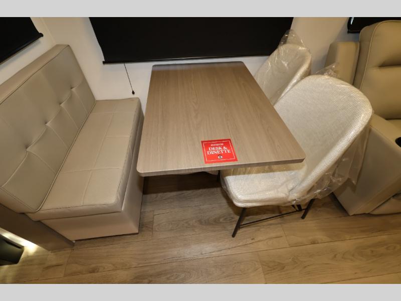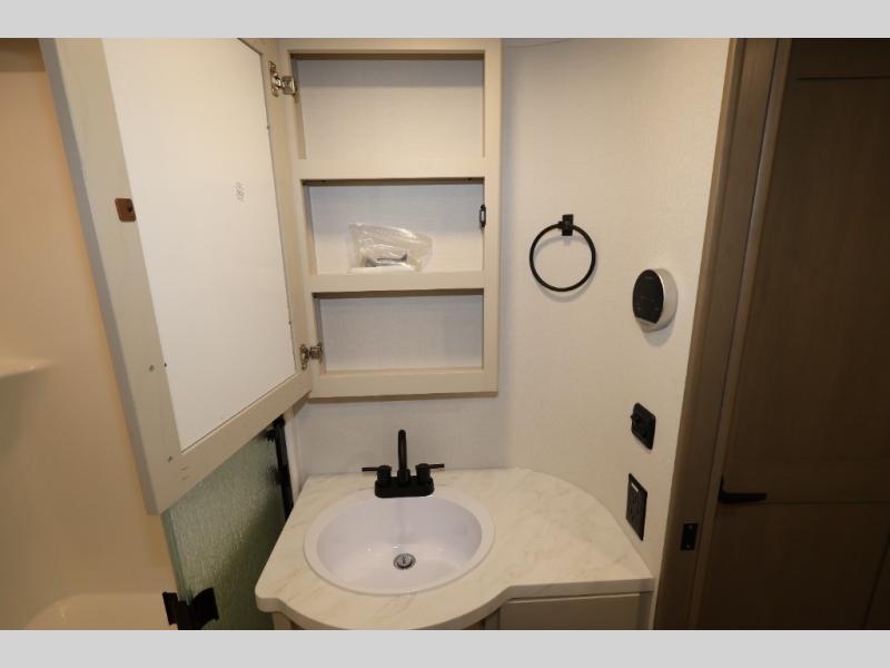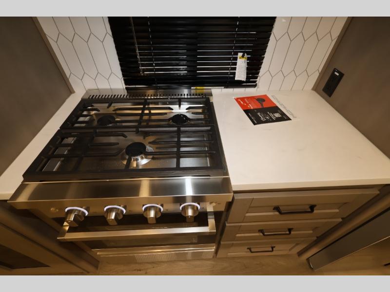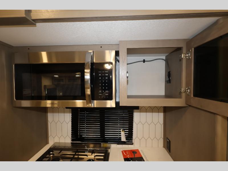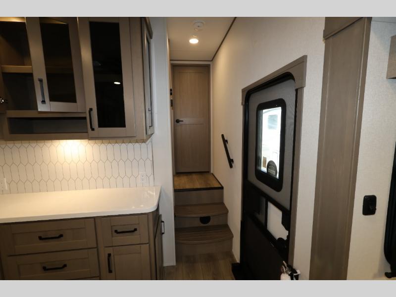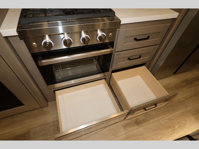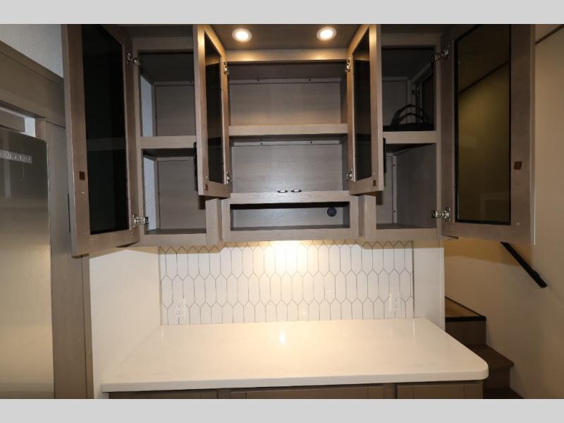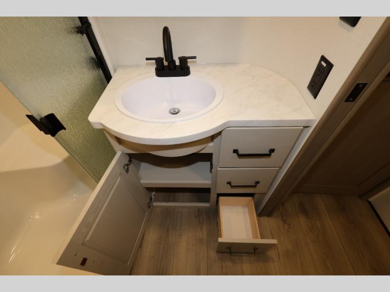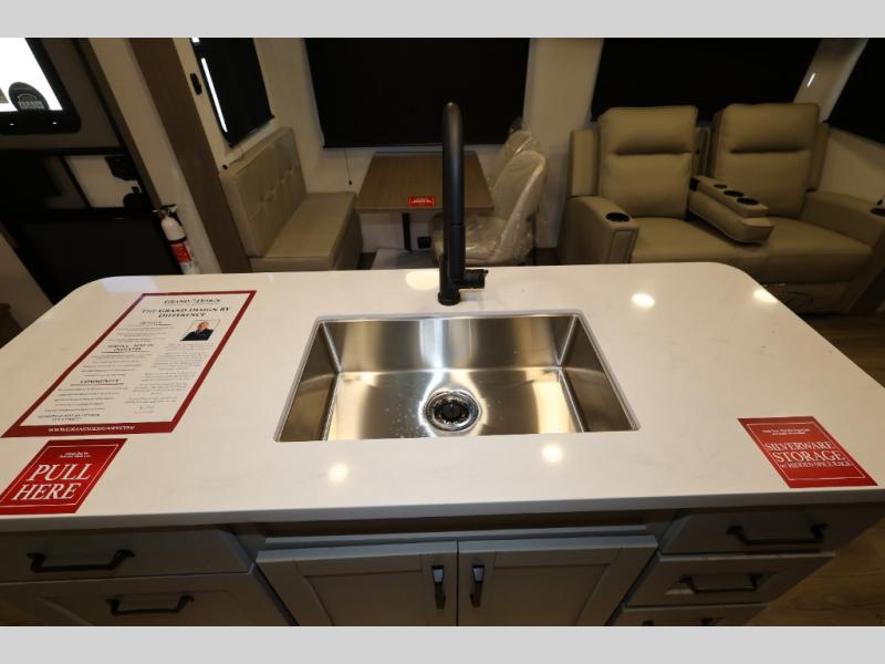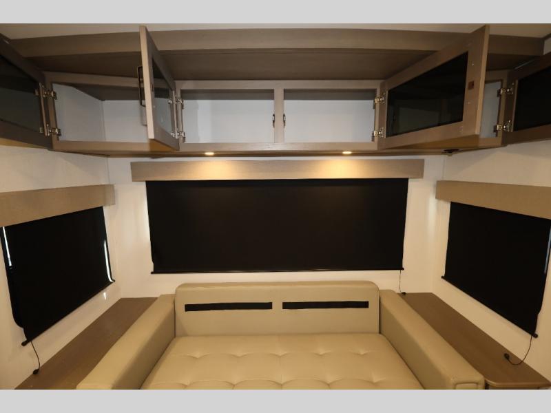 You can enjoy a spacious rear living area in this RV with dual opposing slides offering you entertainment, kitchen amenities, seating and windows for great views! The rear tri-fold sofa also converts into extra sleeping space for an extra guest or two, just like the booth dinette does. Yet you might like to add the swivel dinette option. There are theater seats to enjoy while you place your drinks in the cupholders and watch the entertainment center with a 40" LED HDTV and fireplace. The pantry is big enough to store your favorite snacks, and the kitchen island will make meal prepping easier, plus there is a 16 cu. ft. refrigerator to store any leftovers. The full bathroom has a 30" x 48" fiberglass shower and a linen closet to store your towels. The front private bedroom has a comfortable queen bed slide that can be switched out for the optional king bed, a dresser with overhead cabinets, and a full wall wardrobe that is prepped to add the optional washer and dryer so that you can extend your camping trip with clean clothes!
