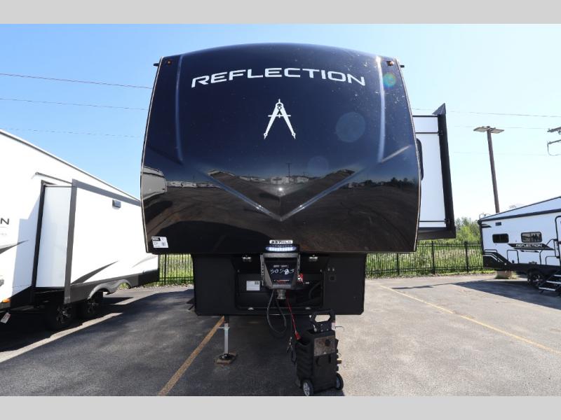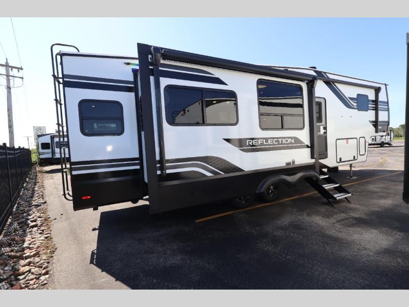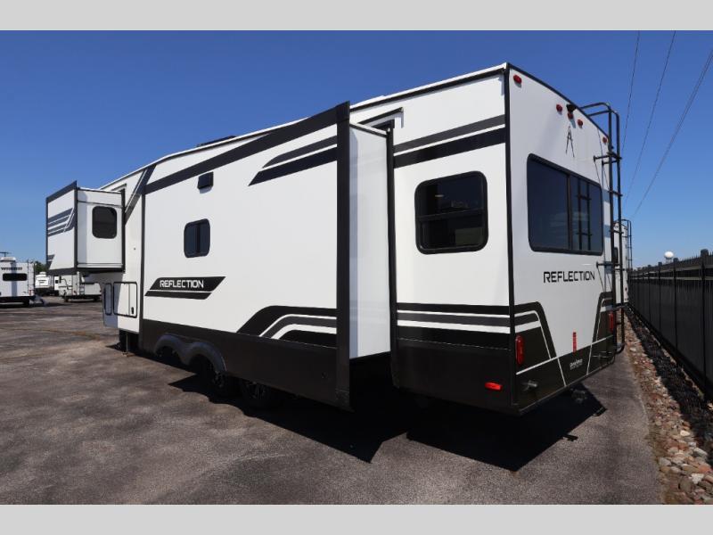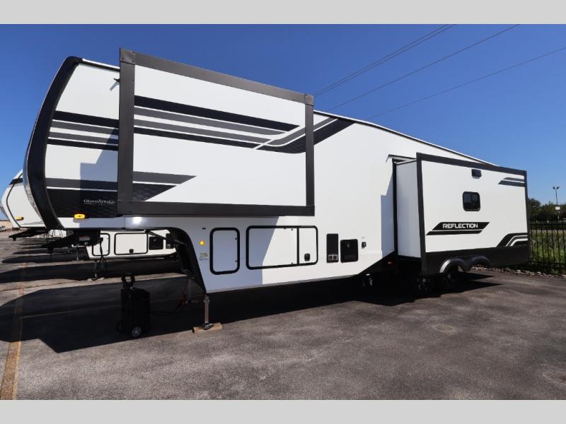 With any Reflection fifth wheel by Grand Design, you will have a solar panel for off-grid camping and a 60 amp charge controller and inverter prep, a Universal All-In-One docking station, unobstructed pass-through storage, and Goodyear Endurance tires. Each is constructed of gel coat exterior sidewalls, residential 5" truss rafters, walk-on roof decking, a fiberglass and radiant foil roof and front cap insulation plus laminated aluminum framed side walls, roof and end walls in slide rooms. Head inside to enjoy residential hardwood cabinet doors, premium Congoleum flooring, a spacious shower with a glass door, and many more comforts!
