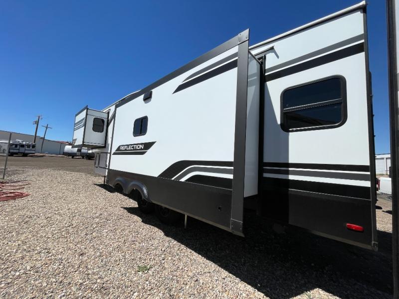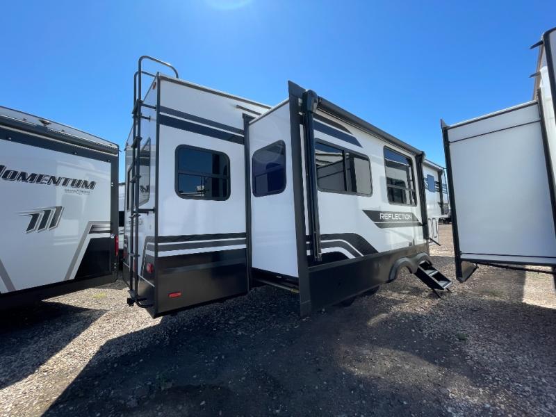 With any Reflection fifth wheel by Grand Design, you will have a solar panel for off-grid camping and a 60 amp charge controller and inverter prep, a Universal All-In-One docking station, unobstructed pass-through storage, and Goodyear Endurance tires. Each is constructed of gel coat exterior sidewalls, residential 5" truss rafters, walk-on roof decking, a fiberglass and radiant foil roof and front cap insulation plus laminated aluminum framed side walls, roof and end walls in slide rooms. Head inside to enjoy residential hardwood cabinet doors, premium Congoleum flooring, a spacious shower with a glass door, and many more comforts!