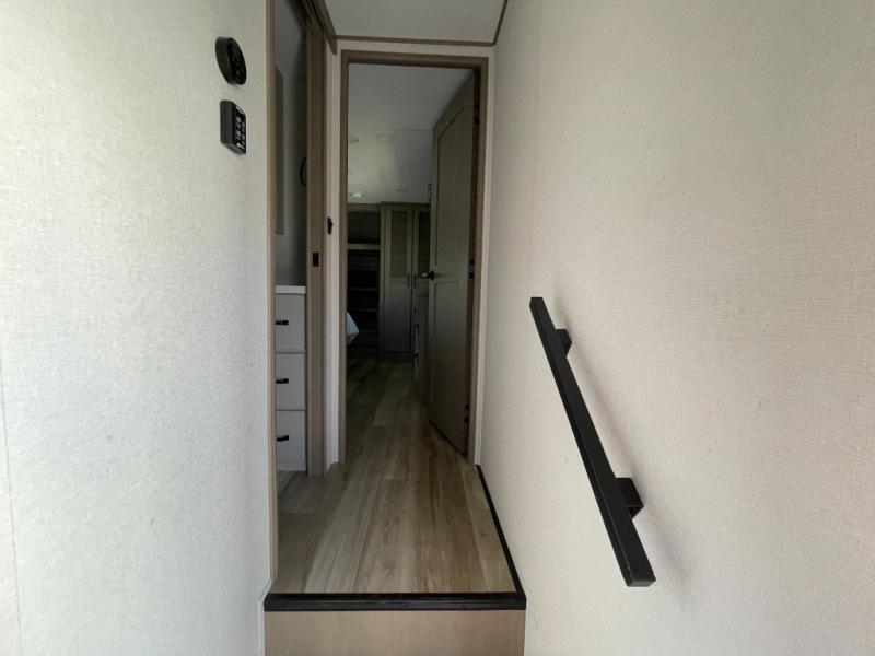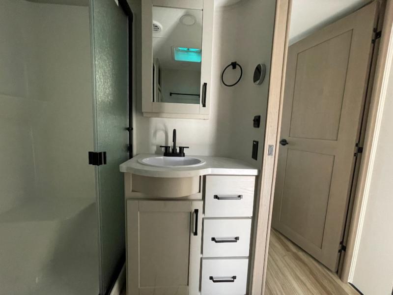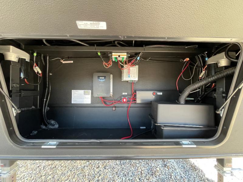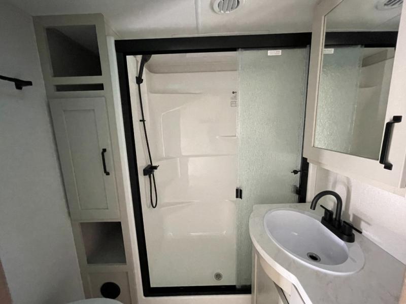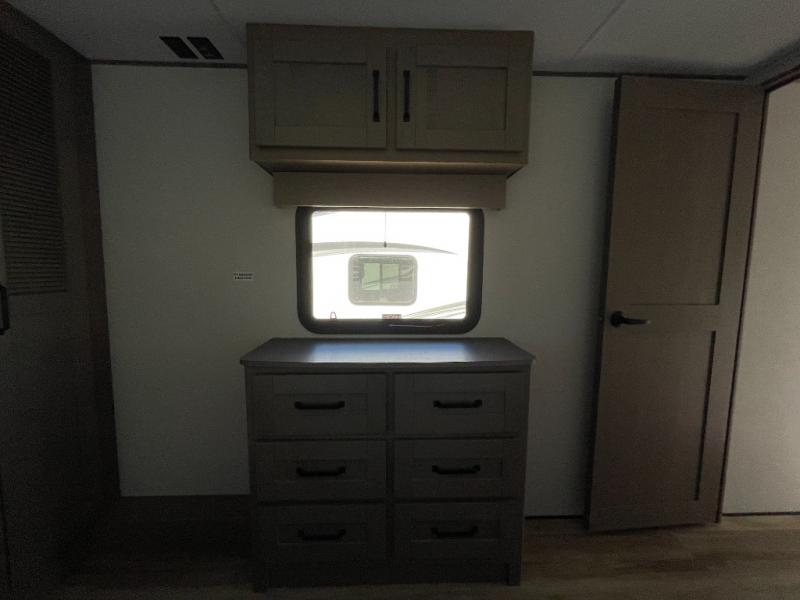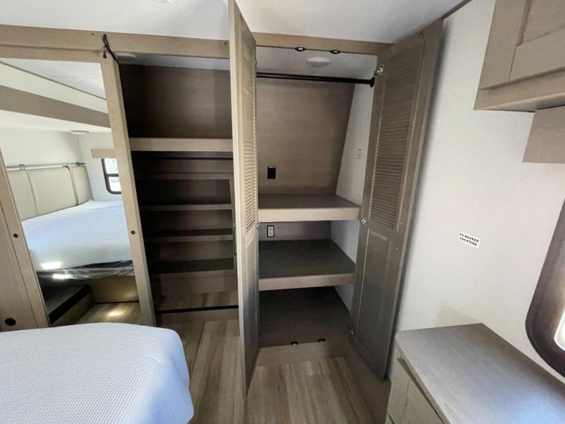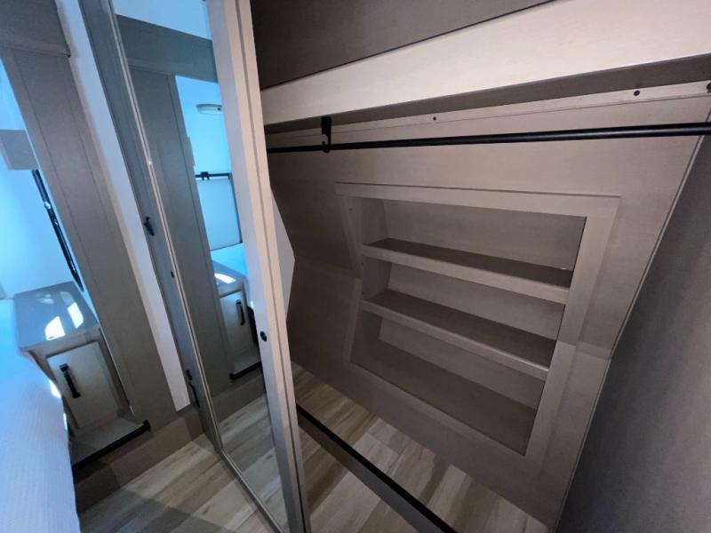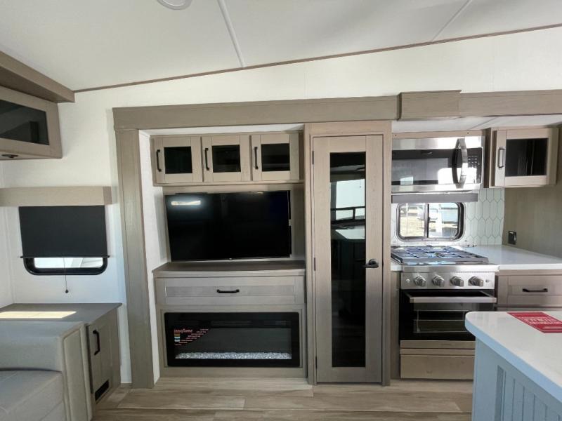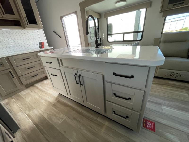 You can enjoy a spacious rear living area in this RV with dual opposing slides offering you entertainment, kitchen amenities, seating and windows for great views! The rear tri-fold sofa also converts into extra sleeping space for an extra guest or two, just like the booth dinette does. Yet you might like to add the swivel dinette option. There are theater seats to enjoy while you place your drinks in the cupholders and watch the entertainment center with a 40" LED HDTV and fireplace. The pantry is big enough to store your favorite snacks, and the kitchen island will make meal prepping easier, plus there is a 16 cu. ft. refrigerator to store any leftovers. The full bathroom has a 30" x 48" fiberglass shower and a linen closet to store your towels. The front private bedroom has a comfortable queen bed slide that can be switched out for the optional king bed, a dresser with overhead cabinets, and a full wall wardrobe that is prepped to add the optional washer and dryer so that you can extend your camping trip with clean clothes!