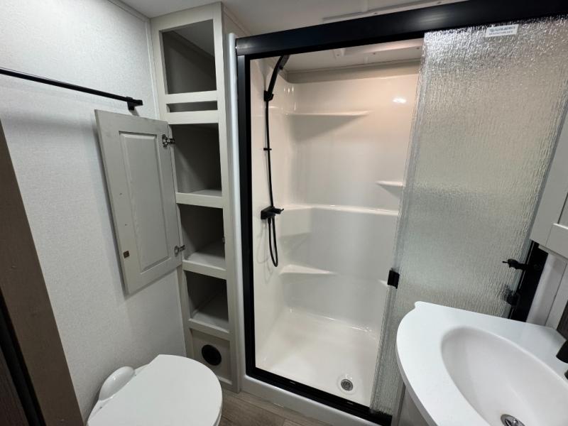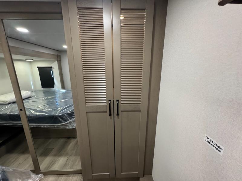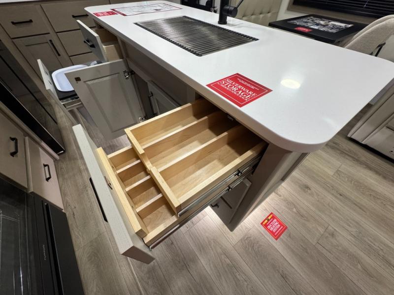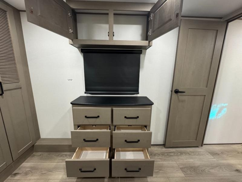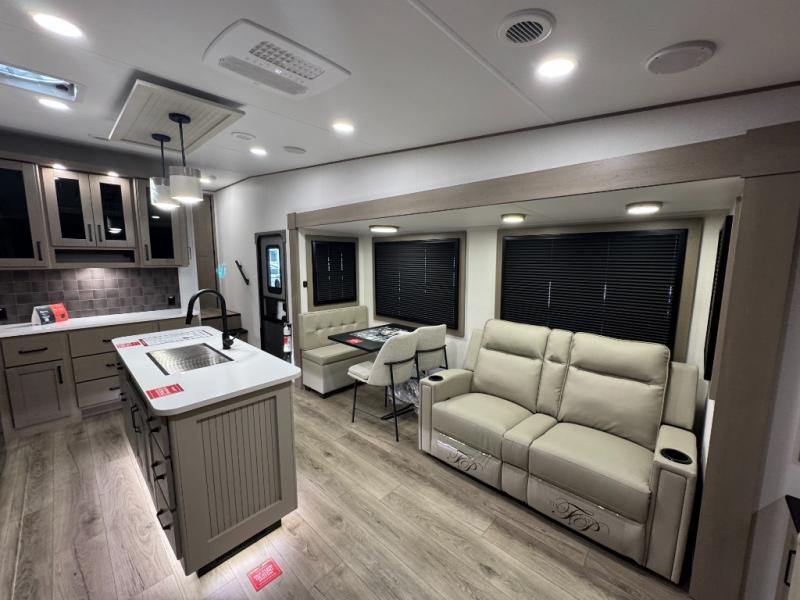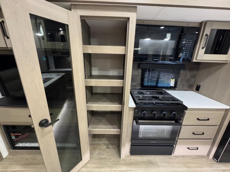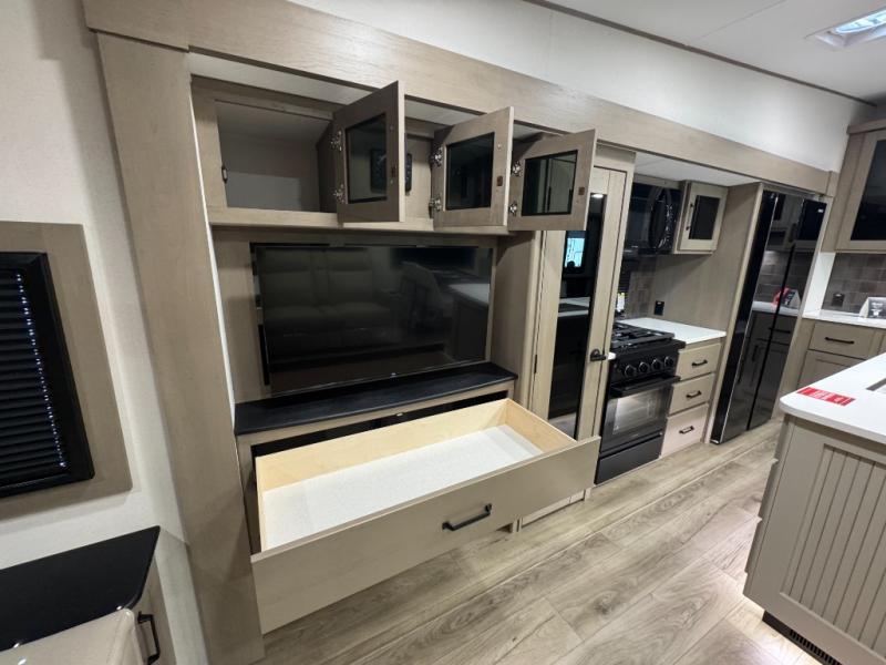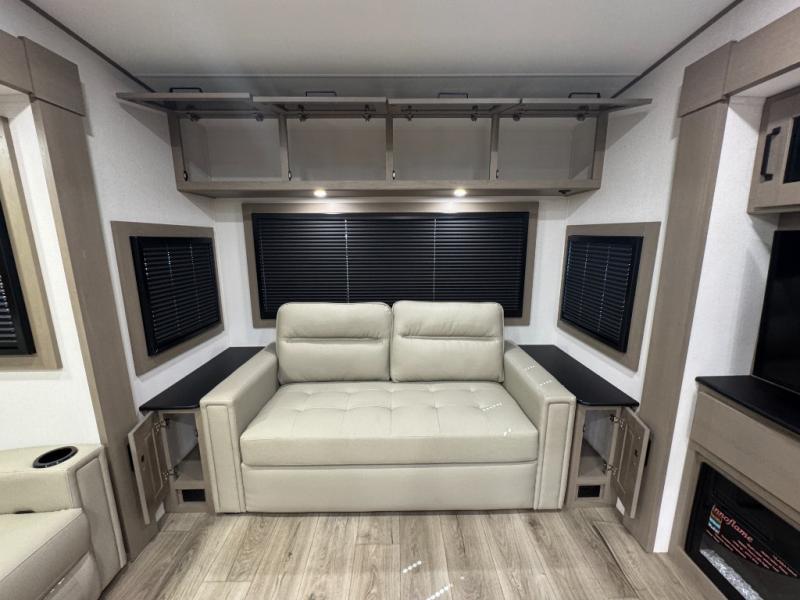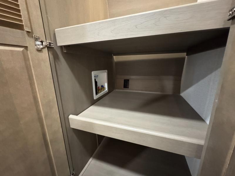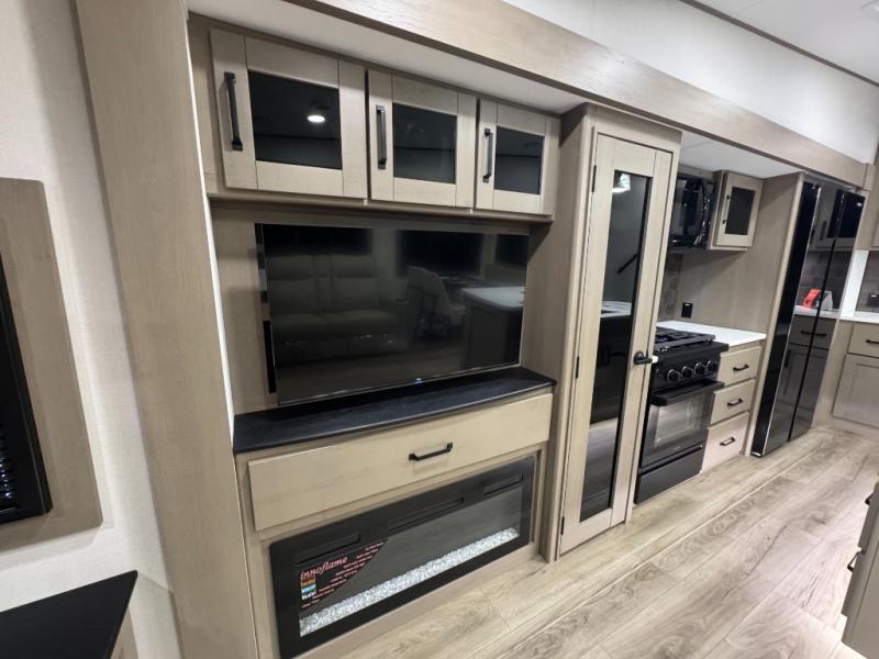 You can enjoy a spacious rear living area in this RV with dual opposing slides offering you entertainment, kitchen amenities, seating and windows for great views! The rear tri-fold sofa also converts into extra sleeping space for an extra guest or two, just like the booth dinette does. Yet you might like to add the swivel dinette option. There are theater seats to enjoy while you place your drinks in the cupholders and watch the entertainment center with a 40" LED HDTV and fireplace. The pantry is big enough to store your favorite snacks, and the kitchen island will make meal prepping easier, plus there is a 16 cu. ft. refrigerator to store any leftovers. The full bathroom has a 30" x 48" fiberglass shower and a linen closet to store your towels. The front private bedroom has a comfortable queen bed slide that can be switched out for the optional king bed, a dresser with overhead cabinets, and a full wall wardrobe that is prepped to add the optional washer and dryer so that you can extend your camping trip with clean clothes!