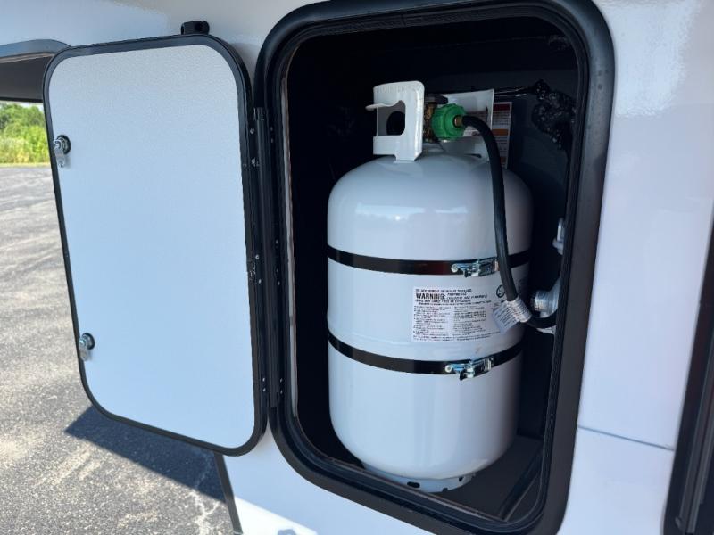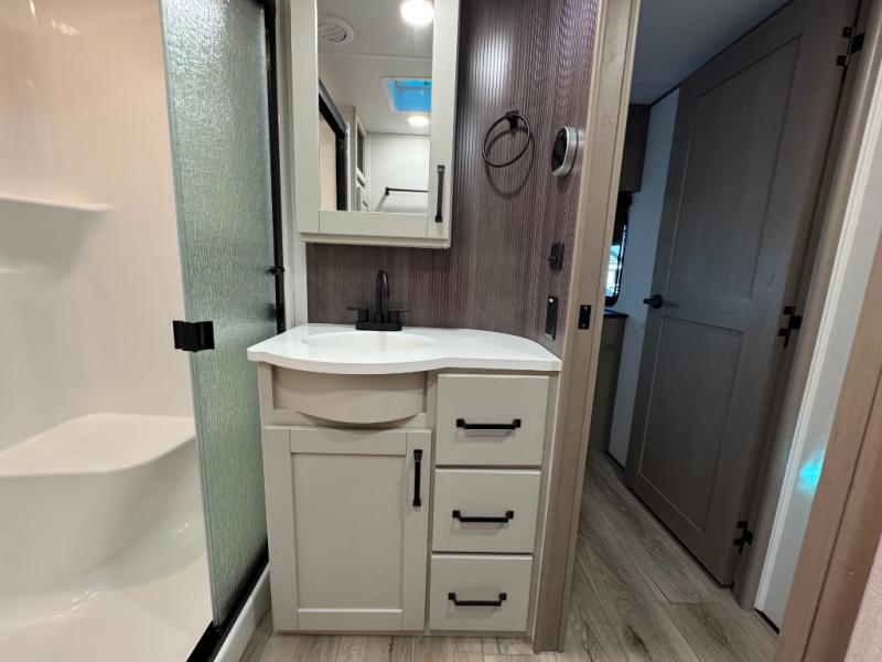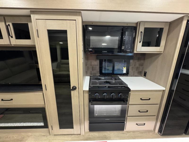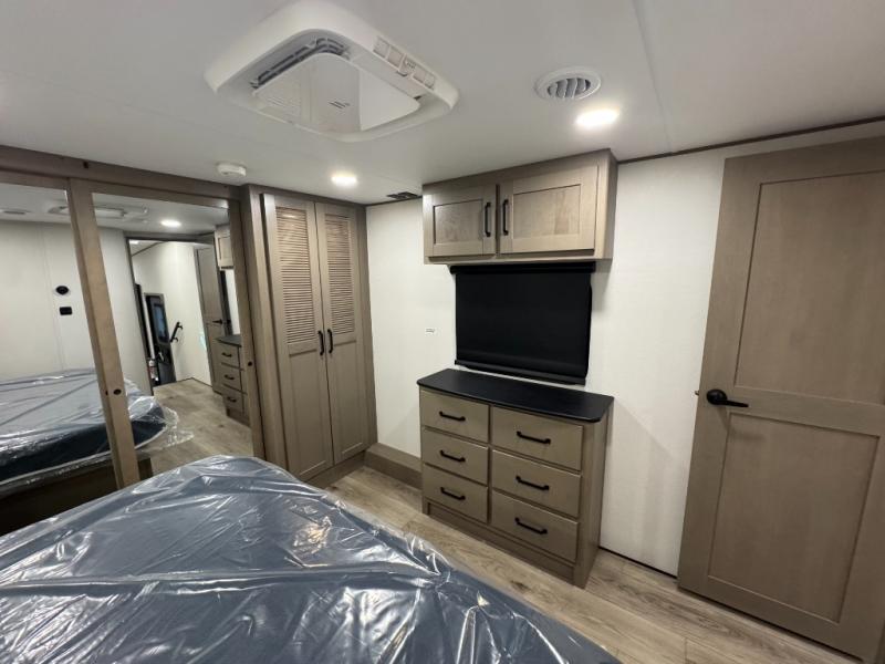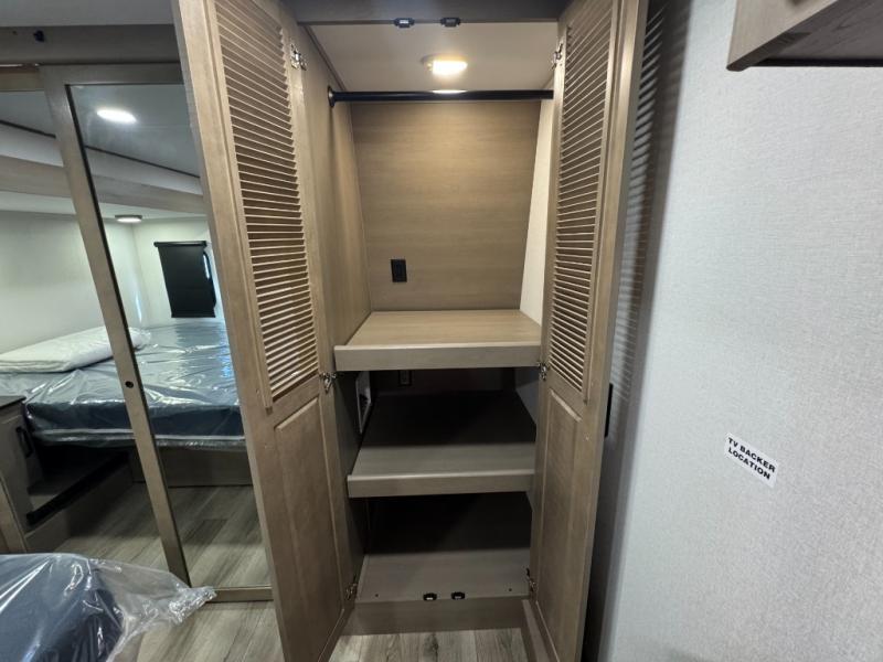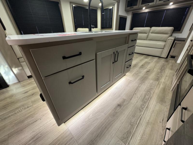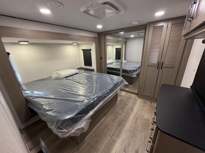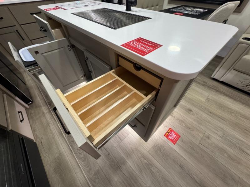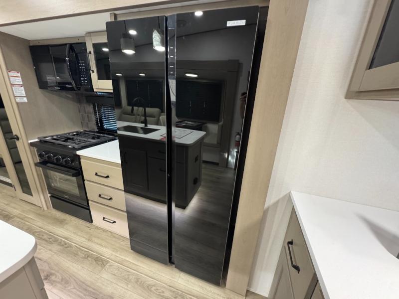 You can enjoy a spacious rear living area in this RV with dual opposing slides offering you entertainment, kitchen amenities, seating and windows for great views! The rear tri-fold sofa also converts into extra sleeping space for an extra guest or two, just like the booth dinette does. Yet you might like to add the swivel dinette option. There are theater seats to enjoy while you place your drinks in the cupholders and watch the entertainment center with a 40" LED HDTV and fireplace. The pantry is big enough to store your favorite snacks, and the kitchen island will make meal prepping easier, plus there is a 16 cu. ft. refrigerator to store any leftovers. The full bathroom has a 30" x 48" fiberglass shower and a linen closet to store your towels. The front private bedroom has a comfortable queen bed slide that can be switched out for the optional king bed, a dresser with overhead cabinets, and a full wall wardrobe that is prepped to add the optional washer and dryer so that you can extend your camping trip with clean clothes!
