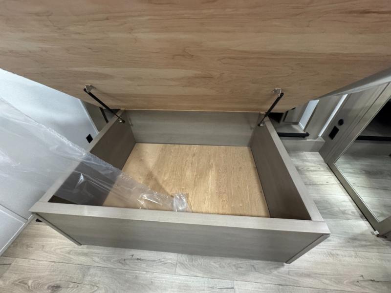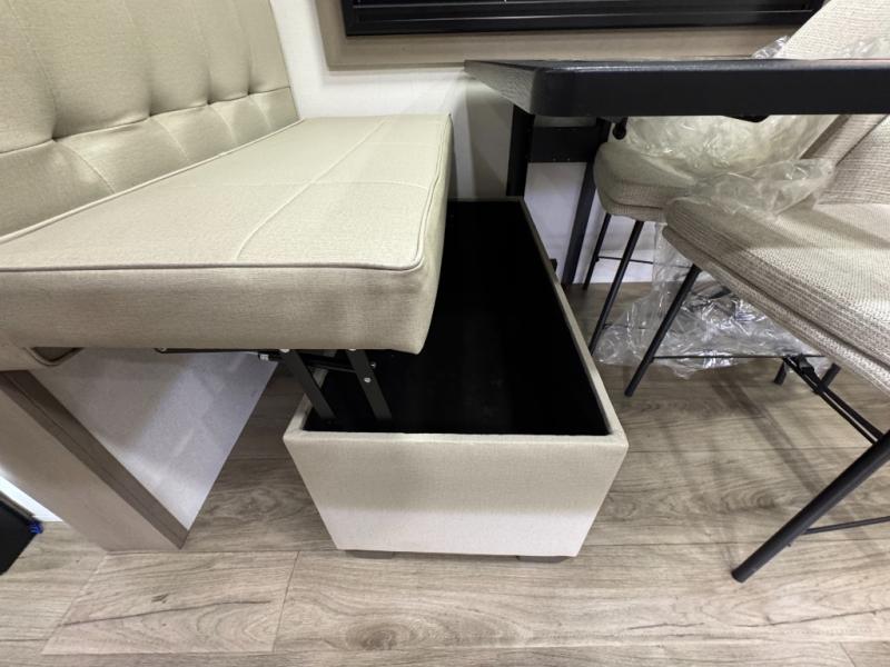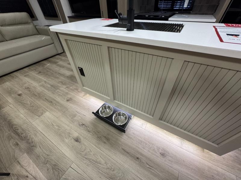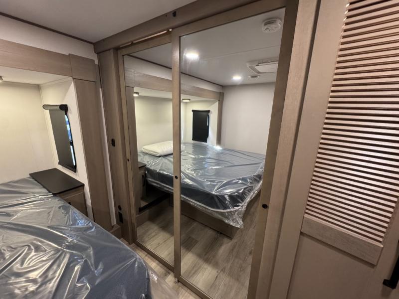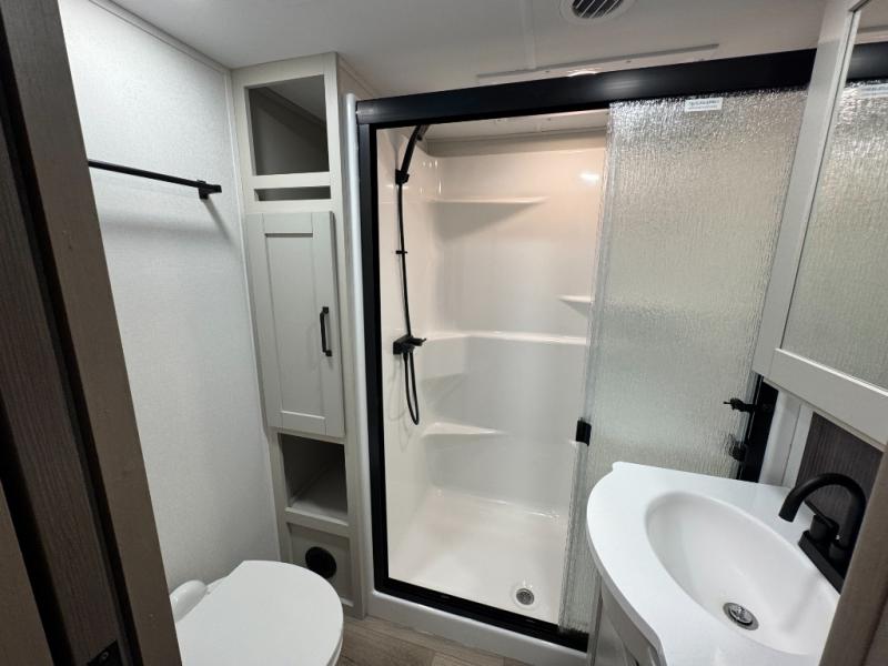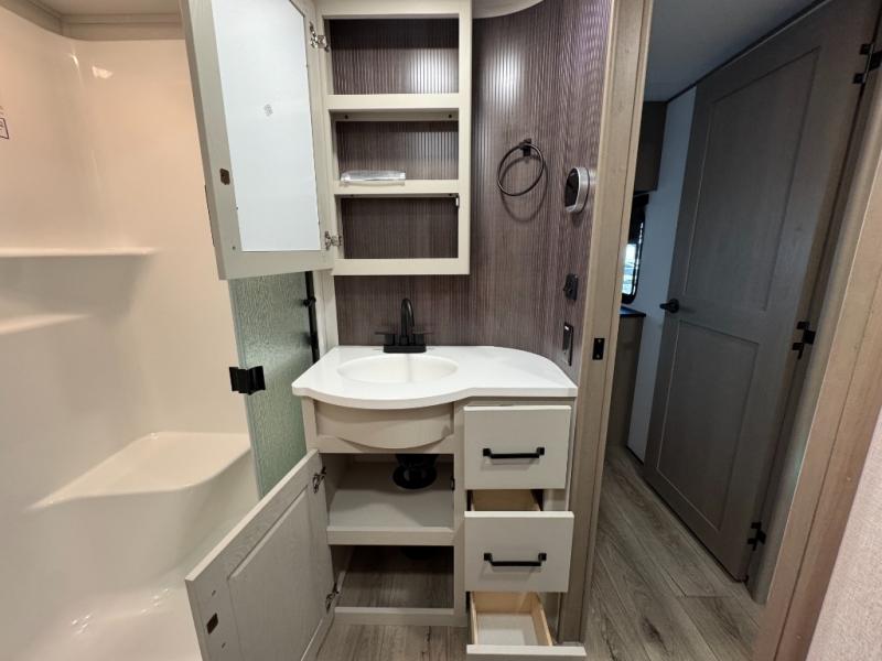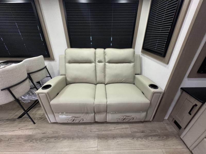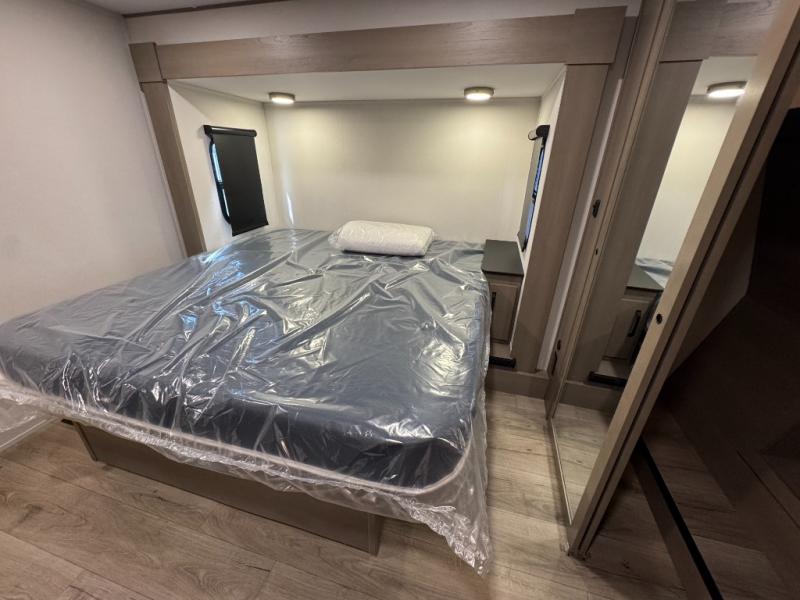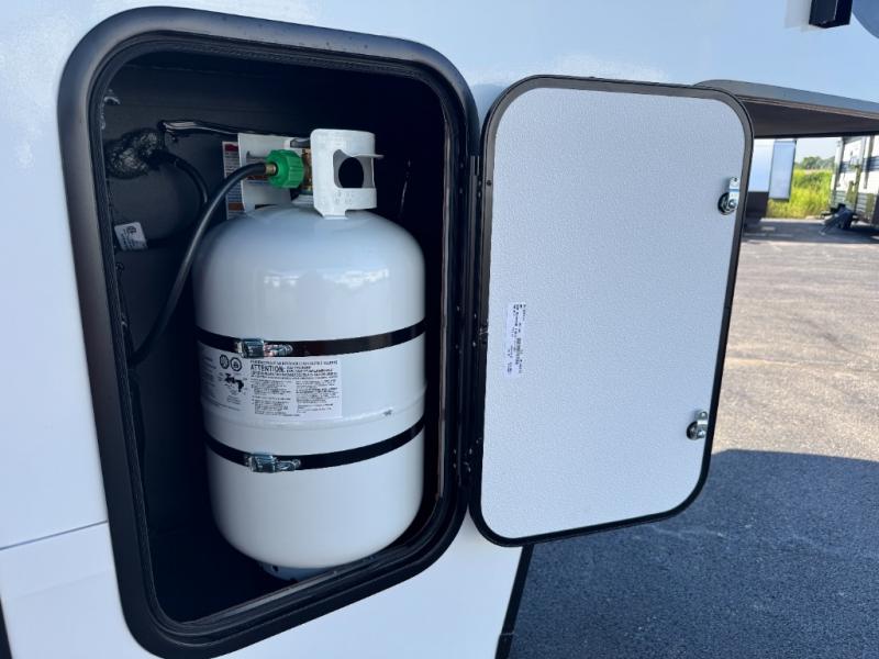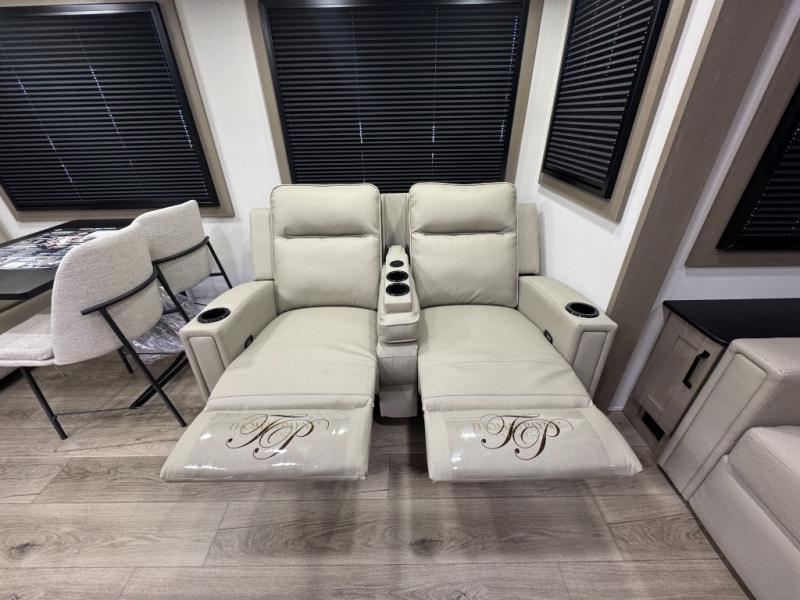 You can enjoy a spacious rear living area in this RV with dual opposing slides offering you entertainment, kitchen amenities, seating and windows for great views! The rear tri-fold sofa also converts into extra sleeping space for an extra guest or two, just like the booth dinette does. Yet you might like to add the swivel dinette option. There are theater seats to enjoy while you place your drinks in the cupholders and watch the entertainment center with a 40" LED HDTV and fireplace. The pantry is big enough to store your favorite snacks, and the kitchen island will make meal prepping easier, plus there is a 16 cu. ft. refrigerator to store any leftovers. The full bathroom has a 30" x 48" fiberglass shower and a linen closet to store your towels. The front private bedroom has a comfortable queen bed slide that can be switched out for the optional king bed, a dresser with overhead cabinets, and a full wall wardrobe that is prepped to add the optional washer and dryer so that you can extend your camping trip with clean clothes!