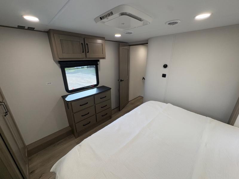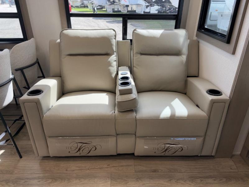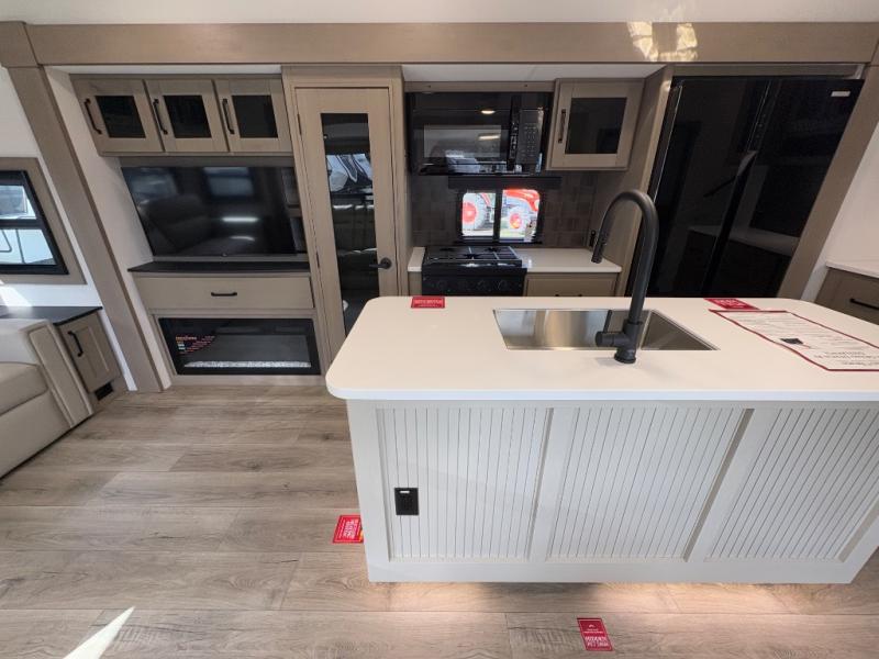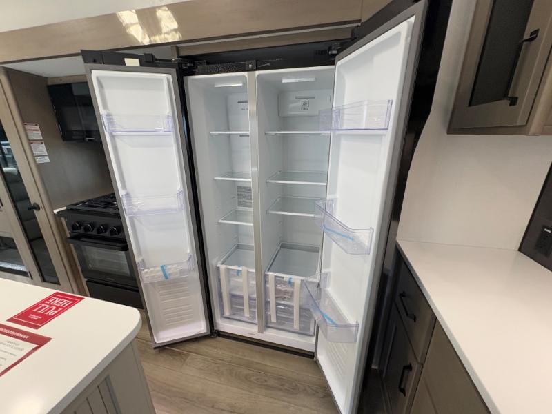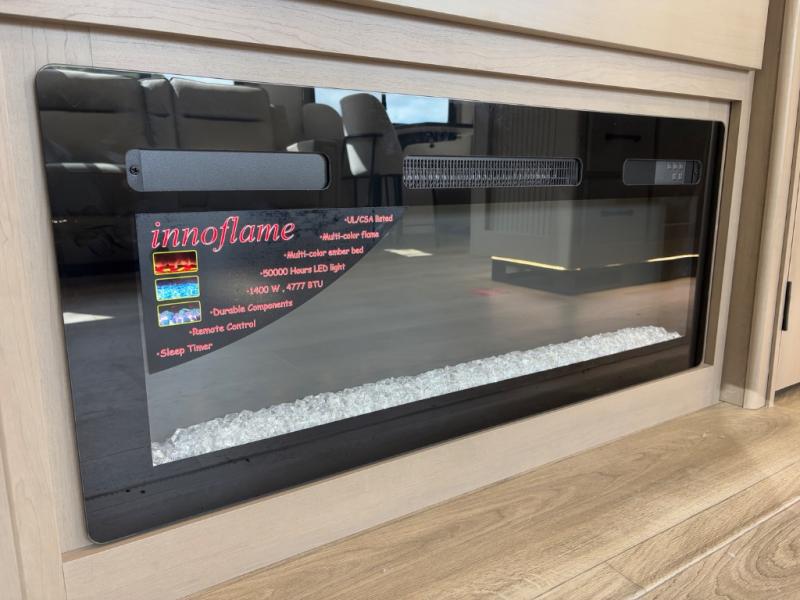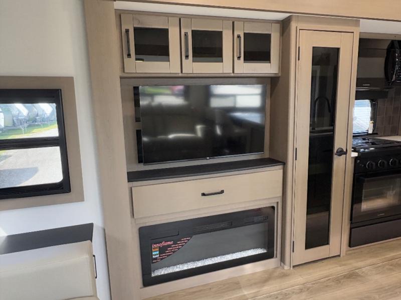 You can enjoy a spacious rear living area in this RV with dual opposing slides offering you entertainment, kitchen amenities, seating and windows for great views! The rear tri-fold sofa also converts into extra sleeping space for an extra guest or two, just like the booth dinette does. Yet you might like to add the swivel dinette option. There are theater seats to enjoy while you place your drinks in the cupholders and watch the entertainment center with a 40" LED HDTV and fireplace. The pantry is big enough to store your favorite snacks, and the kitchen island will make meal prepping easier, plus there is a 16 cu. ft. refrigerator to store any leftovers. The full bathroom has a 30" x 48" fiberglass shower and a linen closet to store your towels. The front private bedroom has a comfortable queen bed slide that can be switched out for the optional king bed, a dresser with overhead cabinets, and a full wall wardrobe that is prepped to add the optional washer and dryer so that you can extend your camping trip with clean clothes!
