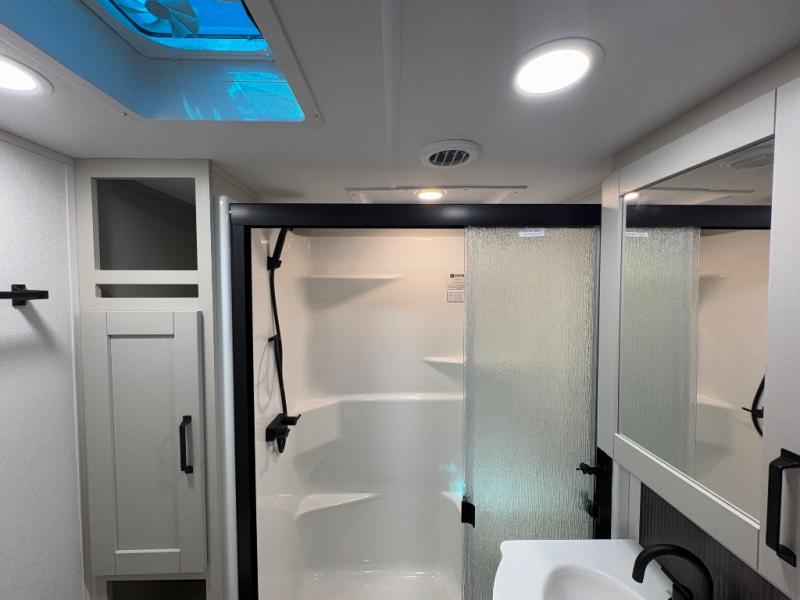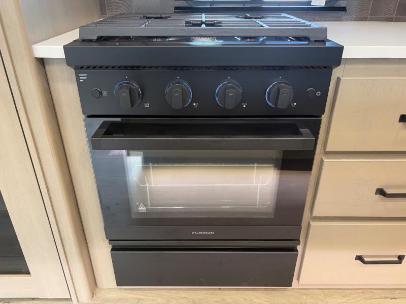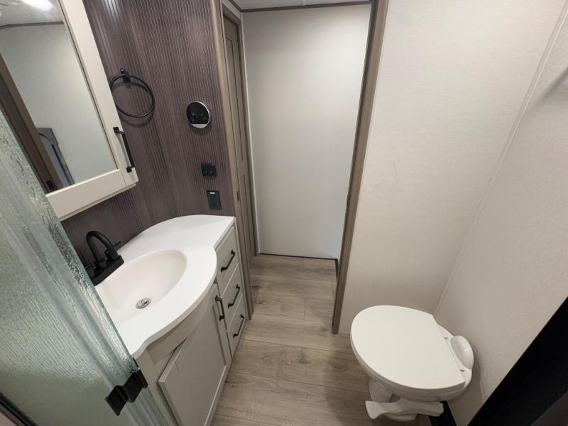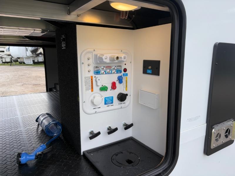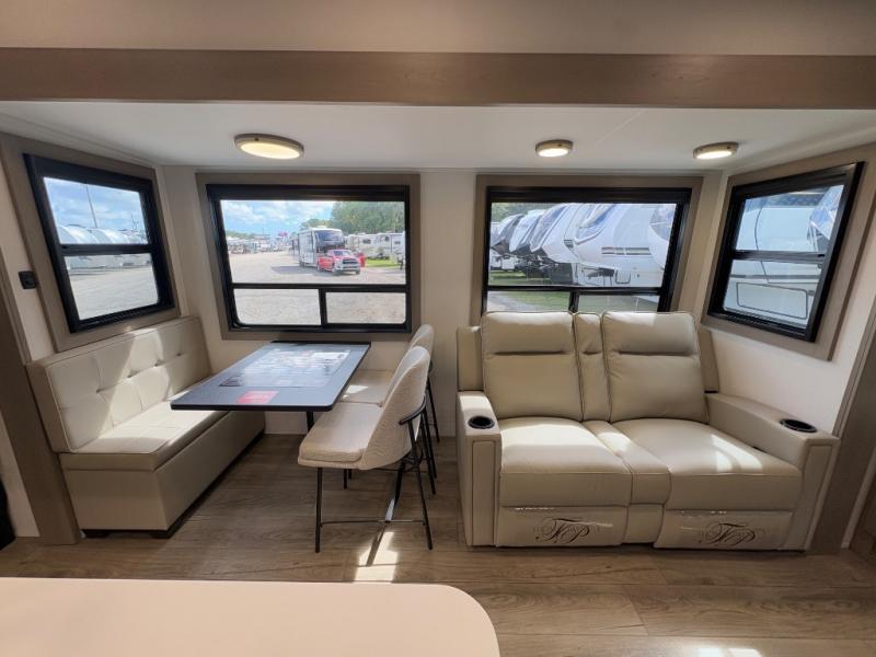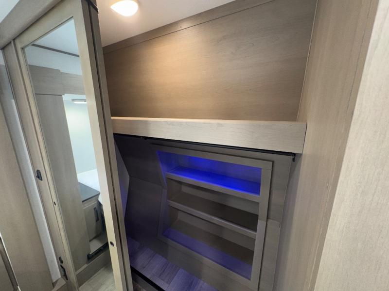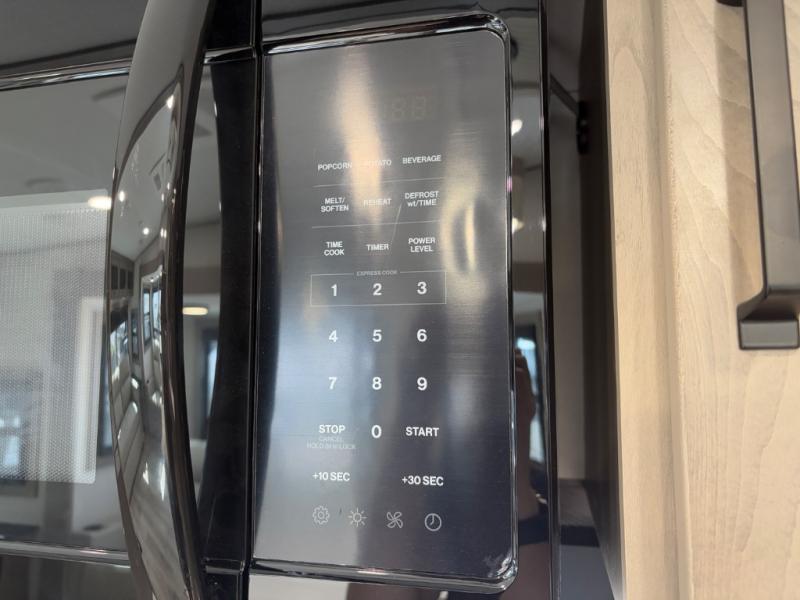 You can enjoy a spacious rear living area in this RV with dual opposing slides offering you entertainment, kitchen amenities, seating and windows for great views! The rear tri-fold sofa also converts into extra sleeping space for an extra guest or two, just like the booth dinette does. Yet you might like to add the swivel dinette option. There are theater seats to enjoy while you place your drinks in the cupholders and watch the entertainment center with a 40" LED HDTV and fireplace. The pantry is big enough to store your favorite snacks, and the kitchen island will make meal prepping easier, plus there is a 16 cu. ft. refrigerator to store any leftovers. The full bathroom has a 30" x 48" fiberglass shower and a linen closet to store your towels. The front private bedroom has a comfortable queen bed slide that can be switched out for the optional king bed, a dresser with overhead cabinets, and a full wall wardrobe that is prepped to add the optional washer and dryer so that you can extend your camping trip with clean clothes!