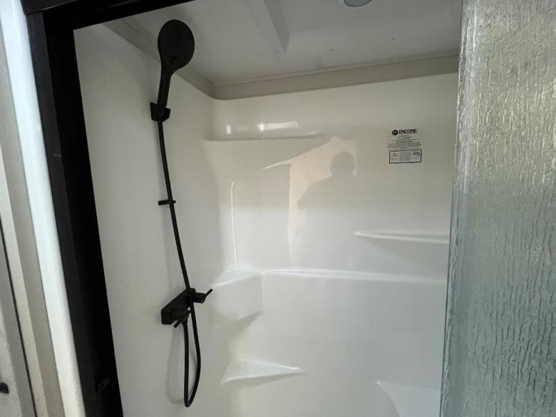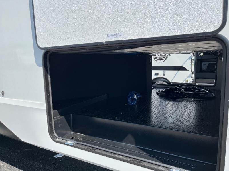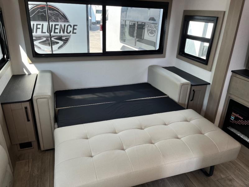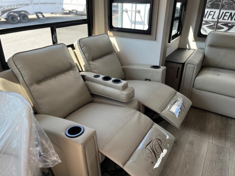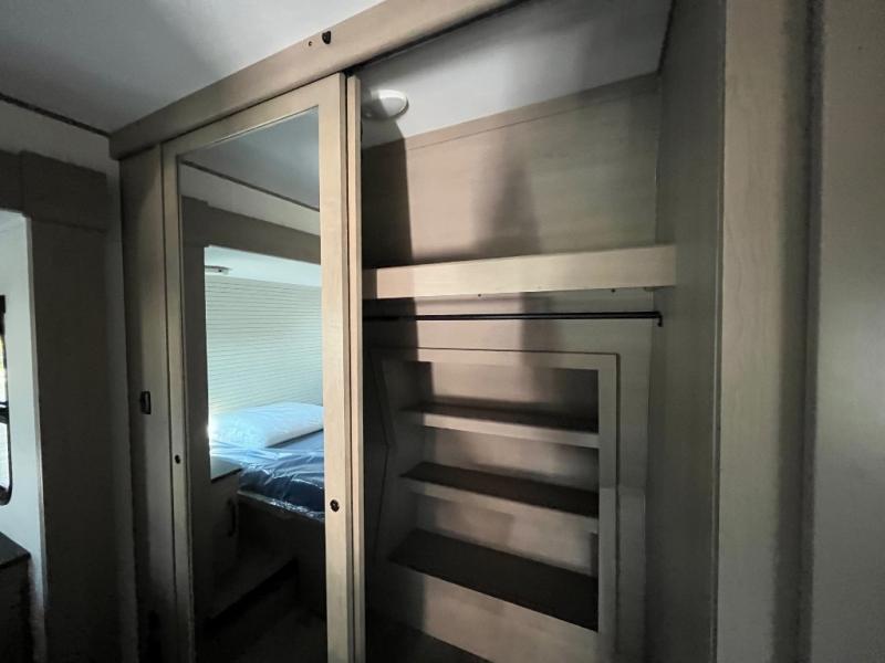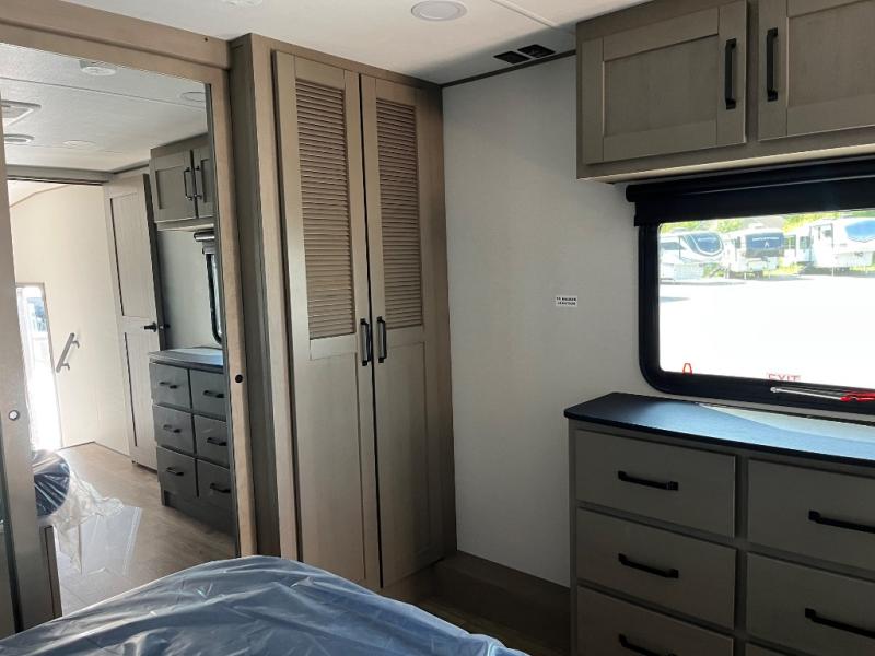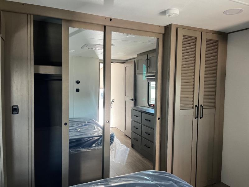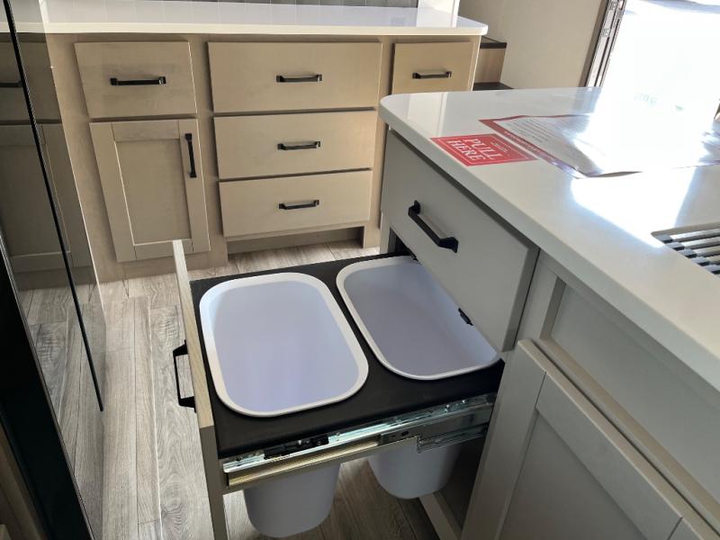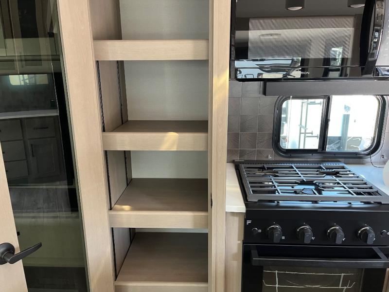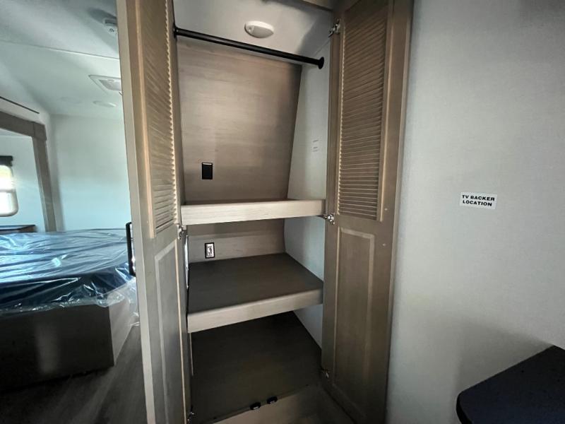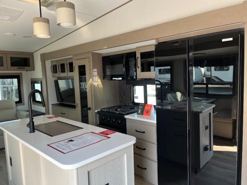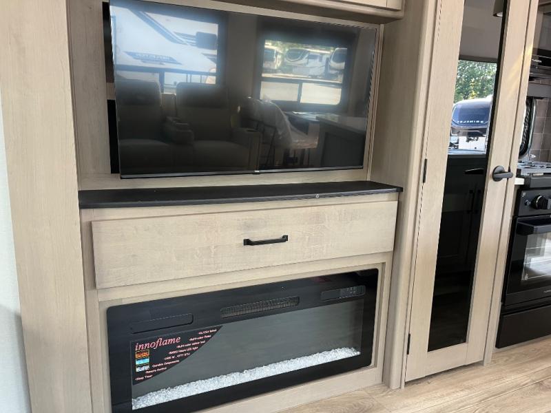 You can enjoy a spacious rear living area in this RV with dual opposing slides offering you entertainment, kitchen amenities, seating and windows for great views! The rear tri-fold sofa also converts into extra sleeping space for an extra guest or two, just like the booth dinette does. Yet you might like to add the swivel dinette option. There are theater seats to enjoy while you place your drinks in the cupholders and watch the entertainment center with a 40" LED HDTV and fireplace. The pantry is big enough to store your favorite snacks, and the kitchen island will make meal prepping easier, plus there is a 16 cu. ft. refrigerator to store any leftovers. The full bathroom has a 30" x 48" fiberglass shower and a linen closet to store your towels. The front private bedroom has a comfortable queen bed slide that can be switched out for the optional king bed, a dresser with overhead cabinets, and a full wall wardrobe that is prepped to add the optional washer and dryer so that you can extend your camping trip with clean clothes!