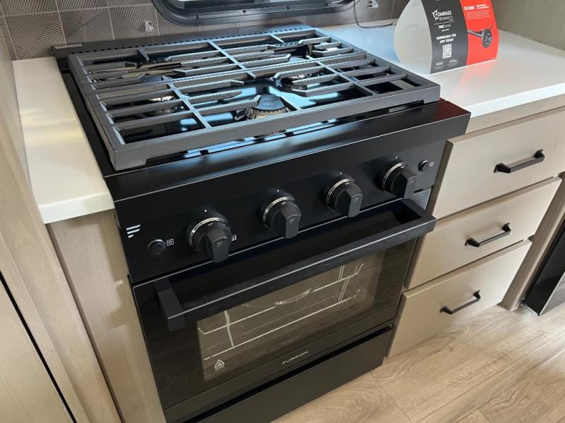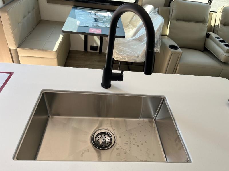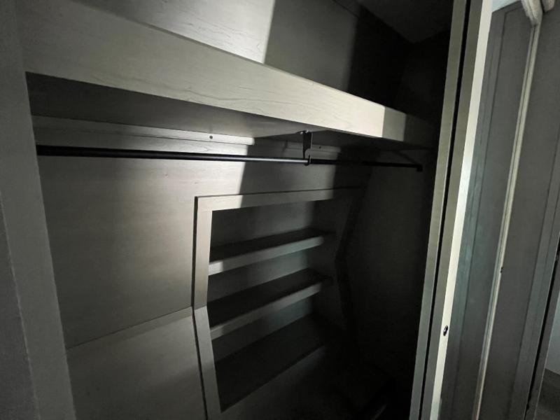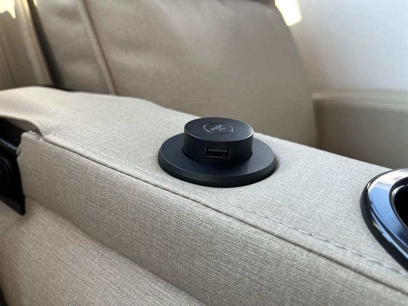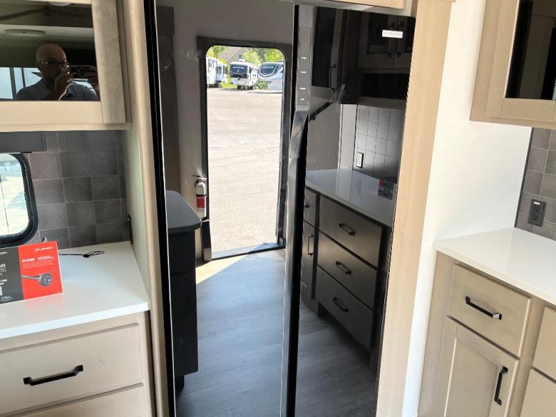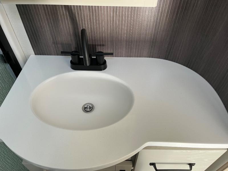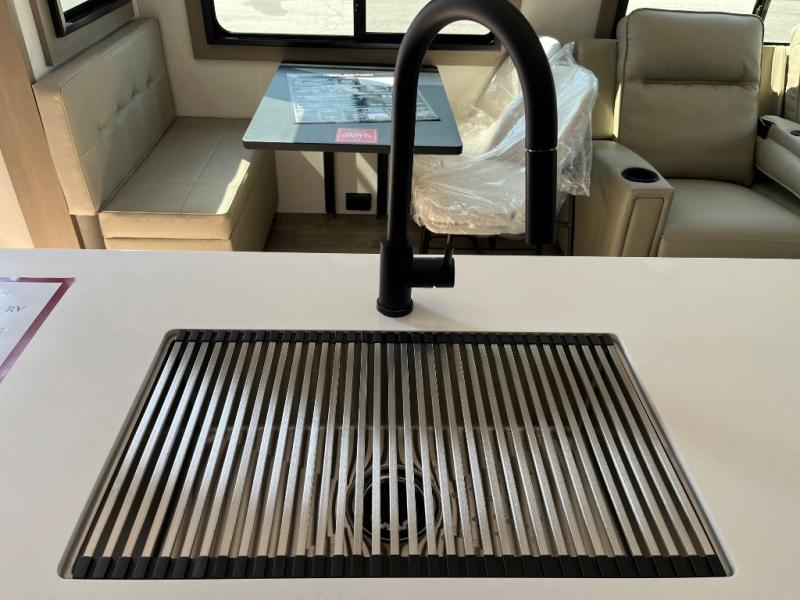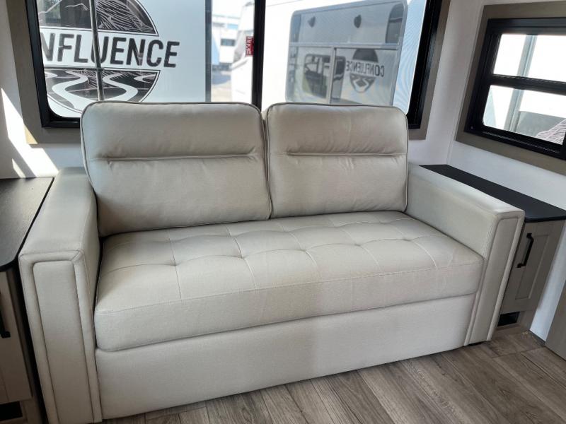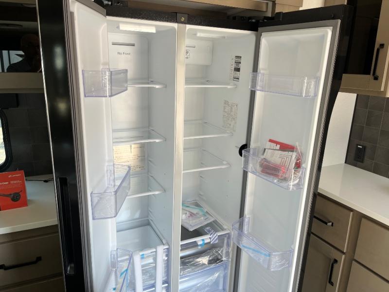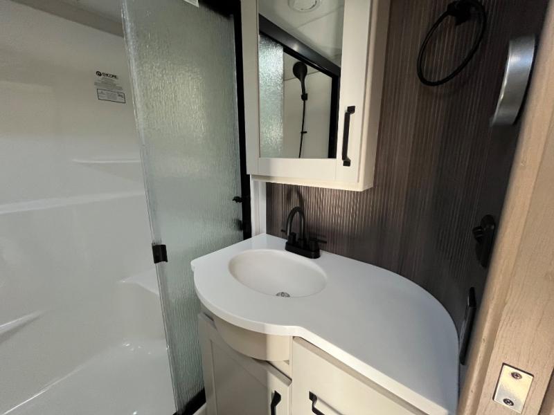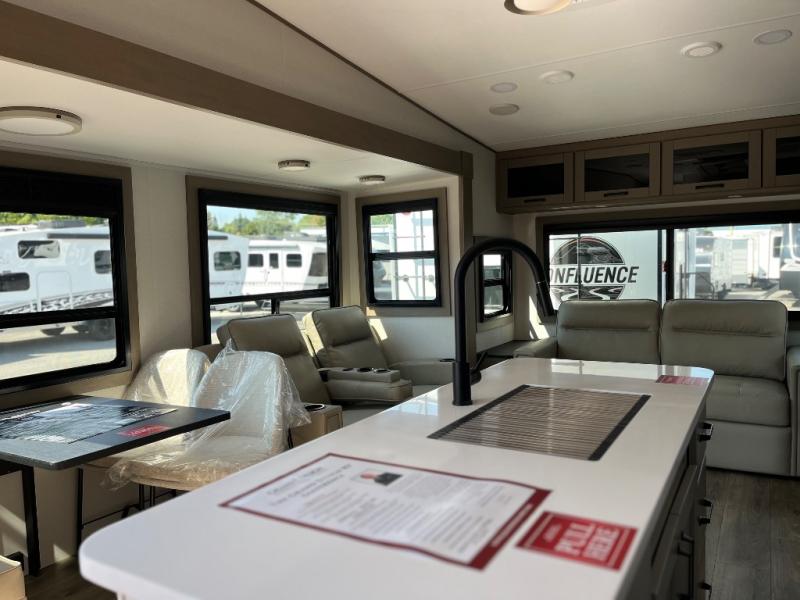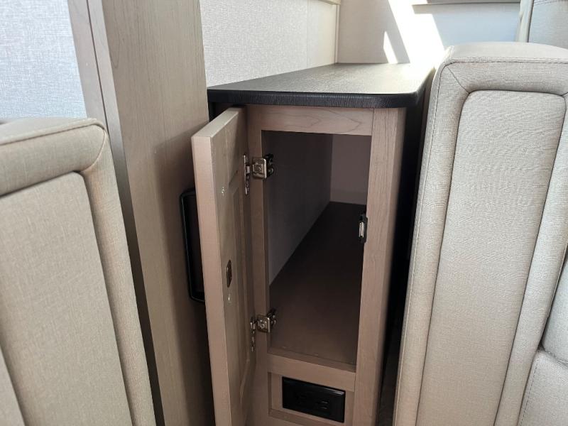You can enjoy a spacious rear living area in this RV with dual opposing slides offering you entertainment, kitchen amenities, seating and windows for great views! The rear tri-fold sofa also converts into extra sleeping space for an extra guest or two, just like the booth dinette does. Yet you might like to add the swivel dinette option. There are theater seats to enjoy while you place your drinks in the cupholders and watch the entertainment center with a 40" LED HDTV and fireplace. The pantry is big enough to store your favorite snacks, and the kitchen island will make meal prepping easier, plus there is a 16 cu. ft. refrigerator to store any leftovers. The full bathroom has a 30" x 48" fiberglass shower and a linen closet to store your towels. The front private bedroom has a comfortable queen bed slide that can be switched out for the optional king bed, a dresser with overhead cabinets, and a full wall wardrobe that is prepped to add the optional washer and dryer so that you can extend your camping trip with clean clothes!