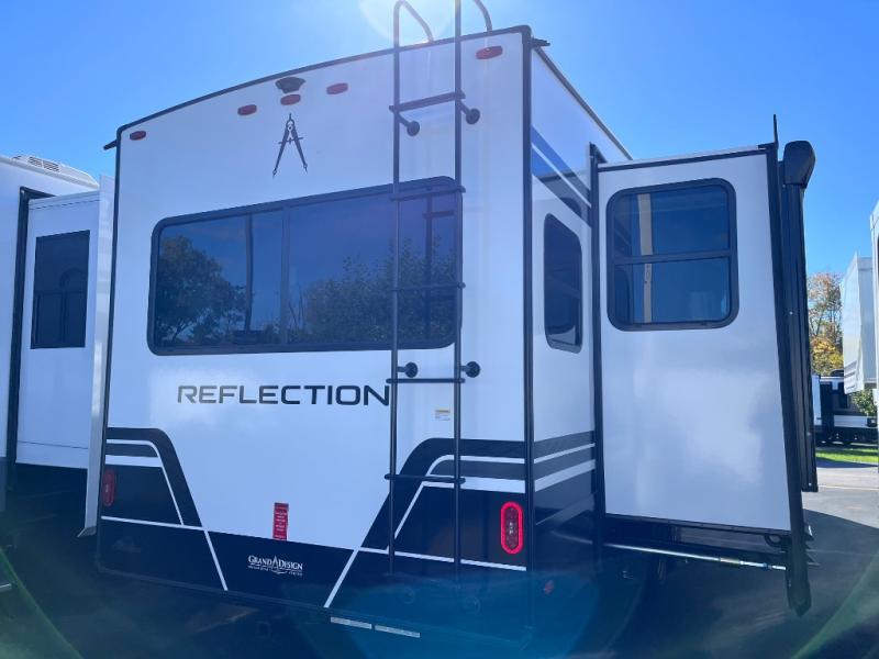 With any Reflection fifth wheel by Grand Design, you will have a solar panel for off-grid camping and a 60 amp charge controller and inverter prep, a Universal All-In-One docking station, unobstructed pass-through storage, and Goodyear Endurance tires. Each is constructed of gel coat exterior sidewalls, residential 5" truss rafters, walk-on roof decking, a fiberglass and radiant foil roof and front cap insulation plus laminated aluminum framed side walls, roof and end walls in slide rooms. Head inside to enjoy residential hardwood cabinet doors, premium Congoleum flooring, a spacious shower with a glass door, and many more comforts!