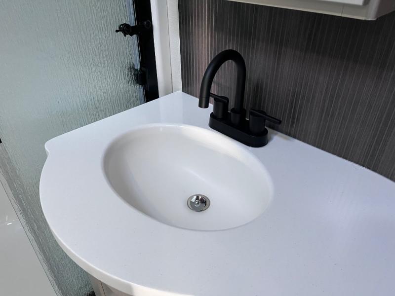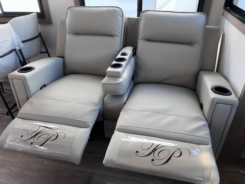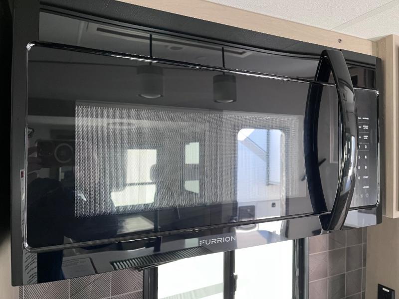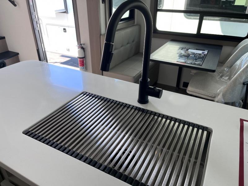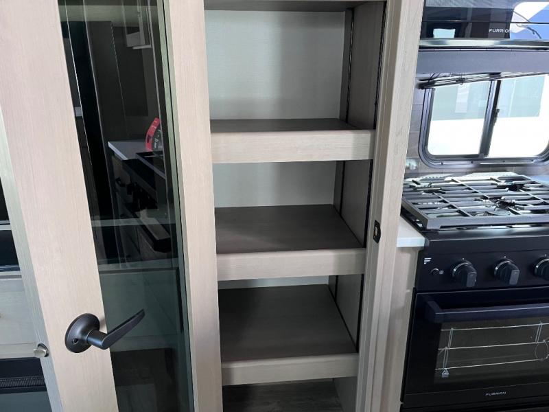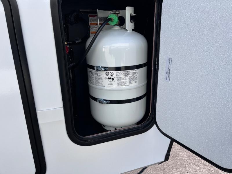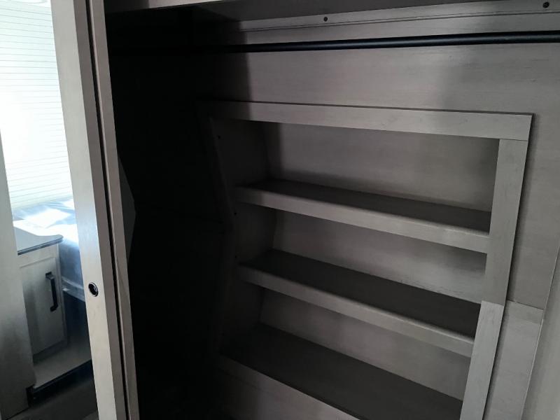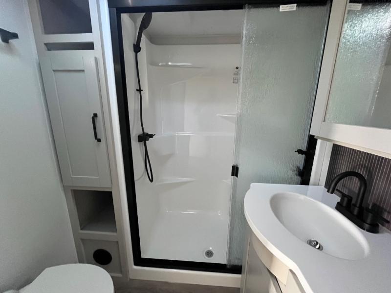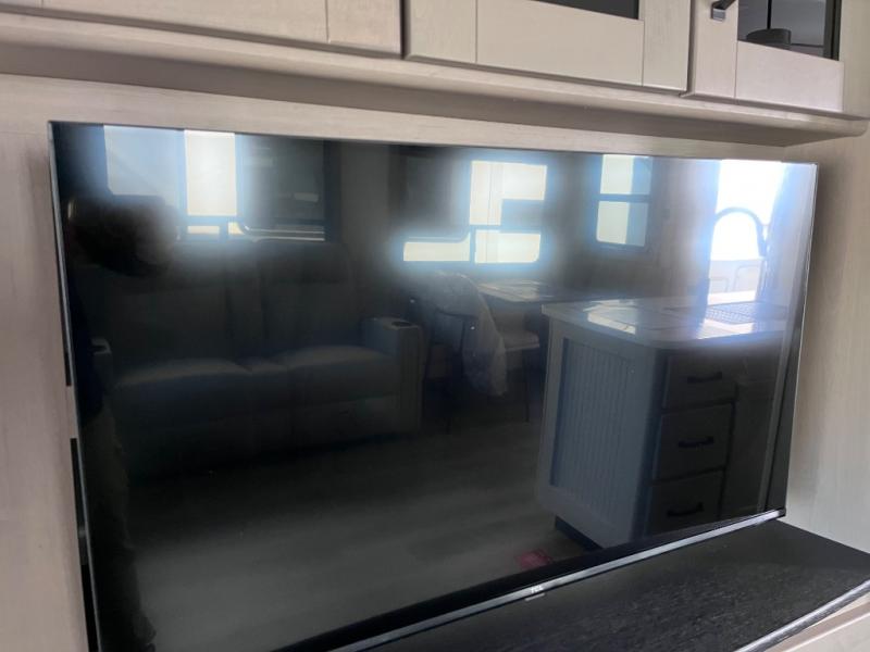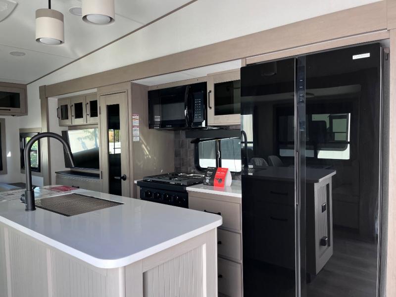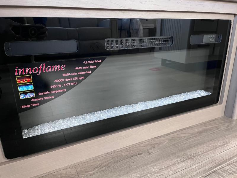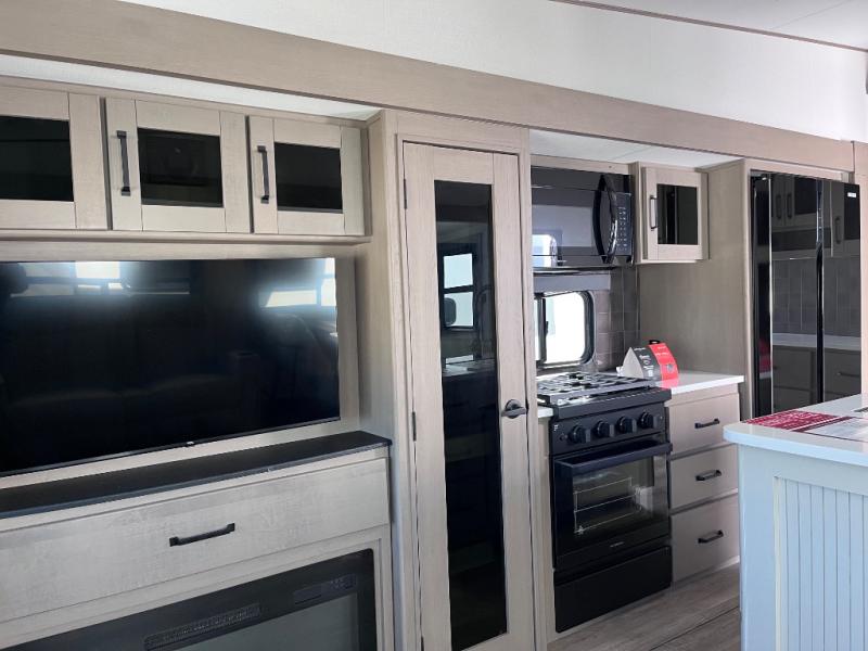 You can enjoy a spacious rear living area in this RV with dual opposing slides offering you entertainment, kitchen amenities, seating and windows for great views! The rear tri-fold sofa also converts into extra sleeping space for an extra guest or two, just like the booth dinette does. Yet you might like to add the swivel dinette option. There are theater seats to enjoy while you place your drinks in the cupholders and watch the entertainment center with a 40" LED HDTV and fireplace. The pantry is big enough to store your favorite snacks, and the kitchen island will make meal prepping easier, plus there is a 16 cu. ft. refrigerator to store any leftovers. The full bathroom has a 30" x 48" fiberglass shower and a linen closet to store your towels. The front private bedroom has a comfortable queen bed slide that can be switched out for the optional king bed, a dresser with overhead cabinets, and a full wall wardrobe that is prepped to add the optional washer and dryer so that you can extend your camping trip with clean clothes!