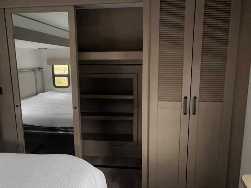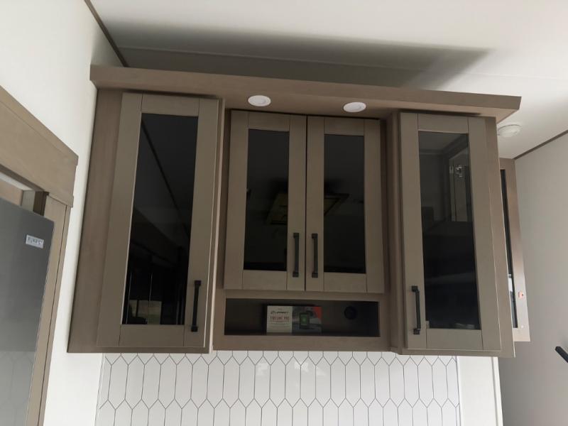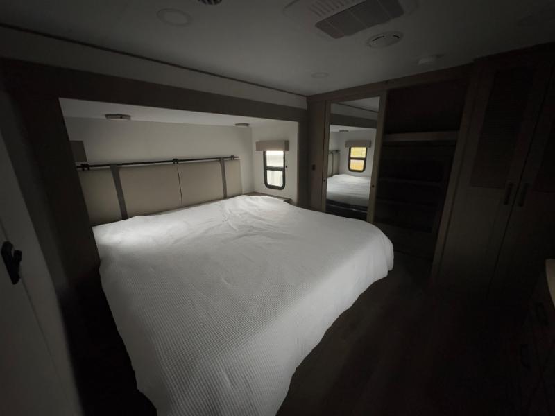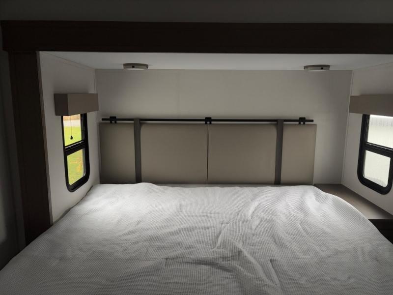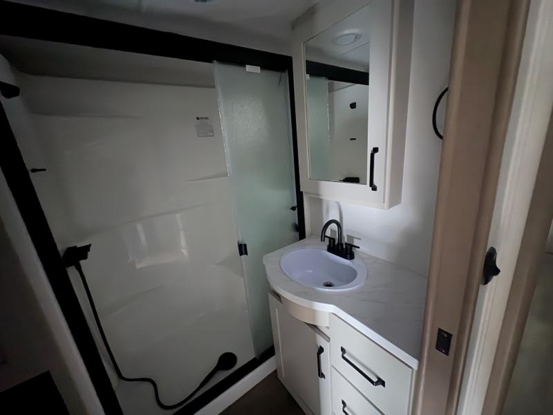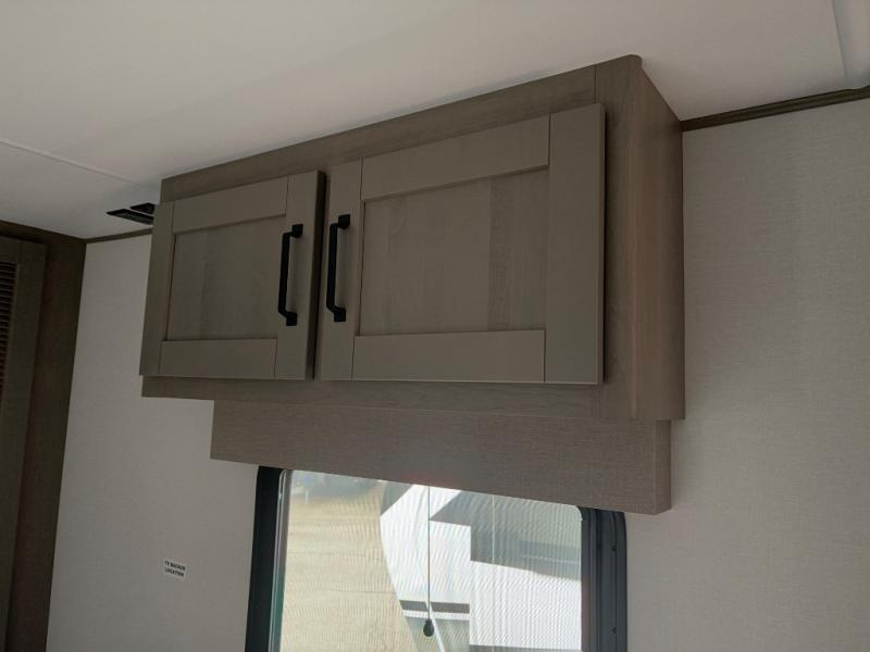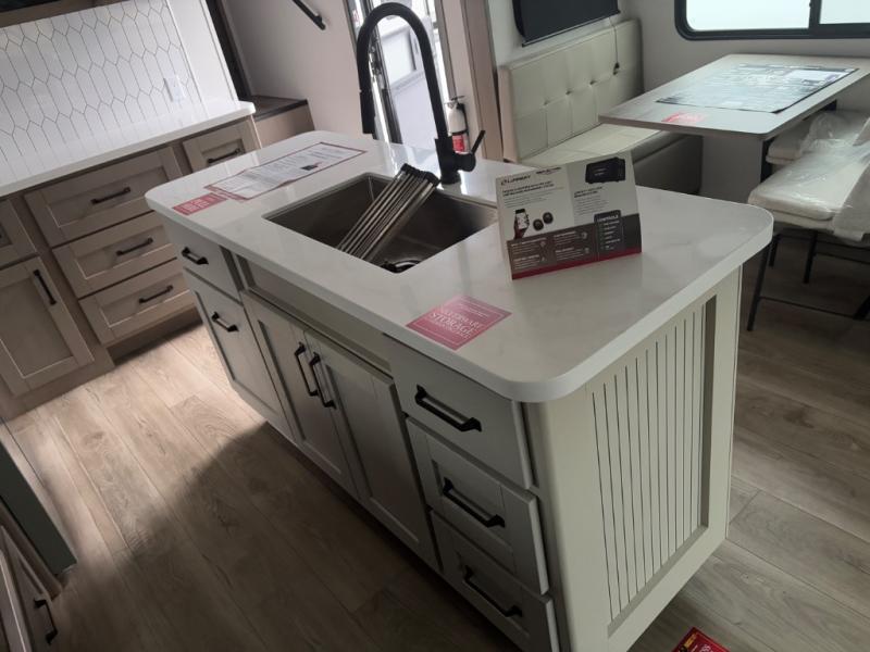 You can enjoy a spacious rear living area in this RV with dual opposing slides offering you entertainment, kitchen amenities, seating and windows for great views! The rear tri-fold sofa also converts into extra sleeping space for an extra guest or two, just like the booth dinette does. Yet you might like to add the swivel dinette option. There are theater seats to enjoy while you place your drinks in the cupholders and watch the entertainment center with a 40" LED HDTV and fireplace. The pantry is big enough to store your favorite snacks, and the kitchen island will make meal prepping easier, plus there is a 16 cu. ft. refrigerator to store any leftovers. The full bathroom has a 30" x 48" fiberglass shower and a linen closet to store your towels. The front private bedroom has a comfortable queen bed slide that can be switched out for the optional king bed, a dresser with overhead cabinets, and a full wall wardrobe that is prepped to add the optional washer and dryer so that you can extend your camping trip with clean clothes!