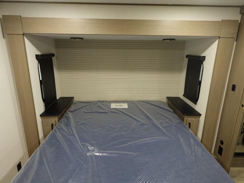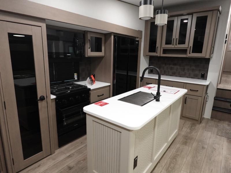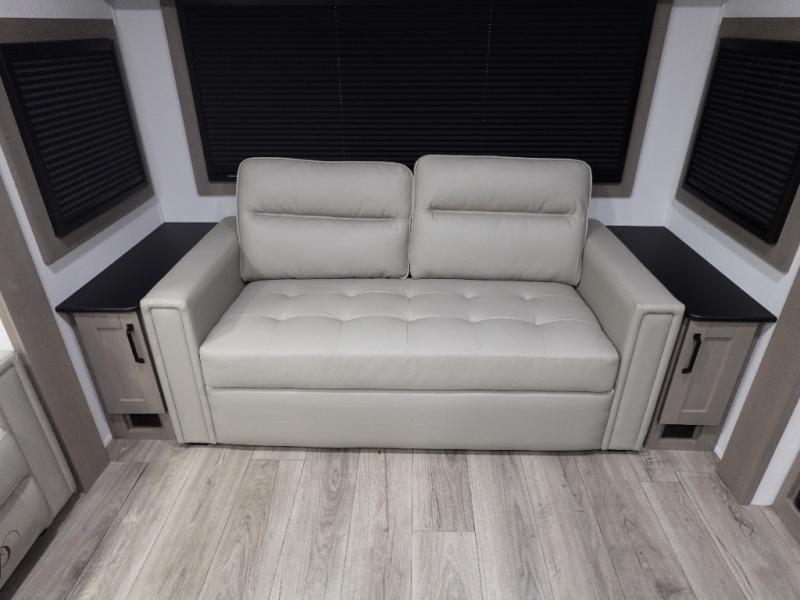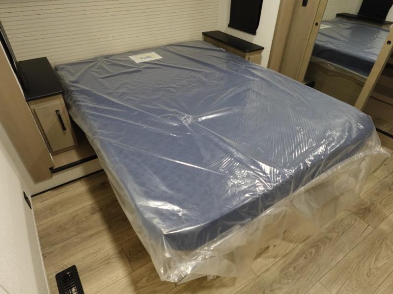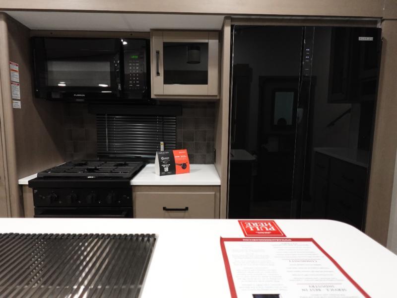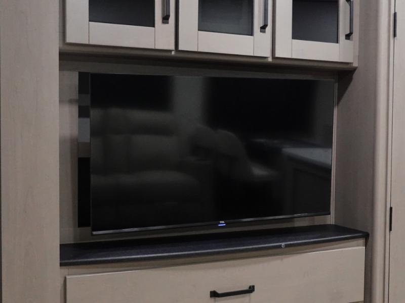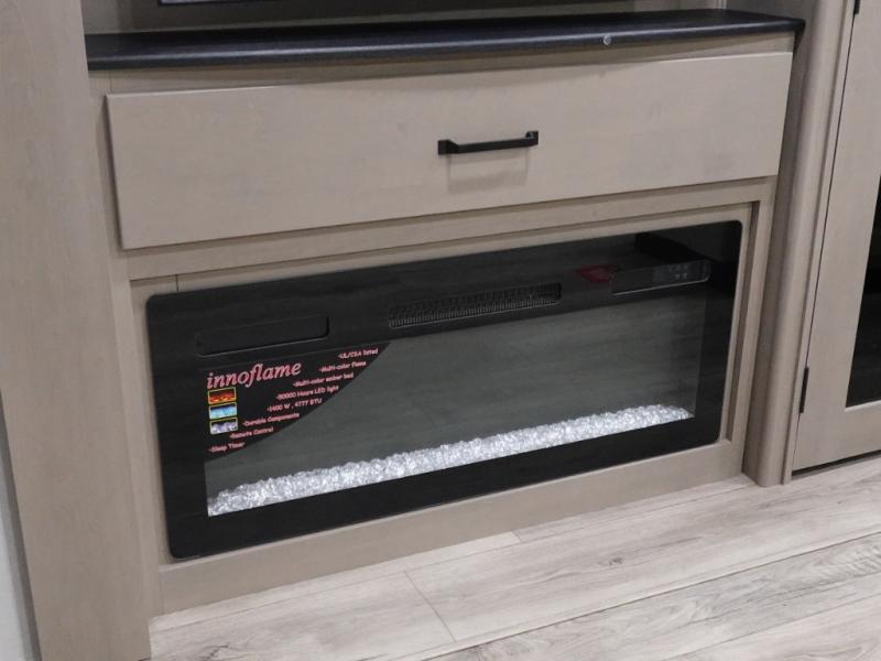 You can enjoy a spacious rear living area in this RV with dual opposing slides offering you entertainment, kitchen amenities, seating and windows for great views! The rear tri-fold sofa also converts into extra sleeping space for an extra guest or two, just like the booth dinette does. Yet you might like to add the swivel dinette option. There are theater seats to enjoy while you place your drinks in the cupholders and watch the entertainment center with a 40" LED HDTV and fireplace. The pantry is big enough to store your favorite snacks, and the kitchen island will make meal prepping easier, plus there is a 16 cu. ft. refrigerator to store any leftovers. The full bathroom has a 30" x 48" fiberglass shower and a linen closet to store your towels. The front private bedroom has a comfortable queen bed slide that can be switched out for the optional king bed, a dresser with overhead cabinets, and a full wall wardrobe that is prepped to add the optional washer and dryer so that you can extend your camping trip with clean clothes!