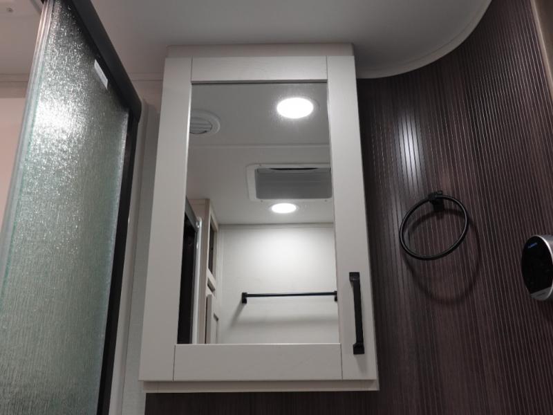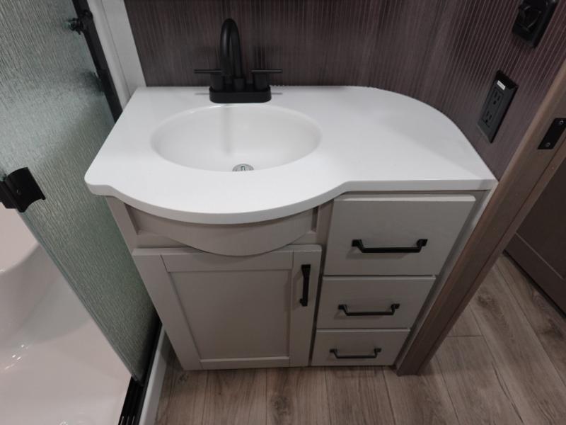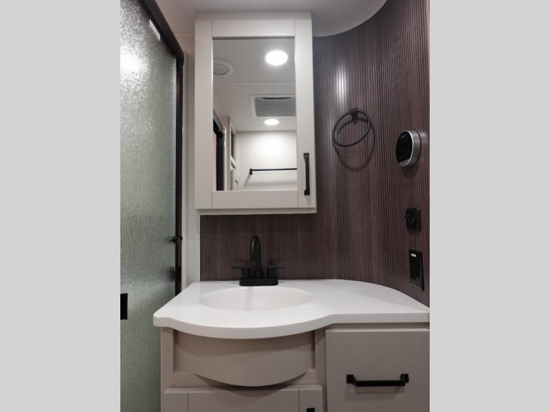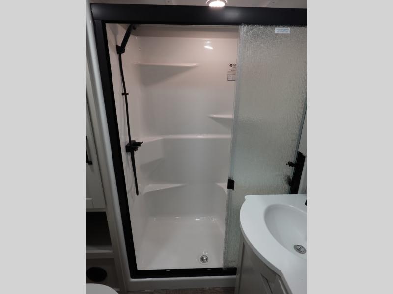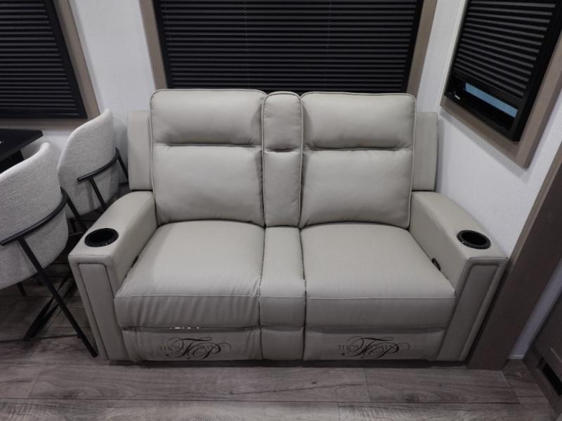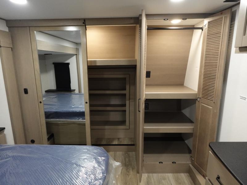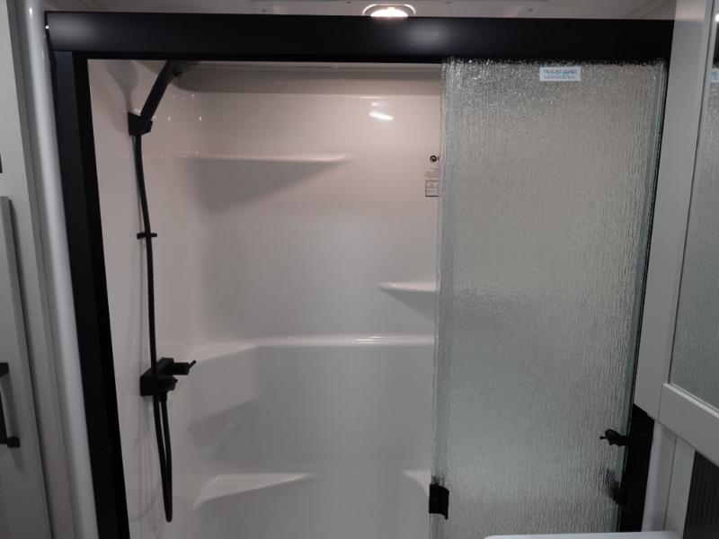You can enjoy a spacious rear living area in this RV with dual opposing slides offering you entertainment, kitchen amenities, seating and windows for great views! The rear tri-fold sofa also converts into extra sleeping space for an extra guest or two, just like the booth dinette does. Yet you might like to add the swivel dinette option. There are theater seats to enjoy while you place your drinks in the cupholders and watch the entertainment center with a 40" LED HDTV and fireplace. The pantry is big enough to store your favorite snacks, and the kitchen island will make meal prepping easier, plus there is a 16 cu. ft. refrigerator to store any leftovers. The full bathroom has a 30" x 48" fiberglass shower and a linen closet to store your towels. The front private bedroom has a comfortable queen bed slide that can be switched out for the optional king bed, a dresser with overhead cabinets, and a full wall wardrobe that is prepped to add the optional washer and dryer so that you can extend your camping trip with clean clothes!