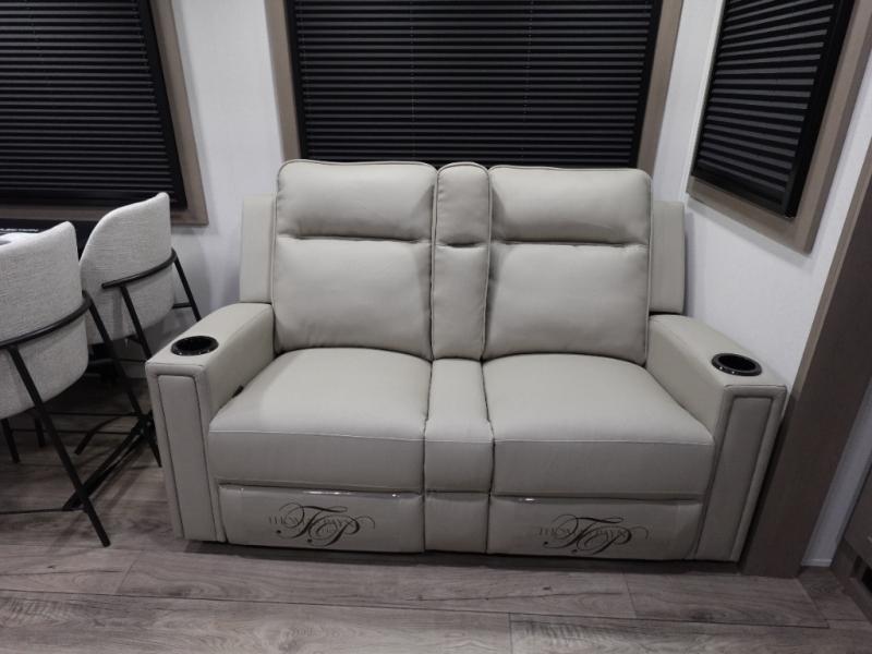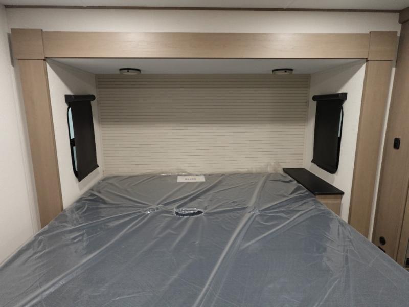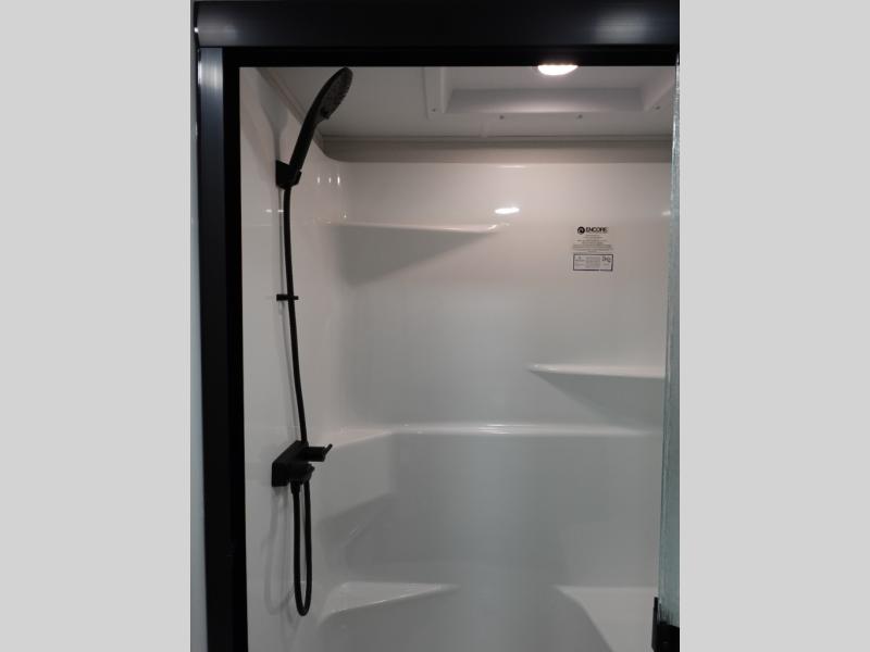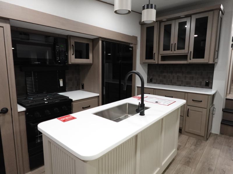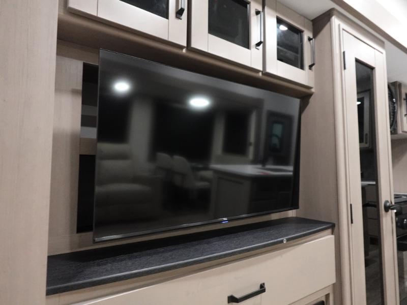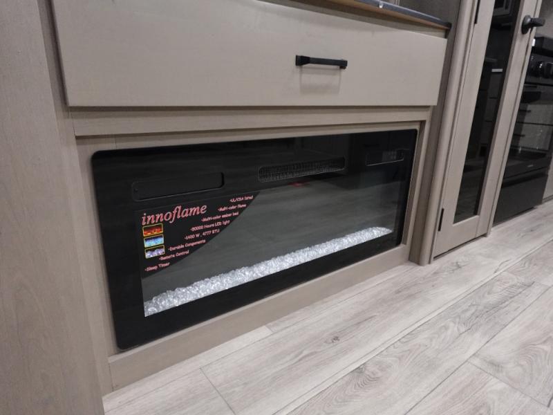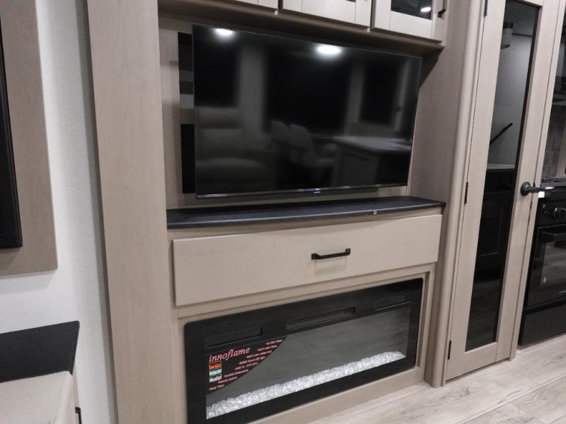 You can enjoy a spacious rear living area in this RV with dual opposing slides offering you entertainment, kitchen amenities, seating and windows for great views! There are theater seats to enjoy while you place your drinks in the cupholders and watch the entertainment center with a 40" LED HDTV and fireplace. The pantry is big enough to store your favorite snacks, and the kitchen island will make meal prepping easier, plus there is a 16 cu. ft. refrigerator to store any leftovers. The full bathroom has a 30" x 48" fiberglass shower and a linen closet to store your towels.