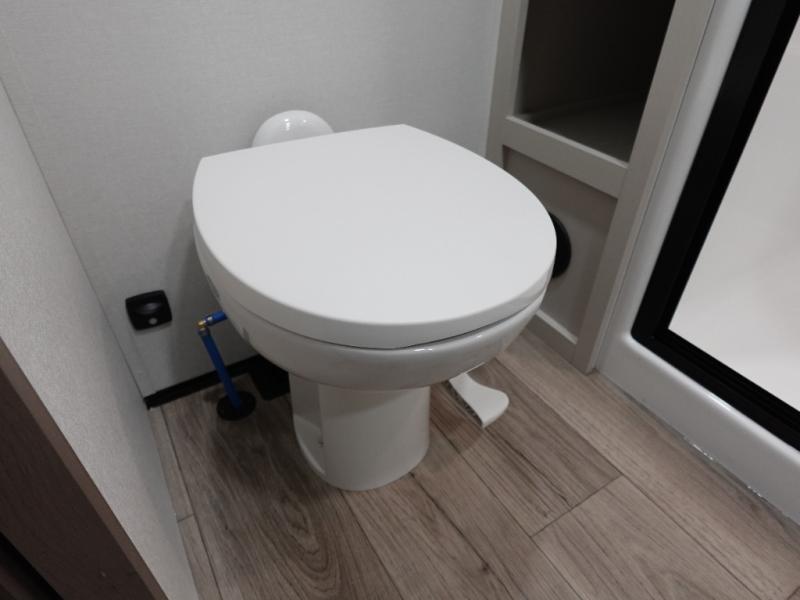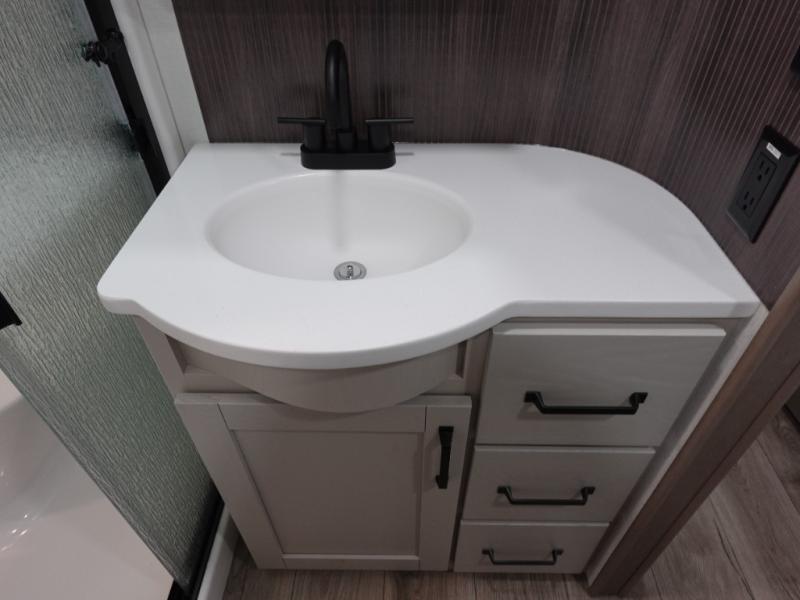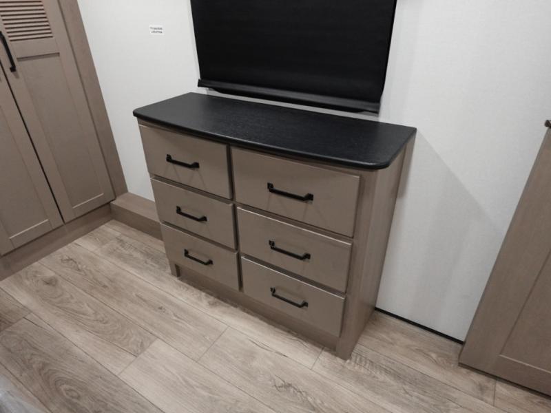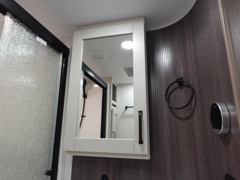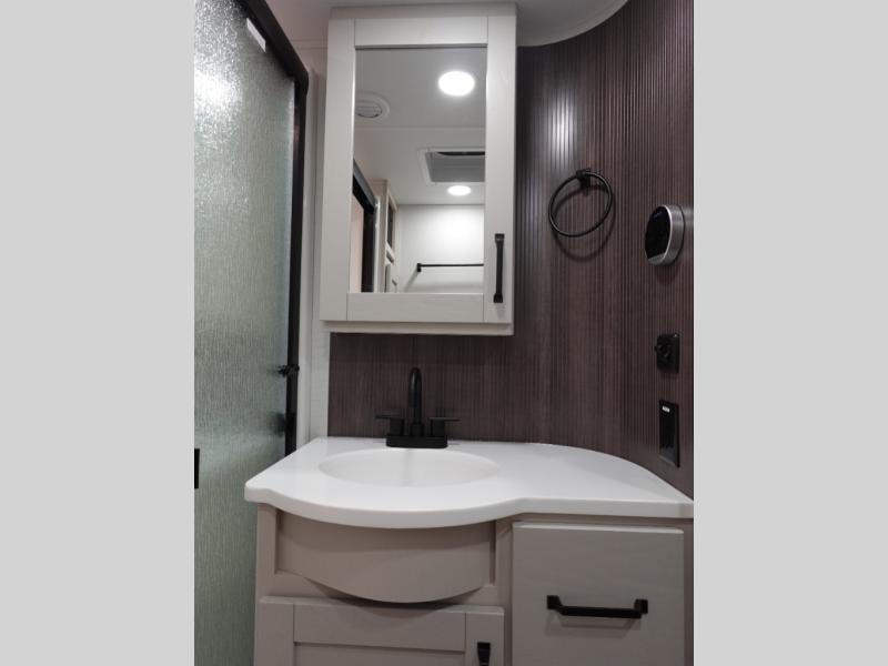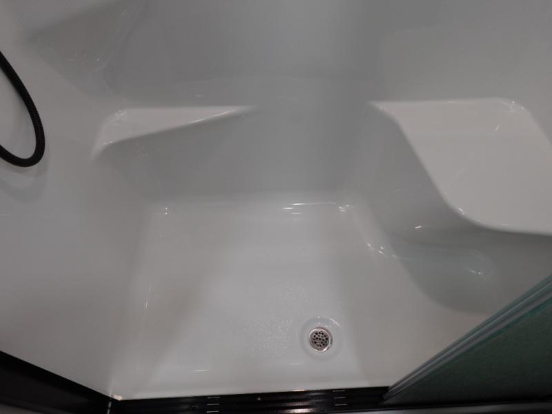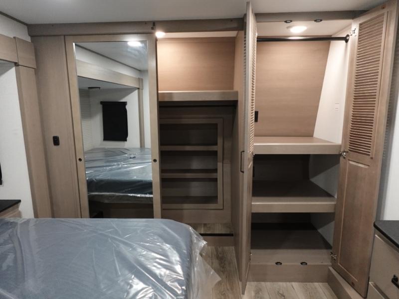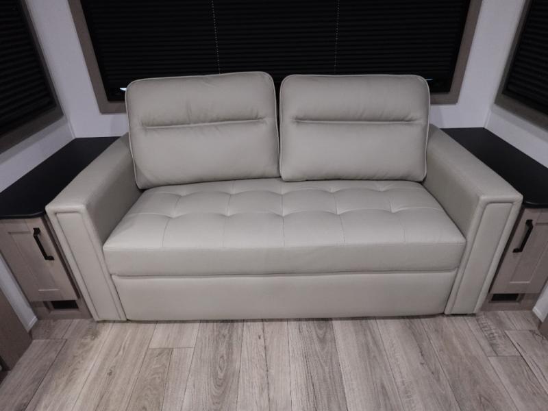 You can enjoy a spacious rear living area in this RV with dual opposing slides offering you entertainment, kitchen amenities, seating and windows for great views! There are theater seats to enjoy while you place your drinks in the cupholders and watch the entertainment center with a 40" LED HDTV and fireplace. The pantry is big enough to store your favorite snacks, and the kitchen island will make meal prepping easier, plus there is a 16 cu. ft. refrigerator to store any leftovers. The full bathroom has a 30" x 48" fiberglass shower and a linen closet to store your towels.