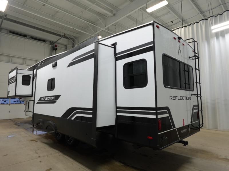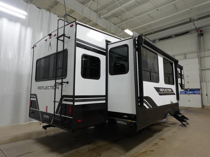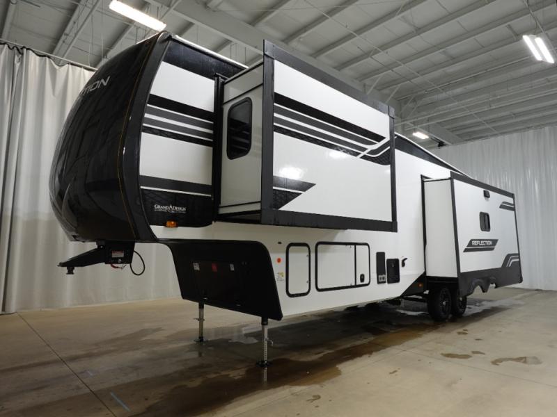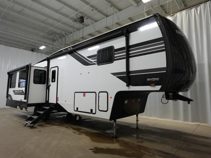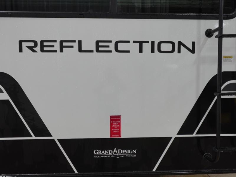 With any Reflection fifth wheel by Grand Design, you will have a solar panel for off-grid camping and a 60 amp charge controller and inverter prep, a Universal All-In-One docking station, unobstructed pass-through storage, and Goodyear Endurance tires. Each is constructed of gel coat exterior sidewalls, residential 5" truss rafters, walk-on roof decking, a fiberglass and radiant foil roof and front cap insulation plus laminated aluminum framed side walls, roof and end walls in slide rooms. Head inside to enjoy residential hardwood cabinet doors, premium Congoleum flooring, a spacious shower with a glass door, and many more comforts!